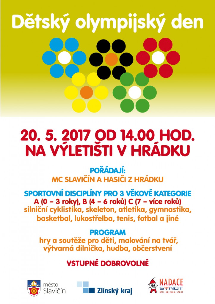 Dětský olympijský den nabízí sportovní disciplíny pro tři věkové kategorie dětí. Součástí je i doprovodný program soutěže, malování na obličej, hudba, občerstvení. Akce se koná na výletišti v Hrádku (místní část Slavičína).
