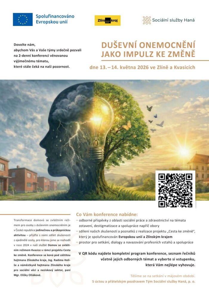 2 – denní konferenci věnovanou výjimečnému tématu, které stále čeká na naši pozornost. Transformace domovů se zvláštním režimem pro osoby s duševním onemocněním je v České republice jedinečnou a průkopnickou aktivitou – přijďte s námi sdílet zkušenosti z ojedinělé cesty, pro kterou jsme se rozhodli v roce 2024 v naší službě Domov se zvláštním režimem Kvasice v rámci projektu Cesta ke změně.