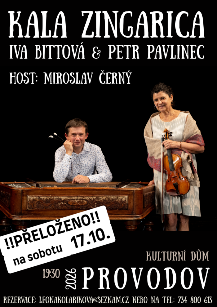 Milí přátelé a přátelé přátel, velmi nás těší, že po dvou letech přijede na Provodov opět skvělá Iva Bittová! Tentokrát vystoupí se stejně skvělým cimbalistou Petrem Pavlincem s jejich společný hudebním projektem Kala Zingarica. A také se můžete těšit na hosta Miroslava Černého. Srdečně vás zveme na jejich koncert.