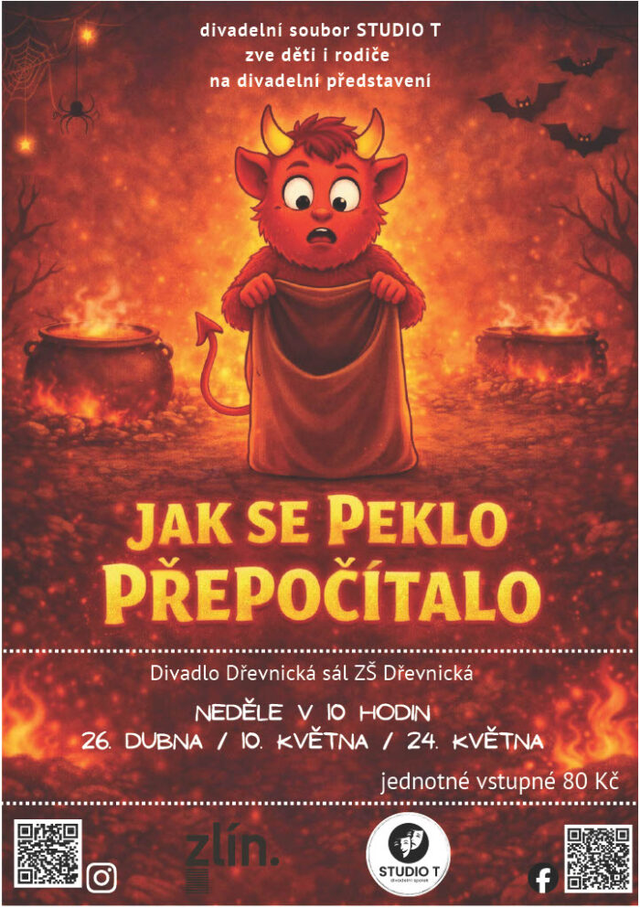 Divadelní spolek STUDIO T připravil nové představení pro děti. Jak to vypadá v pekle? Kdo se dostane z pekla ven? A koho čerti dostanou do kotle pro hlupáky? To všechno uvidíte v pohádce Jak se peklo přepočítalo.