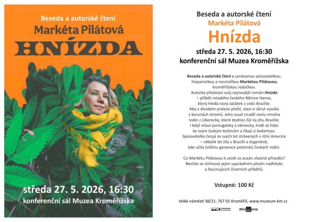 Beseda a autorské čtení s uznávanou spisovatelkou, hispanistkou a novinářkou Markétou Pilátovou, kroměřížskou rodačkou. Autorka představí svůj nejnovější román Hnízda – příběh mladého českého Němce Hanse, který hledá nový začátek v srdci Brazílie. Aby v divokém pralese přežil, staví si úkryt vysoko v korunách stromů. Jeho osud zrcadlí cestu mnoha rodin z Liberecka, které dodnes žijí na jihu Brazílie. I když mluví portugalsky a německy, hrdě se hlásí ke svým českým kořenům a říkají si bohemios. Autorka čerpá ze svých let strávených v Jižní Americe – několik let žila v Brazílii a Argentině, kde učila češtinu generace potomků českých rodin. Co Markétu Pilátovou k cestě za oceán vlastně přivedlo? Nechte se strhnout jejím vyprávěním plným nadhledu a fascinujících životních příběhů.