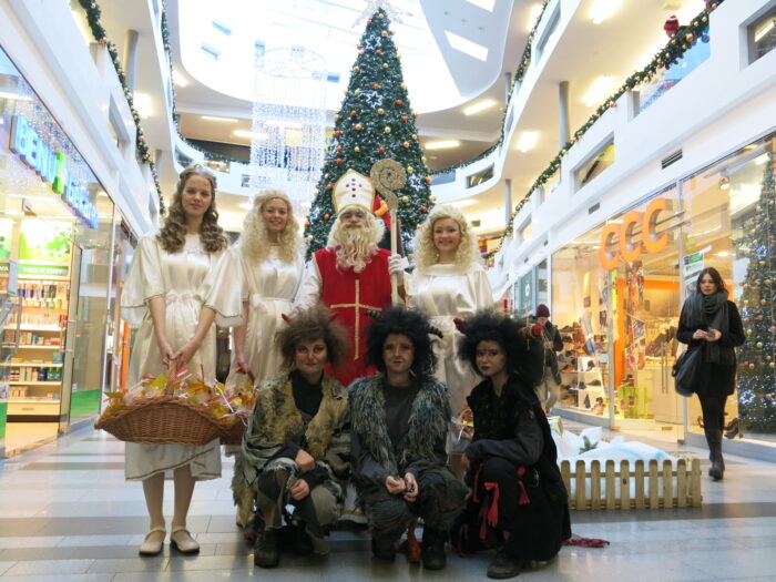 Mikulášská družina bude po celé odpoledne procházet prostory Zlatého jablka a rozdávat drobné balíčky dobrot včetně oblíbených pitíček Capri-sun všem dětem, které si připraví krátkou básničku nebo písničku.