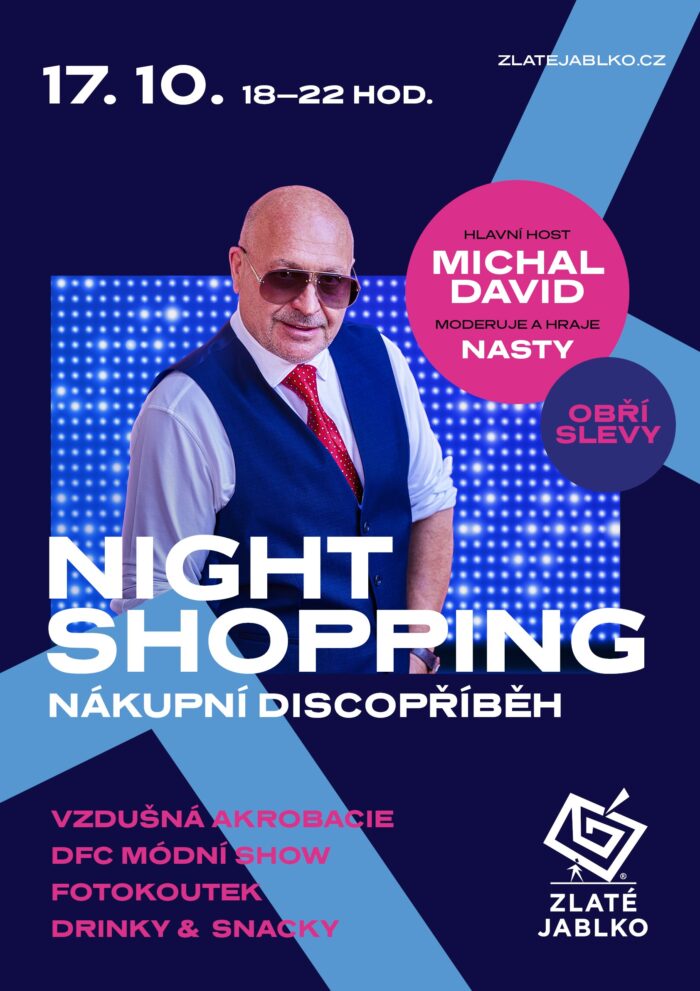 Legenda české pop music Michal David bude hlavní hvězdou letošního Night Shoppingu ve Zlatém jablku. V pátek 17. října ožije obchodní centrum ve Zlíně hudbou, módní show, akrobatickými vystoupeními a speciálními slevami napříč obchody. Večer plný zábavy a výhodných nákupů moderuje performer Nasty.