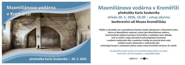 Přijďte se dozvědět více o památkově chráněné stavbě vybudované v klasicistním slohu, kterou je Maxmiliánův vodovod, známý jako Maxmiliánova vodárna. Karel Soukeník zajišťoval průzkum technického a statického stavu základů, jenž se změnil v objev původních technologických konstrukcí v podzemí vodárenské věže a podzemní chodby pro potrubí pitné vody. Uslyšíte mnoho zajímavého o vodárenské věži, technologii čerpání a zásobování pitnou vodou města Kroměříže od konce 16. století. Po přednášce bude možné se jít osobně podívat přímo na místo, které leží v ulici Na Kopečku, u koupaliště Bajda.