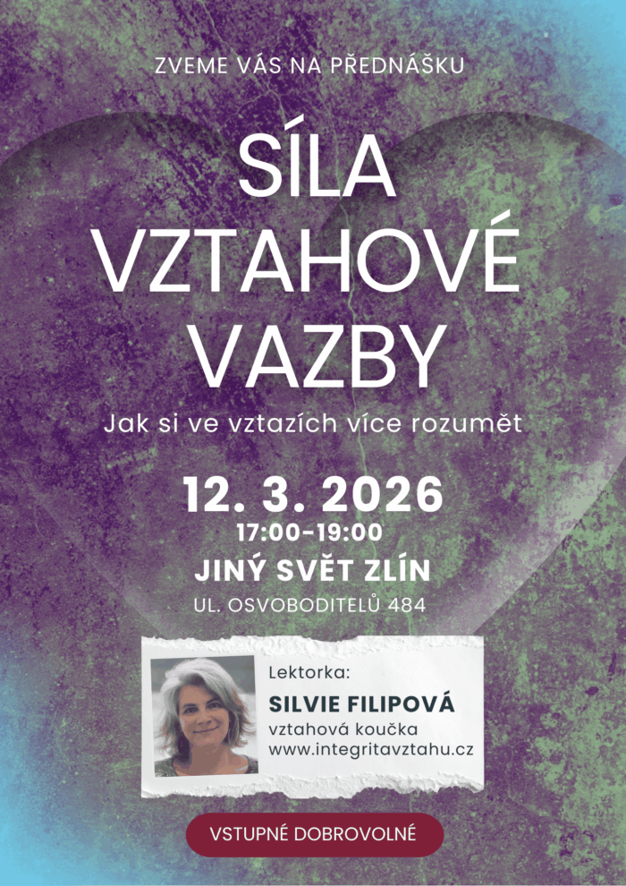 Na přednášce „SÍLA VZTAHOVÉ VAZBY“ srozumitelně nahlédneme do toho, jak naše rané dětské zkušenosti ovlivňují vztahy v dospělosti — vztahy partnerské, rodinné i vztah k nám samým.