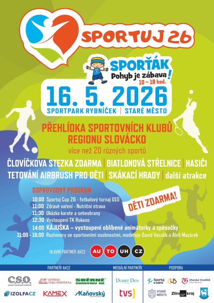 Sportpark Rybníček ve Starém Městě u Uherského Hradiště opět zve všechny děti a jejich rodiče na Sportuj 26 – akci, na které si mohou vyzkoušet více než dvacítku sportovních aktivit, a nejen to. Organizátoři připravili i bohatý doprovodný program a bude se pomáhat těm, kteří to potřebují.