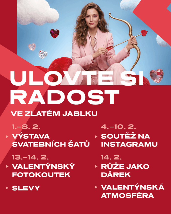 Prvních osm únorových dní zde bude k vidění výstava svatebních šatů, od 4. do 10. února pak proběhne soutěž na instagramovém profilu Zlatého jablka. Valentýnský fotokoutek pro zachycení zamilovaných okamžiků bude k dispozici v přízemí obchodního centra v pátek 13. a v sobotu 14. února. A v den svatého Valentýna potěší Zlaté jablko všechny návštěvnice růží, kterou dostanou jako malý dárek.