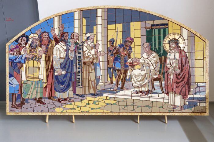 Výstava se soustředí na historii ikonografického a kompozičního řešení námětu i proces vzniku Köhlerovy mozaiky k 1. zastavení křížové cesty s názvem Pilátův soud. Akademický malíř Jano Köhler (1873-1941), spoluzakladatel Sdružení výtvarných umělců Moravských a představitel Katolické moderny, je autorem 12 obrazů křížové cesty na Svatém Hostýně, kde vytvořil unikátní technikou keramické řezané mozaiky mimořádný umělecký soubor evropského významu. Zlínské krajské galerii se podařilo před lety získat Köhlerovy vlastnoručně malované přípravné kartony k několika zastavením. V roce 2024 pak galerie získala nové keramické vyhotovení 1. zastavení vytvořené v rámci obnovy křížové cesty na Hostýně restaurátory Vojtěchem Paříkem a Passionarií Parik, kteří jsou v současnosti zřejmě jediní na světě, kdo tuto technologii ovládá. Proto je výstava zaměřena právě na 1. zastavení křížové cesty.