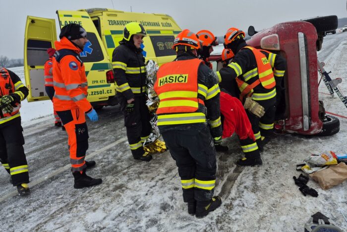 Náročný zásah hasičů v Kroměříži: Z převráceného vozidla museli řidiče vyprostit zadními dveřmi