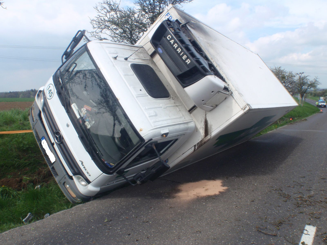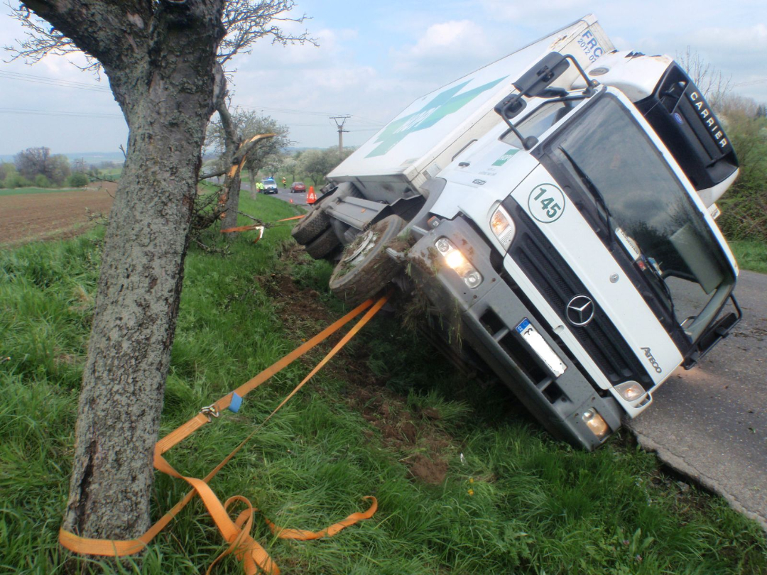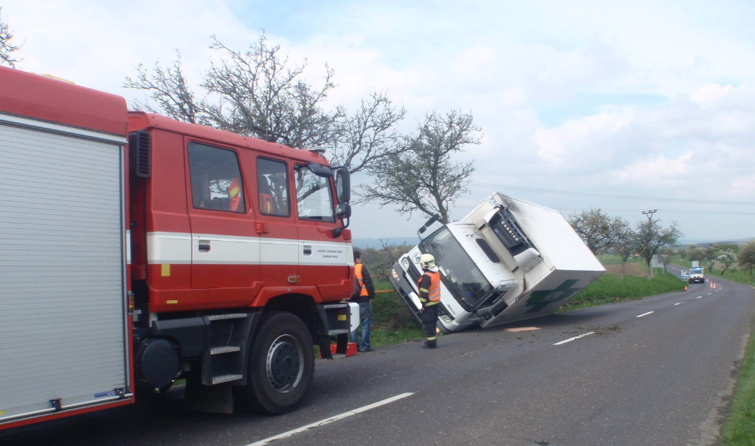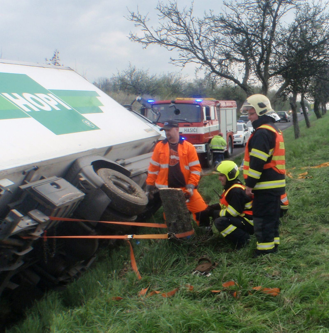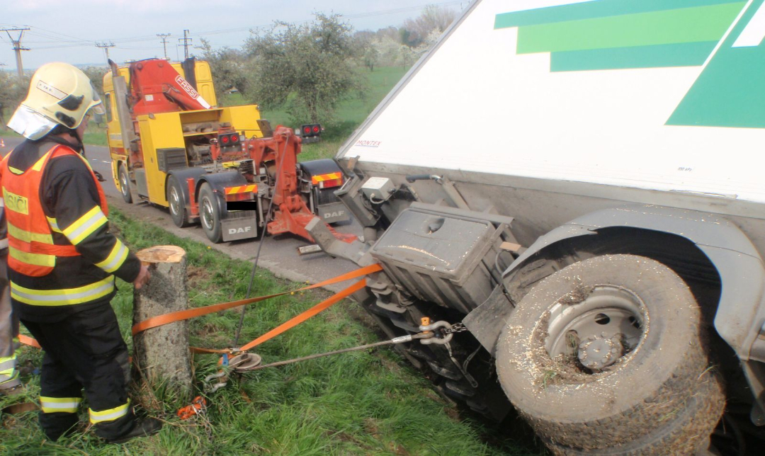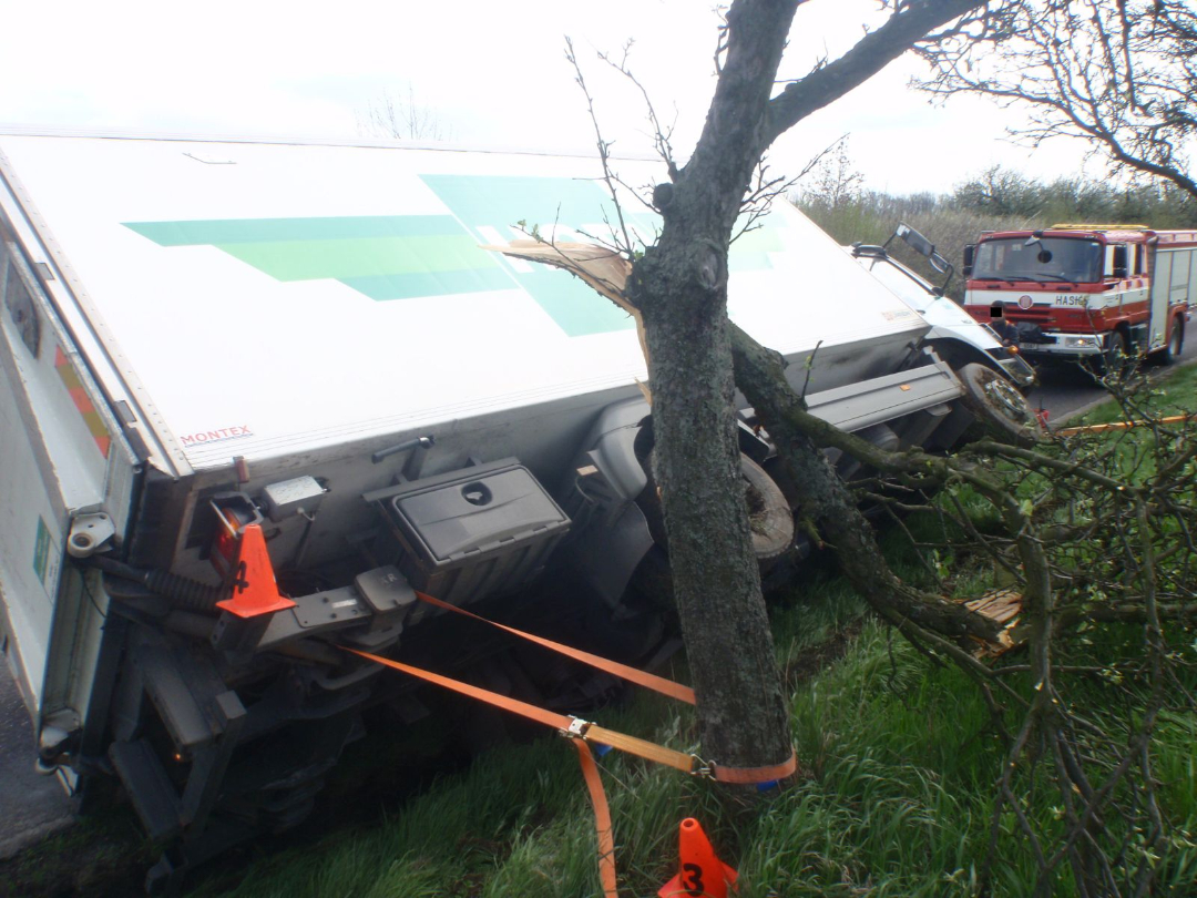Fotogalerie - Kvůli vyproštění kamionu museli hasiči pokácet strom