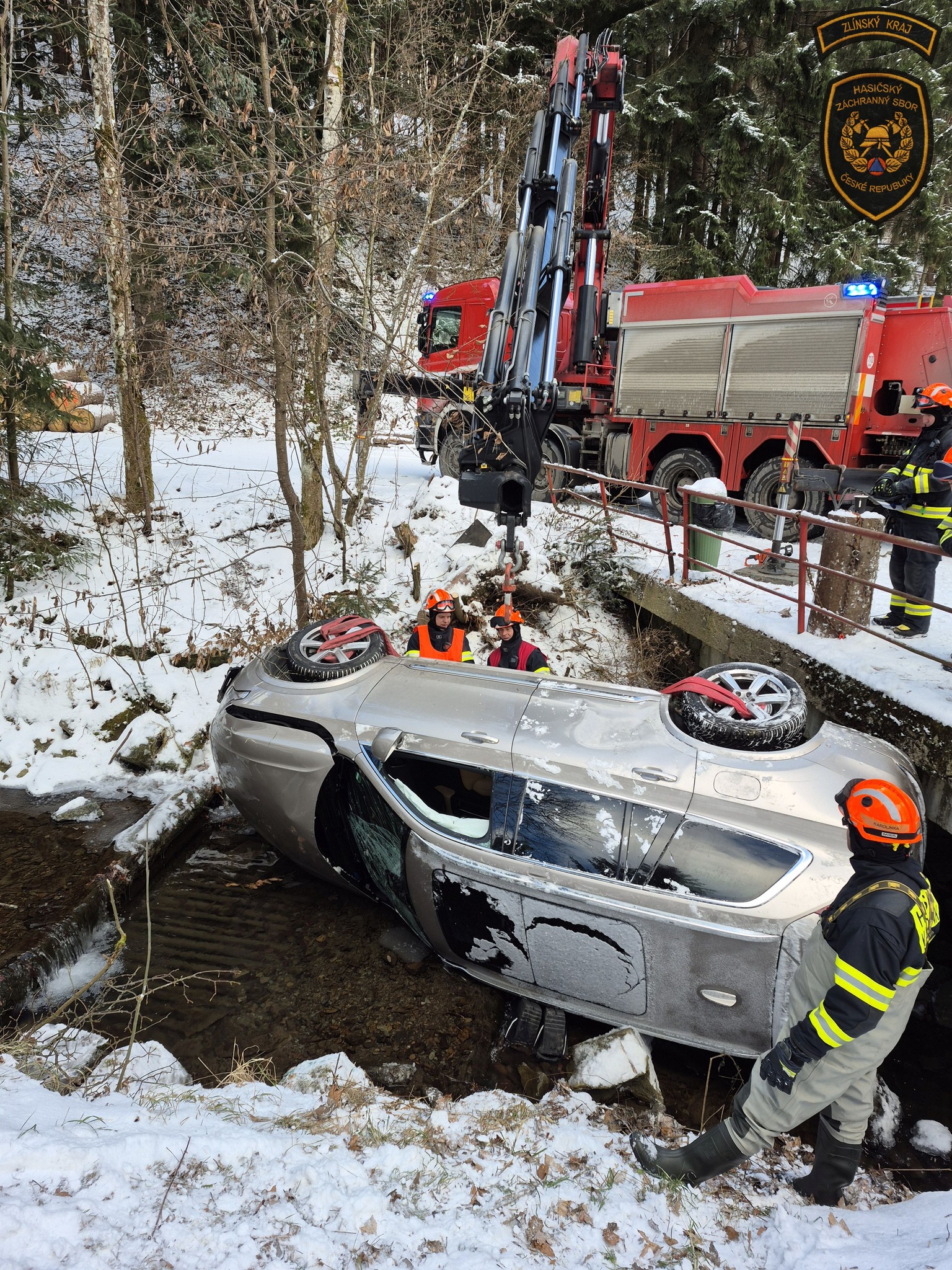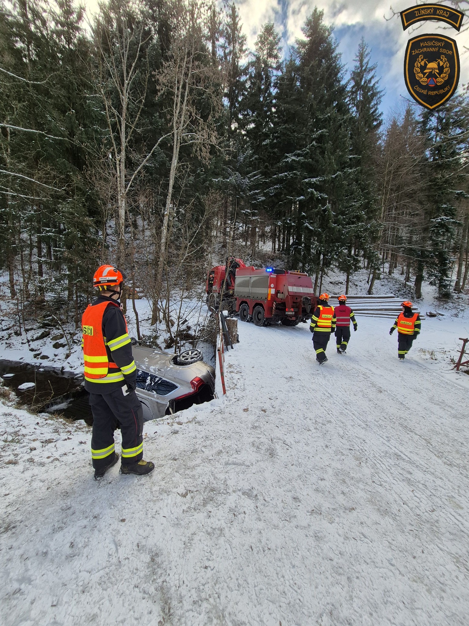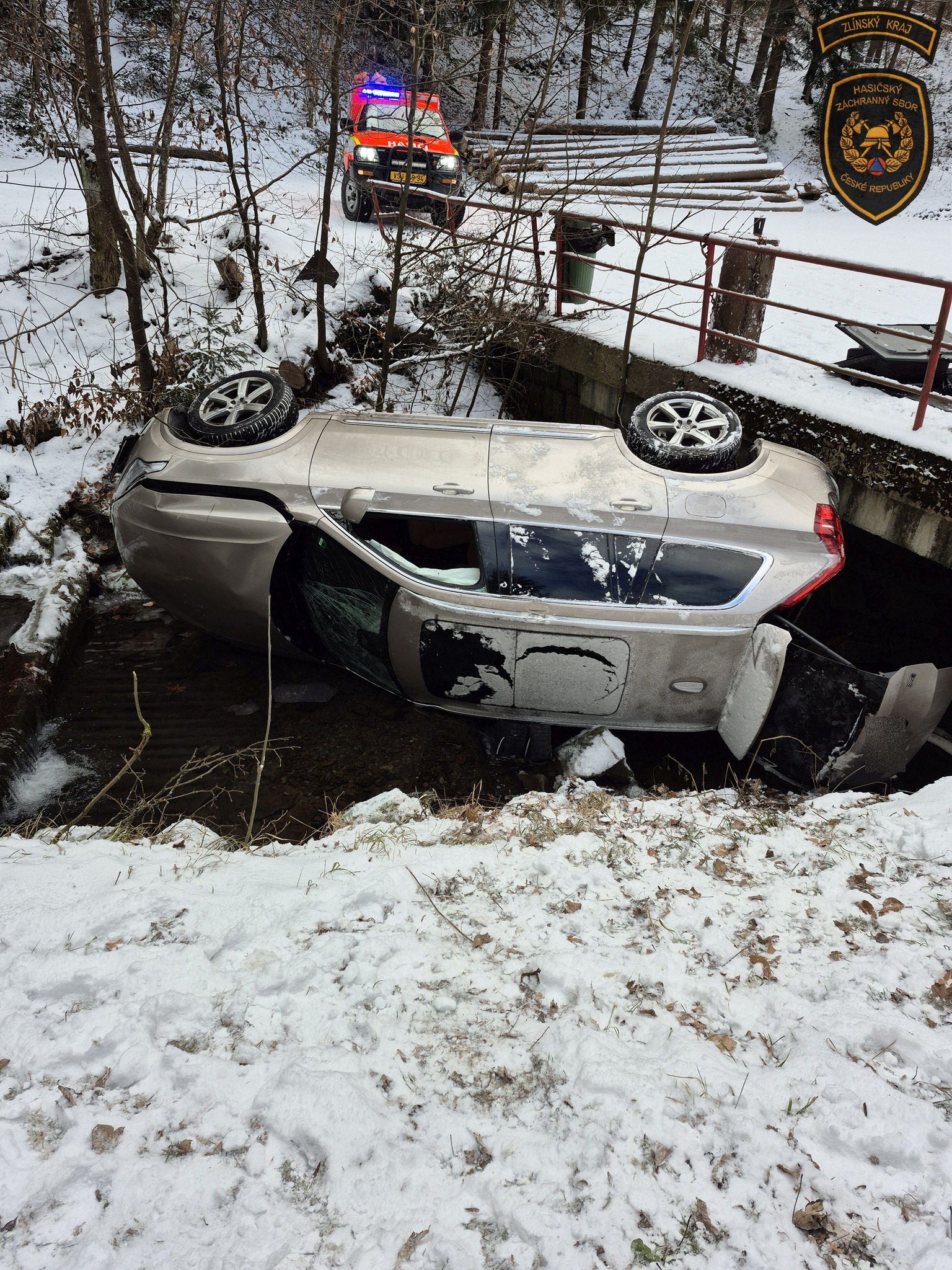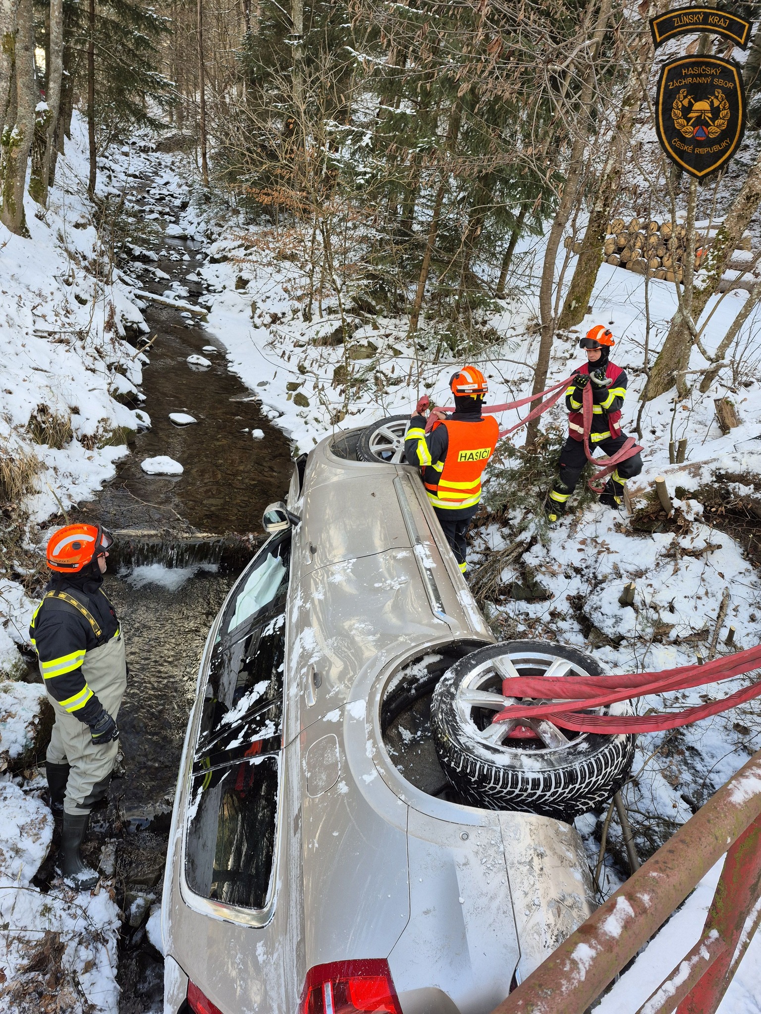 Řidička sjela do koryta potoka. Z vraku se dostala vlastními silami a jako zázrakem vyvázla bez zranění. Foto: HZS Zlínského kraje