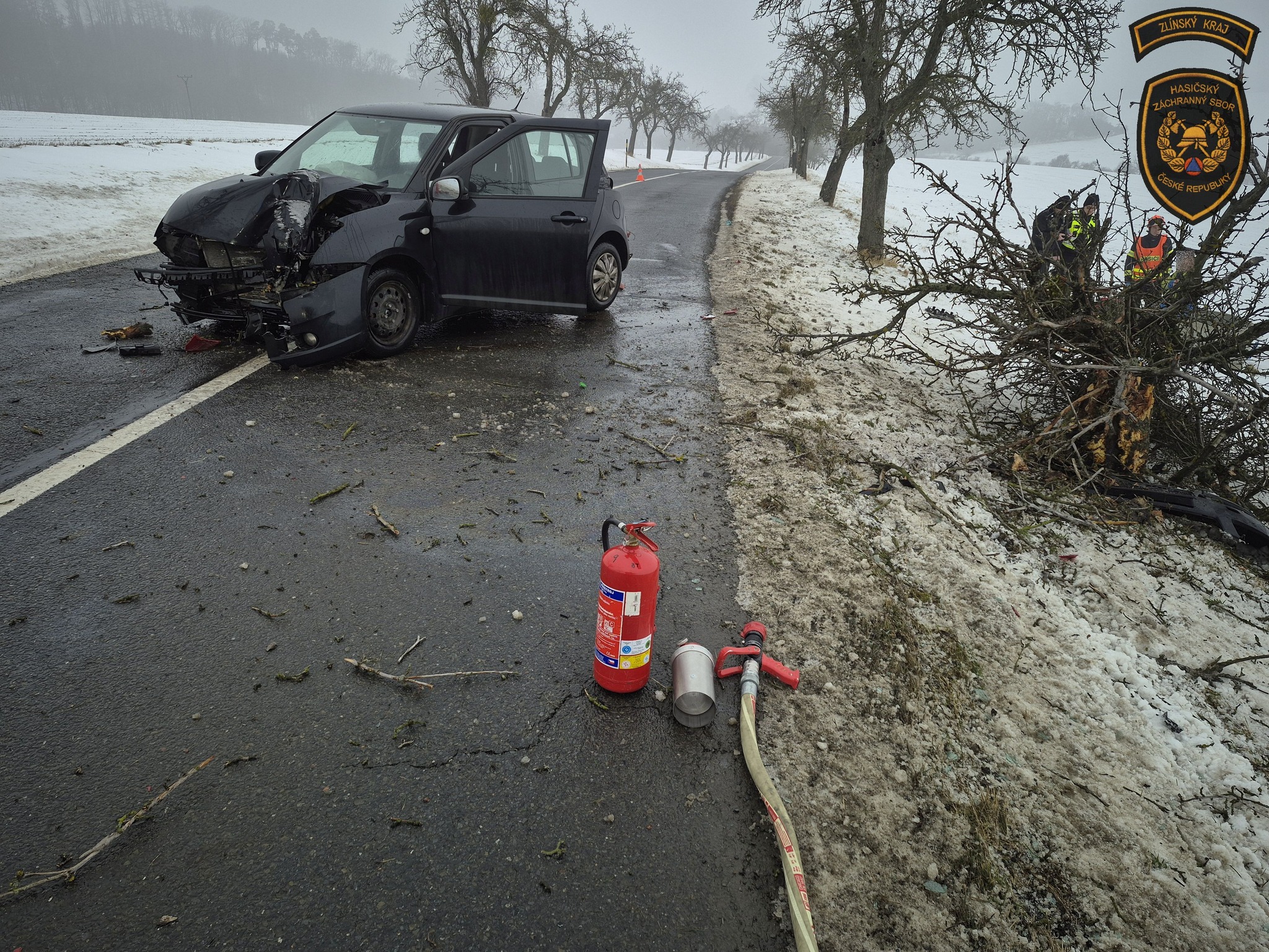 Řidič sjel ze silnice a naboural do stromu, ten se silným nárazem zlomil. Foto: HZS ZK