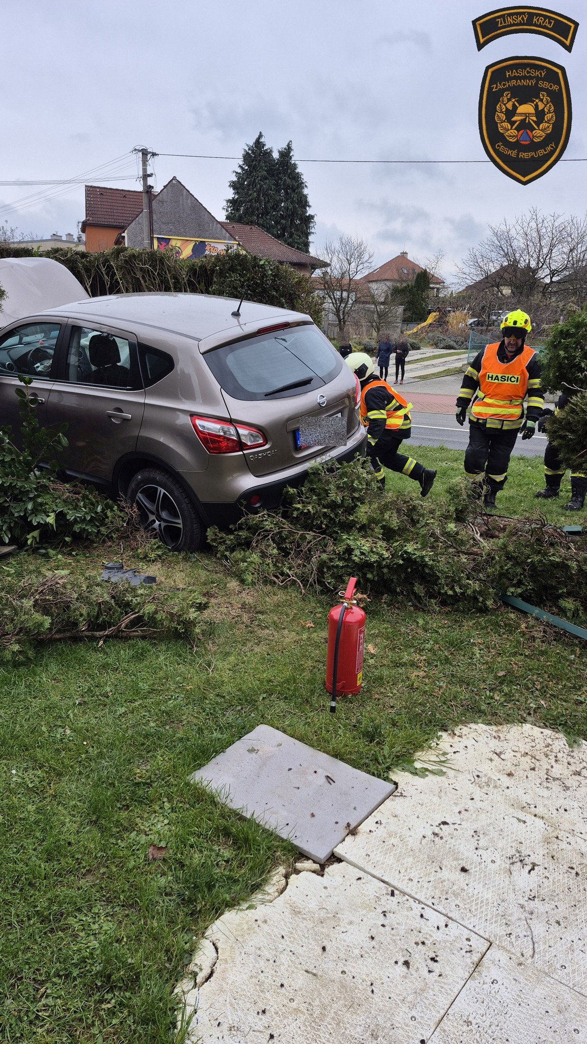 Řidič vozidla sjel ze silnice a s automobilem skončil v zahradě rodinného domu, kde narazil do stromu. Foto: HZS ZK
