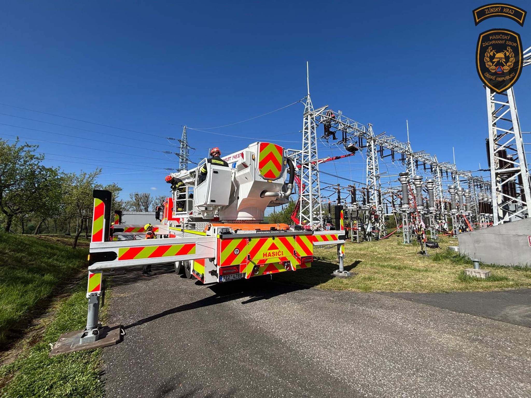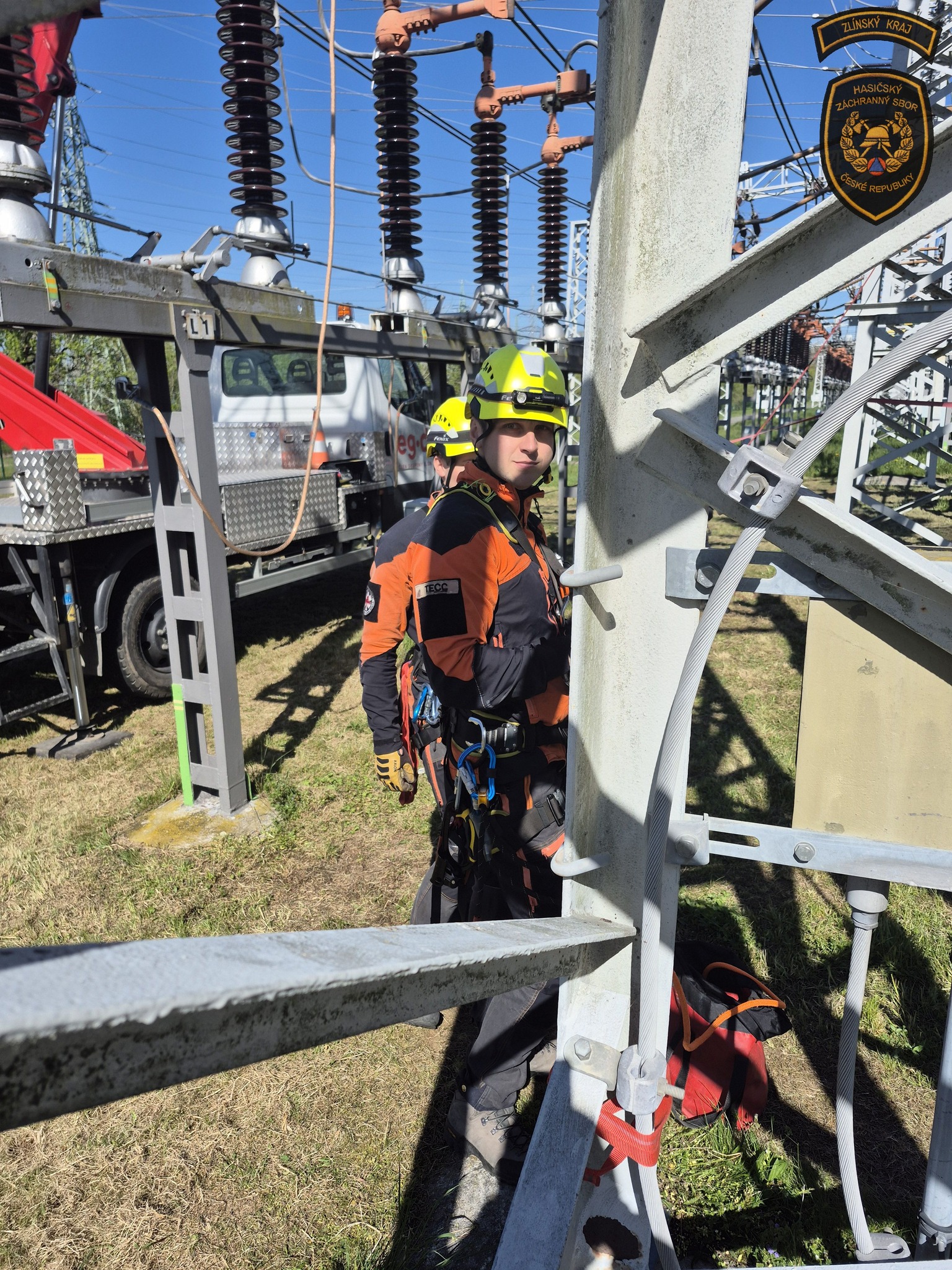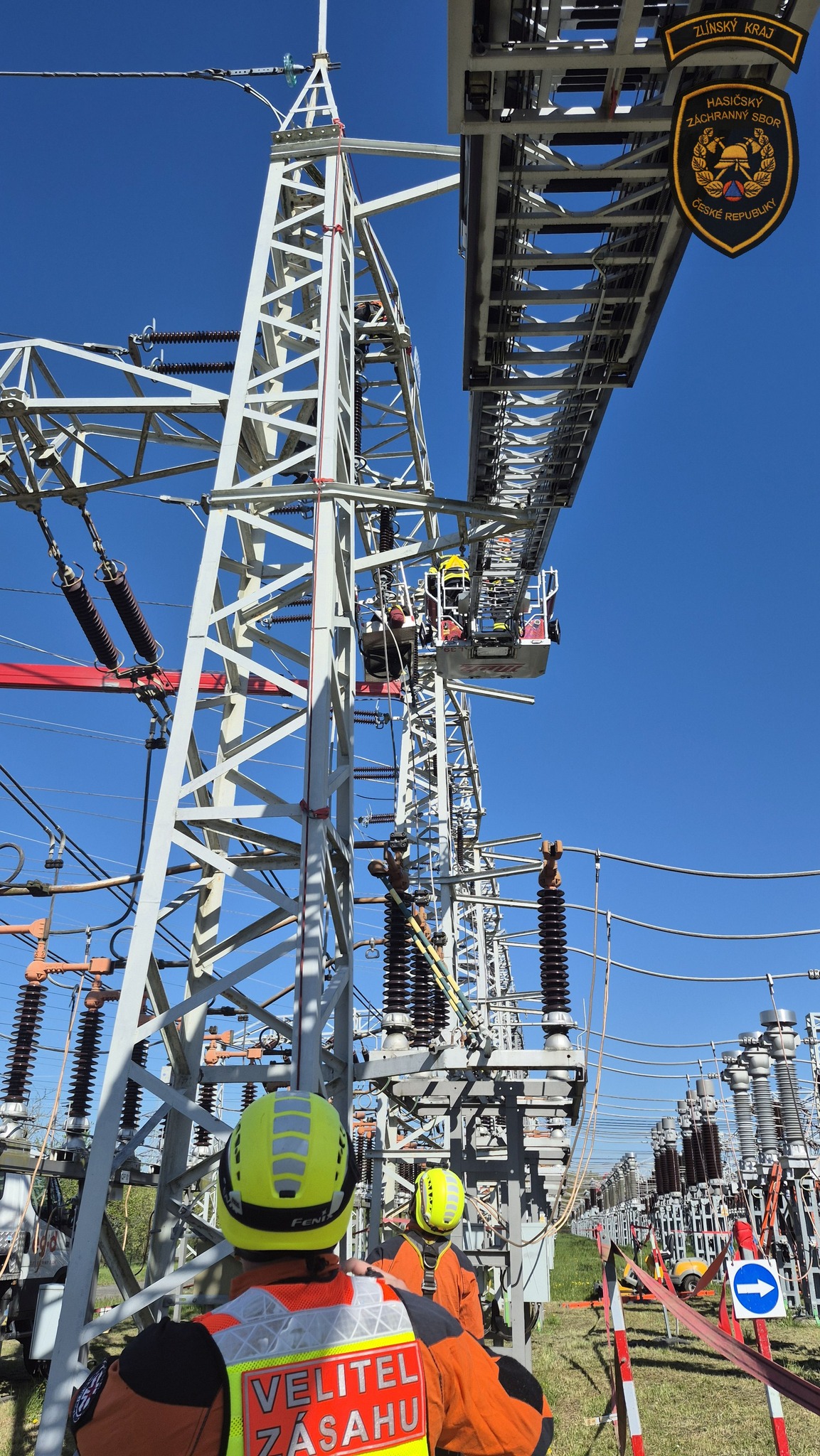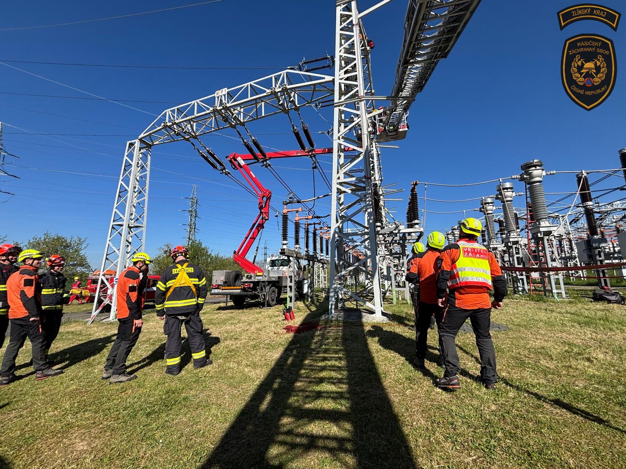 Hasiči v areálu otrokovické rozvodny trénovali jeden z nejnáročnějších zásahů - záchranu osob v prostředí vedení velmi vysokého napětí. Foto: HZS Zlínského kraje