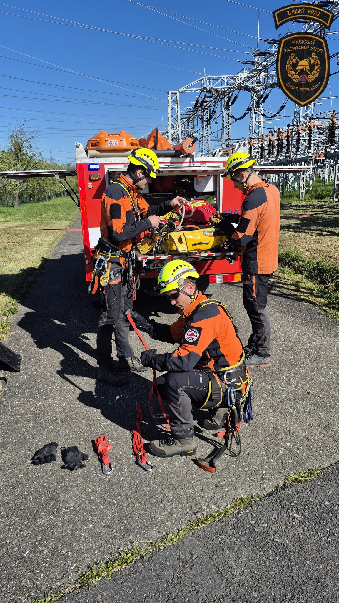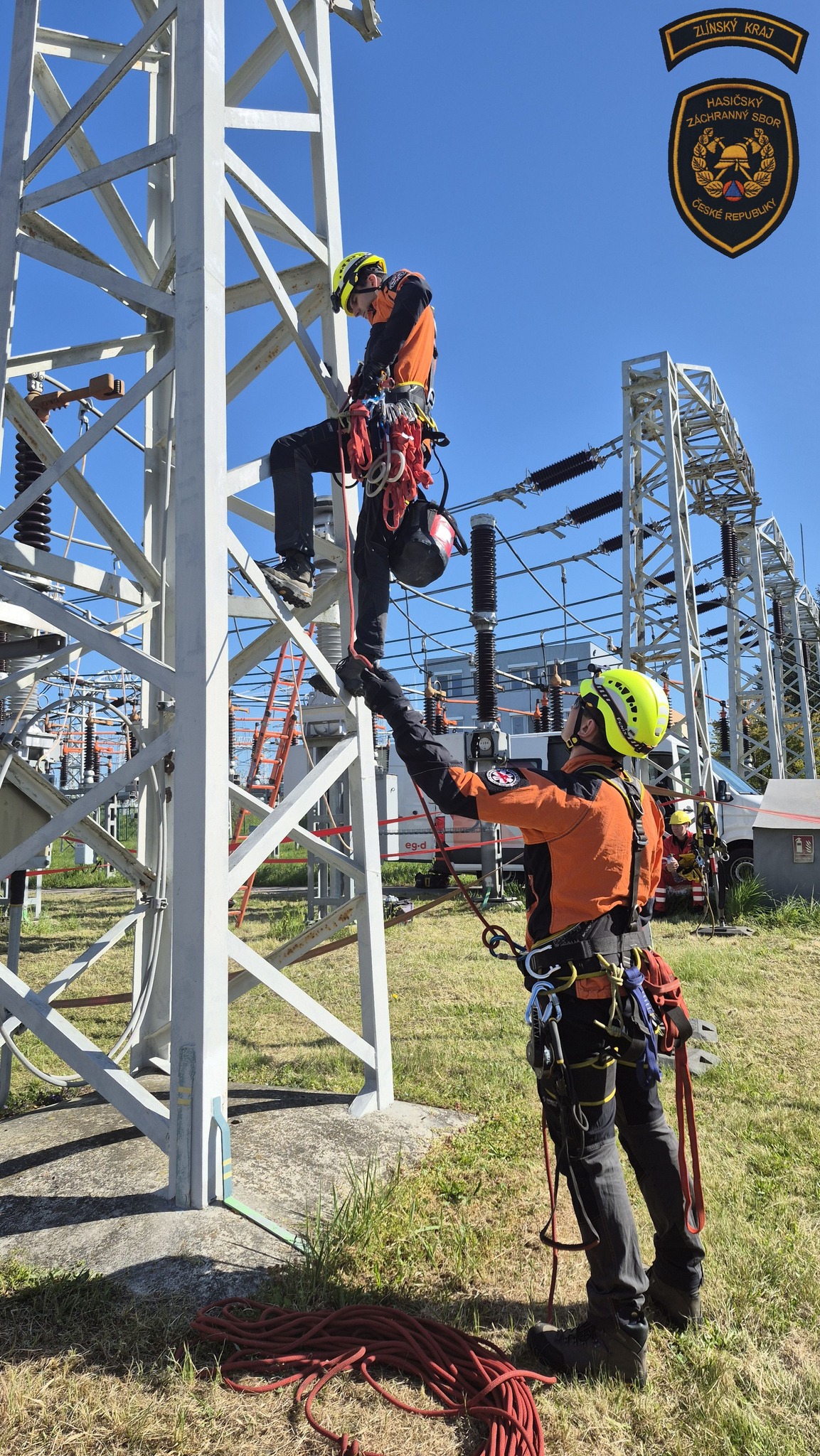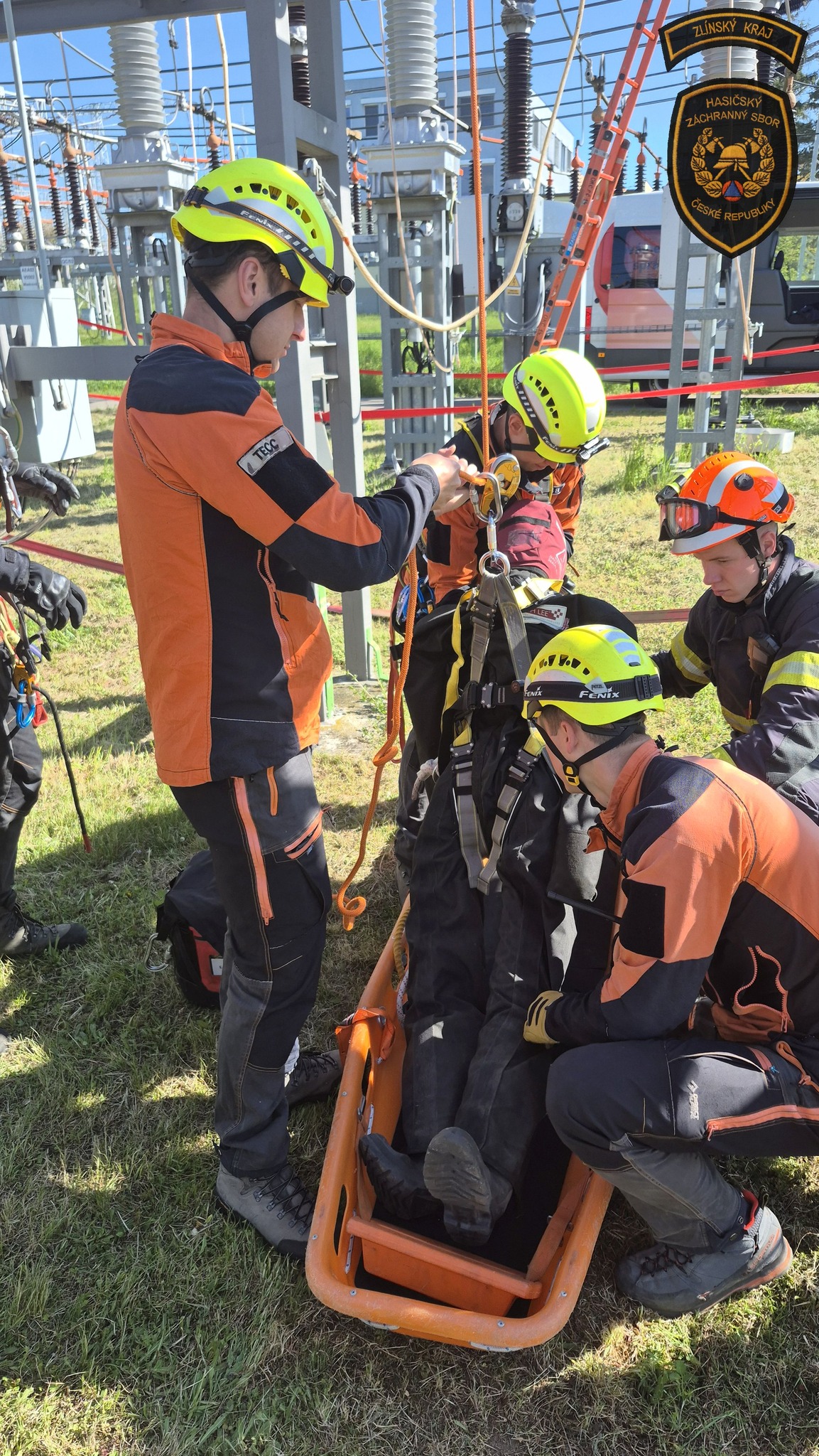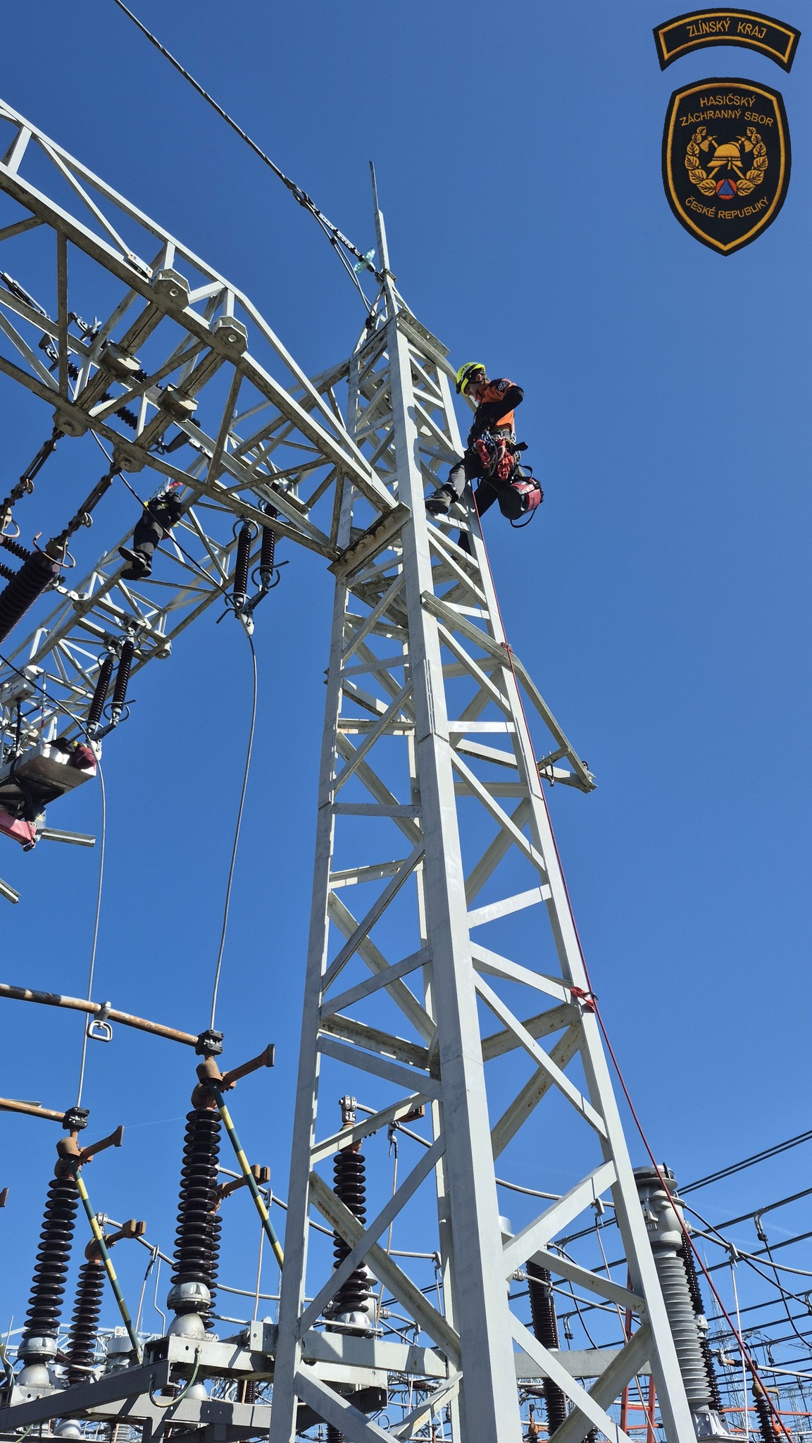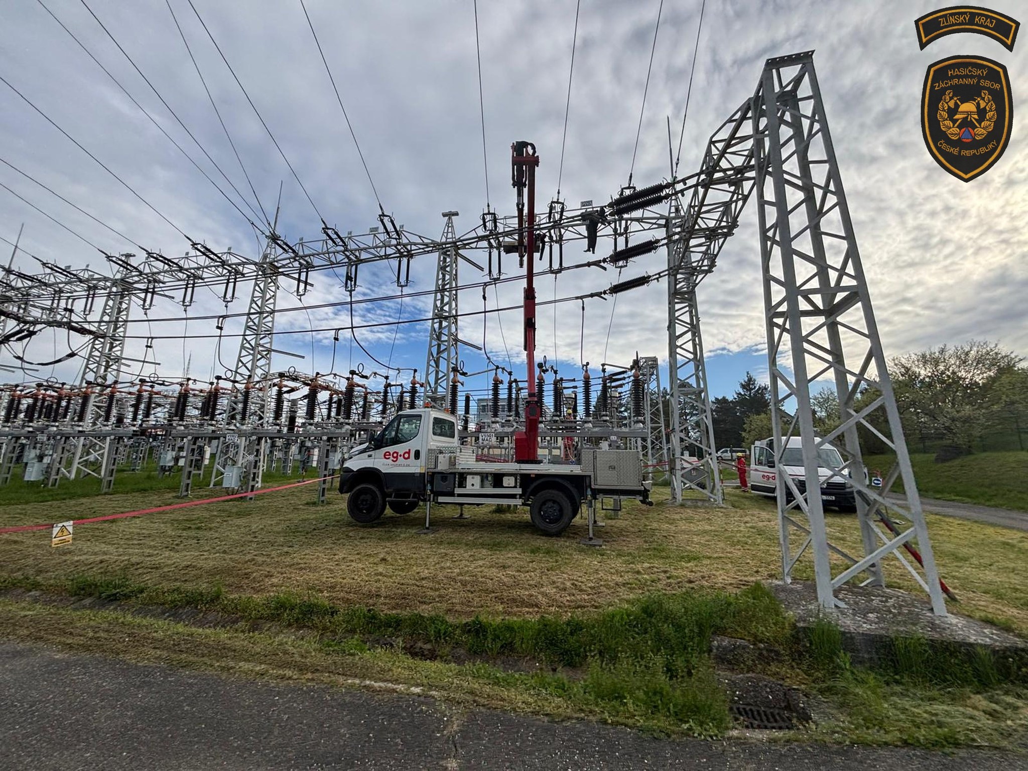 Hasiči v areálu otrokovické rozvodny trénovali jeden z nejnáročnějších zásahů - záchranu osob v prostředí vedení velmi vysokého napětí. Foto: HZS Zlínského kraje