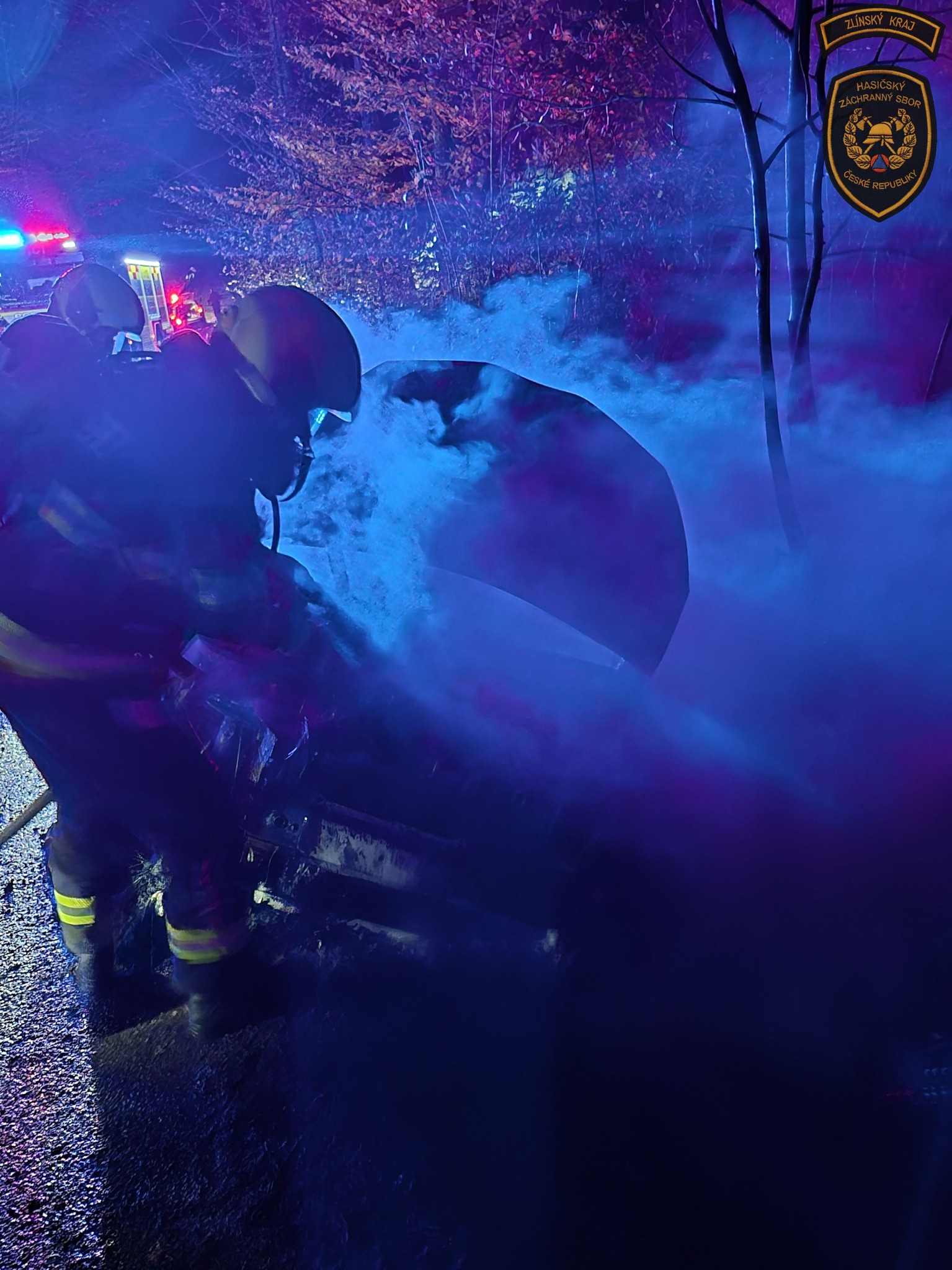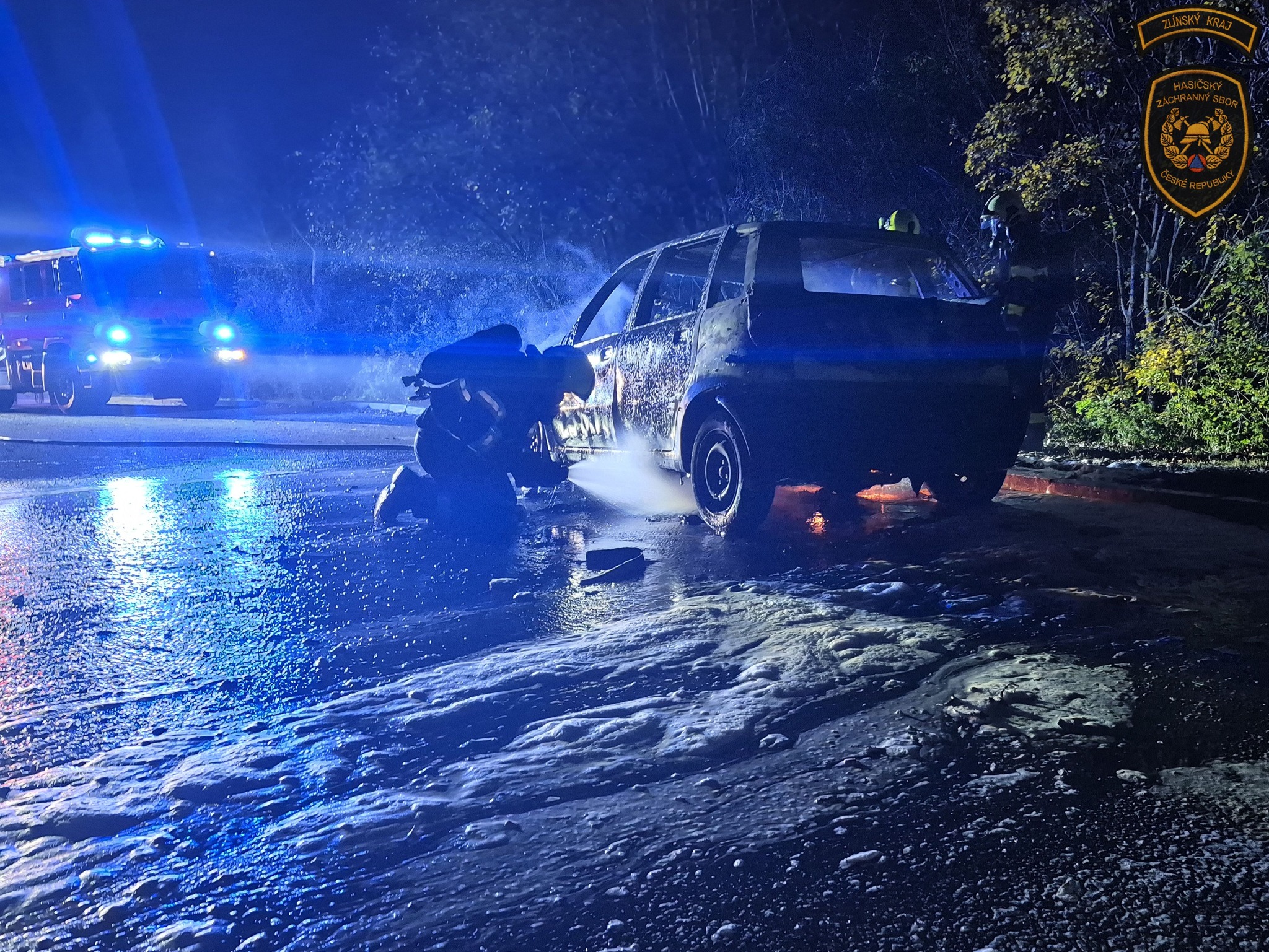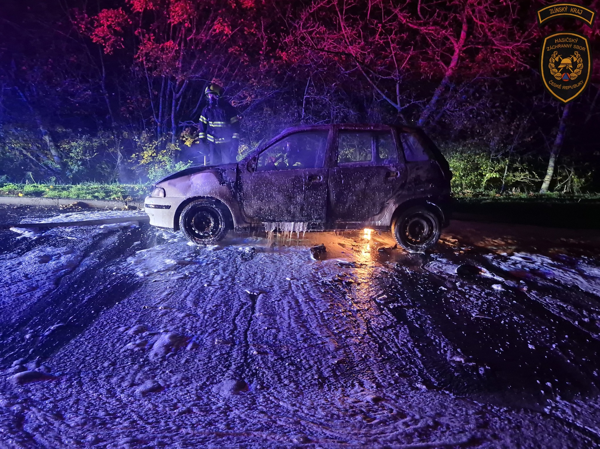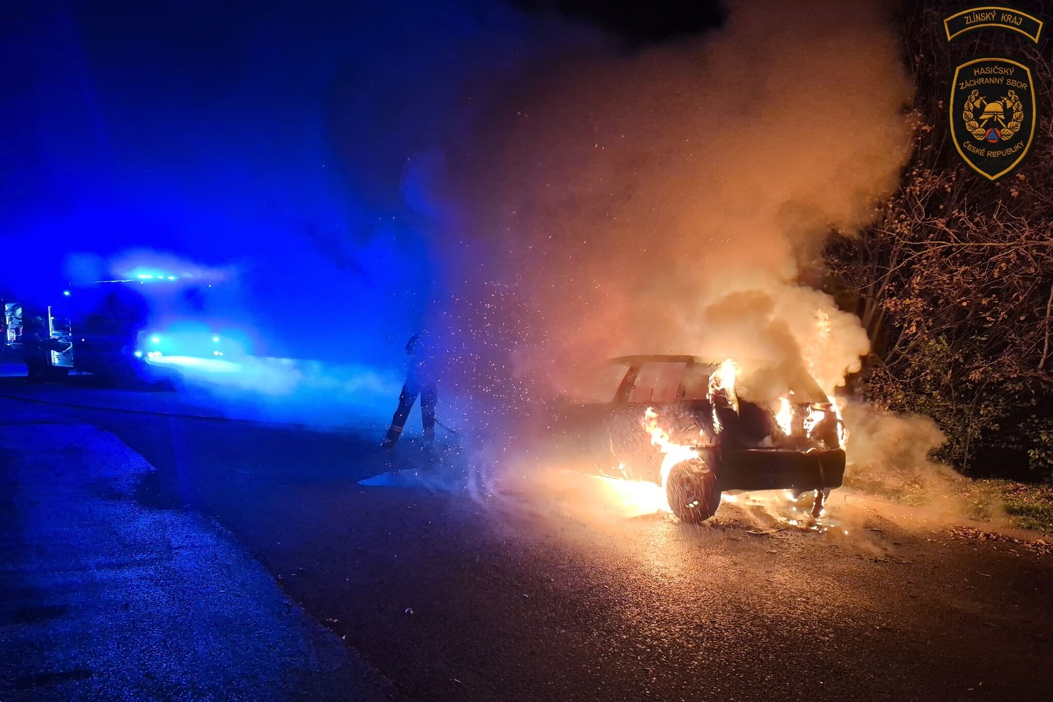 V rozmezí necelé hodiny vyjížděli hasiči hned ke dvěma požárům aut. Tomu u Fryštáku předcházela dopravní nehoda. Foto: HZS Zlínského kraje