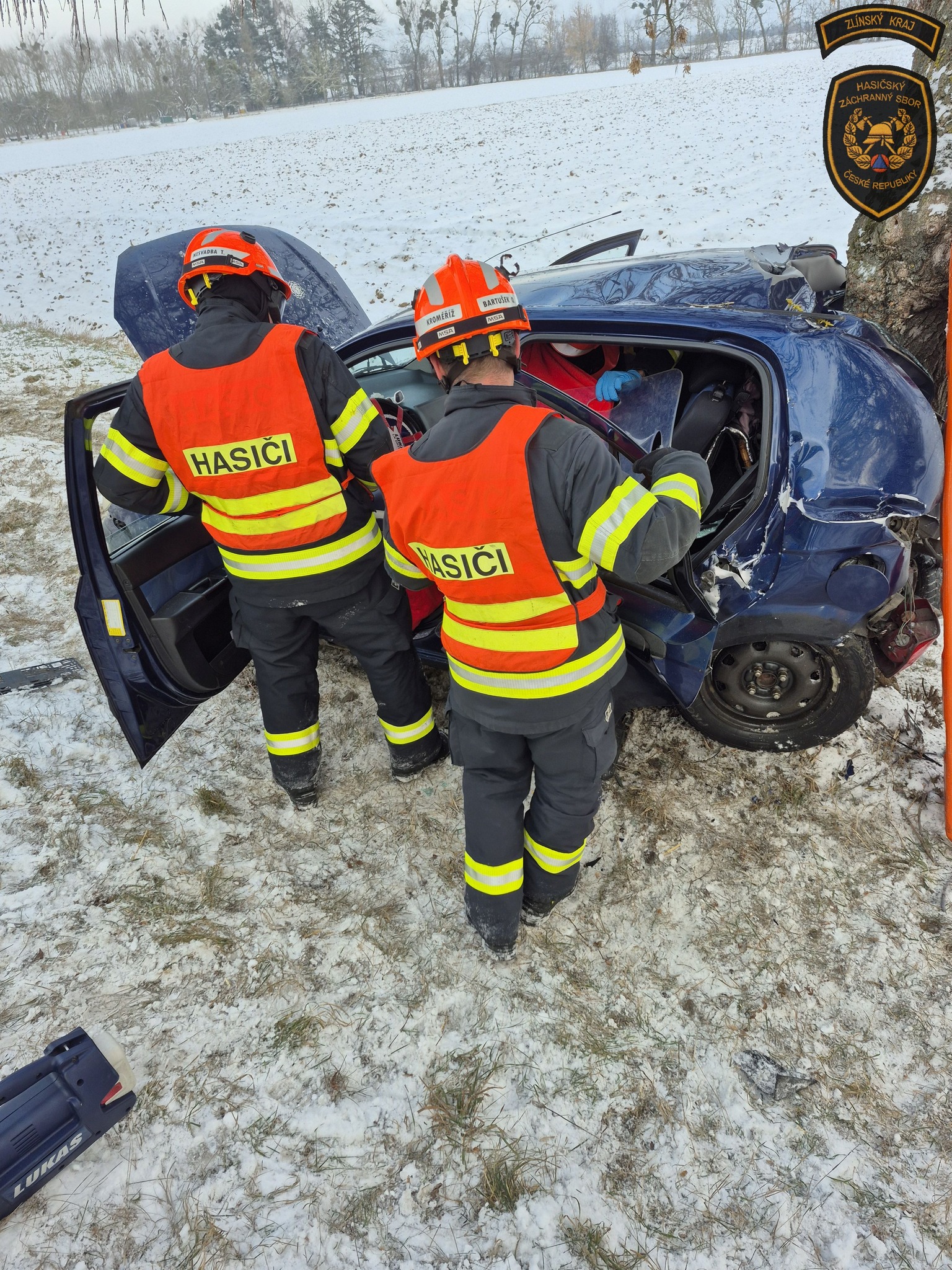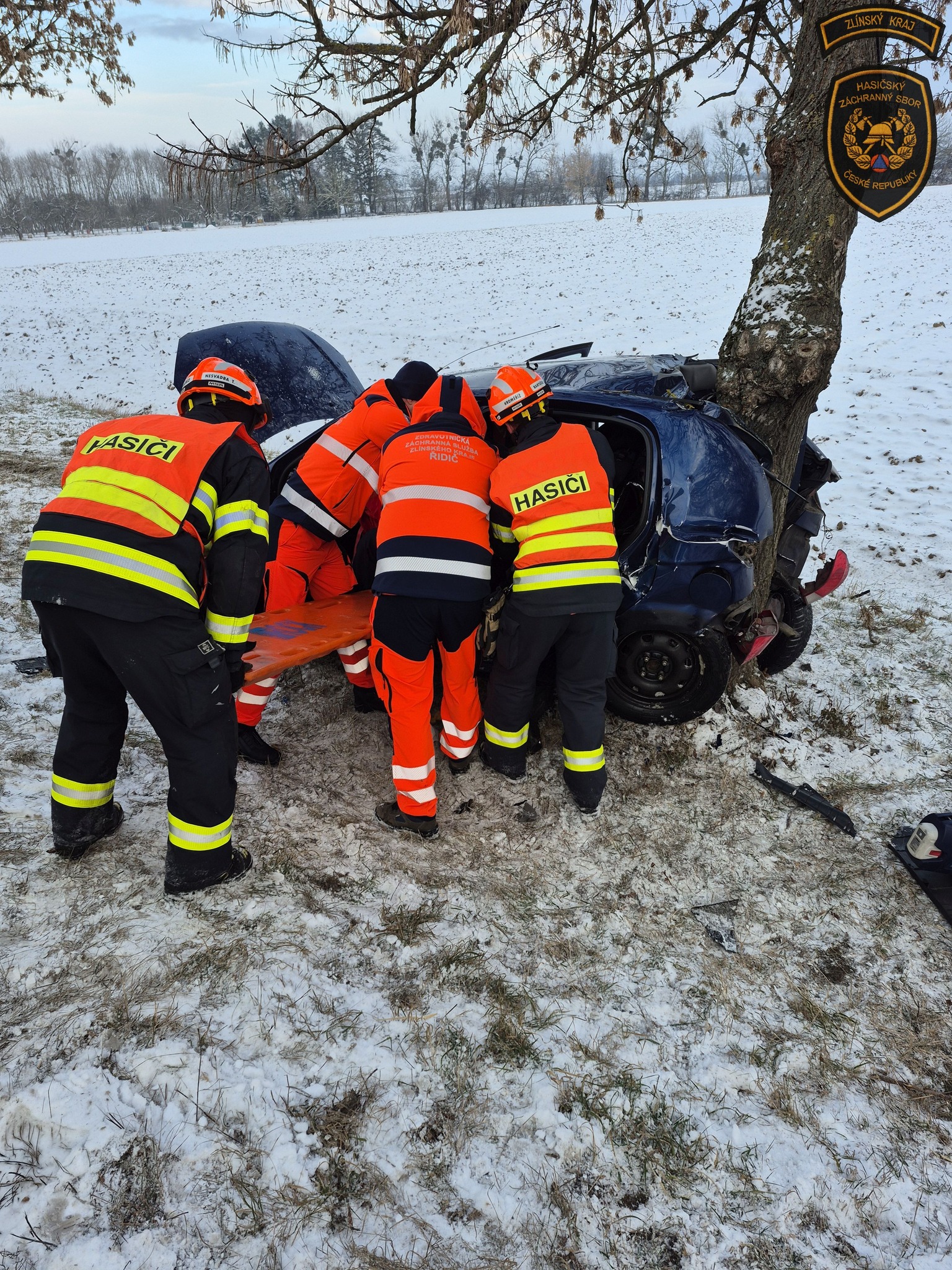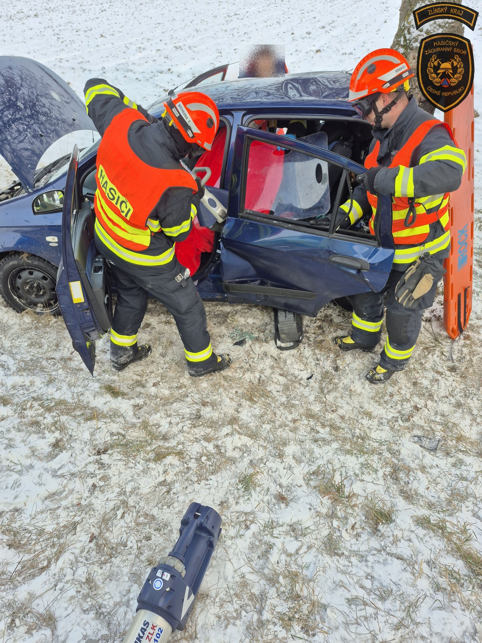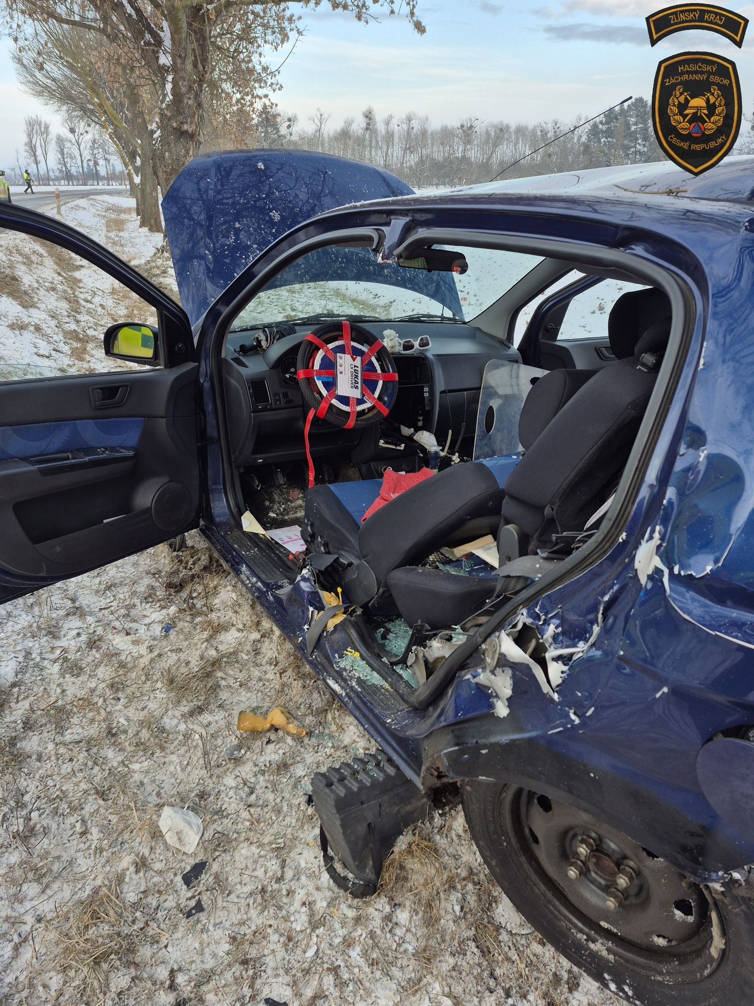 Řidička při nehodě utrpěla zranění a navíc zůstala zaklíněná v havarovaném autě. Její čtyřnohý spolucestující ovšem jako zázrakem vyvázl bez jediného škrábnutí. Foto: HZS Zlínského kraje