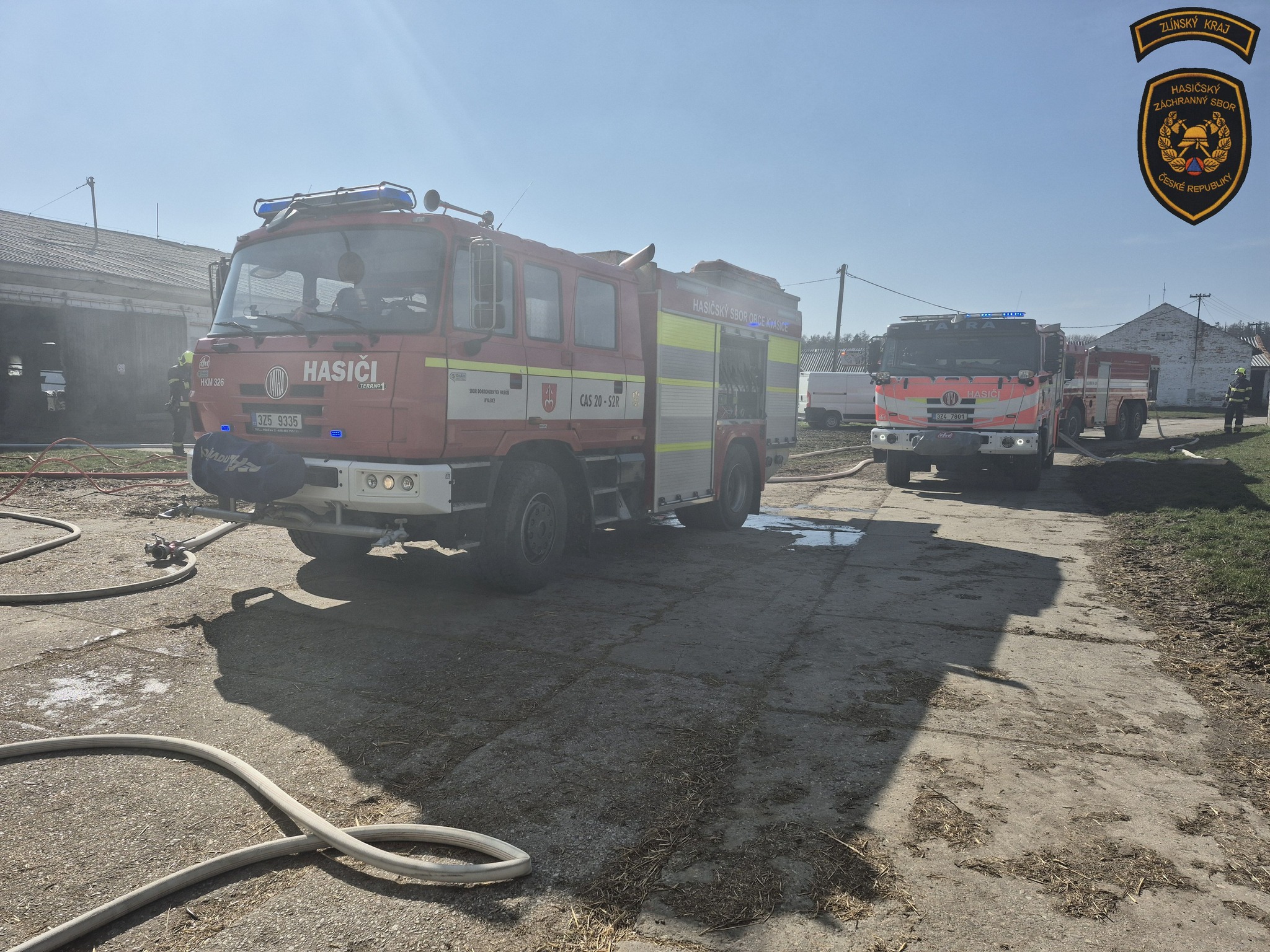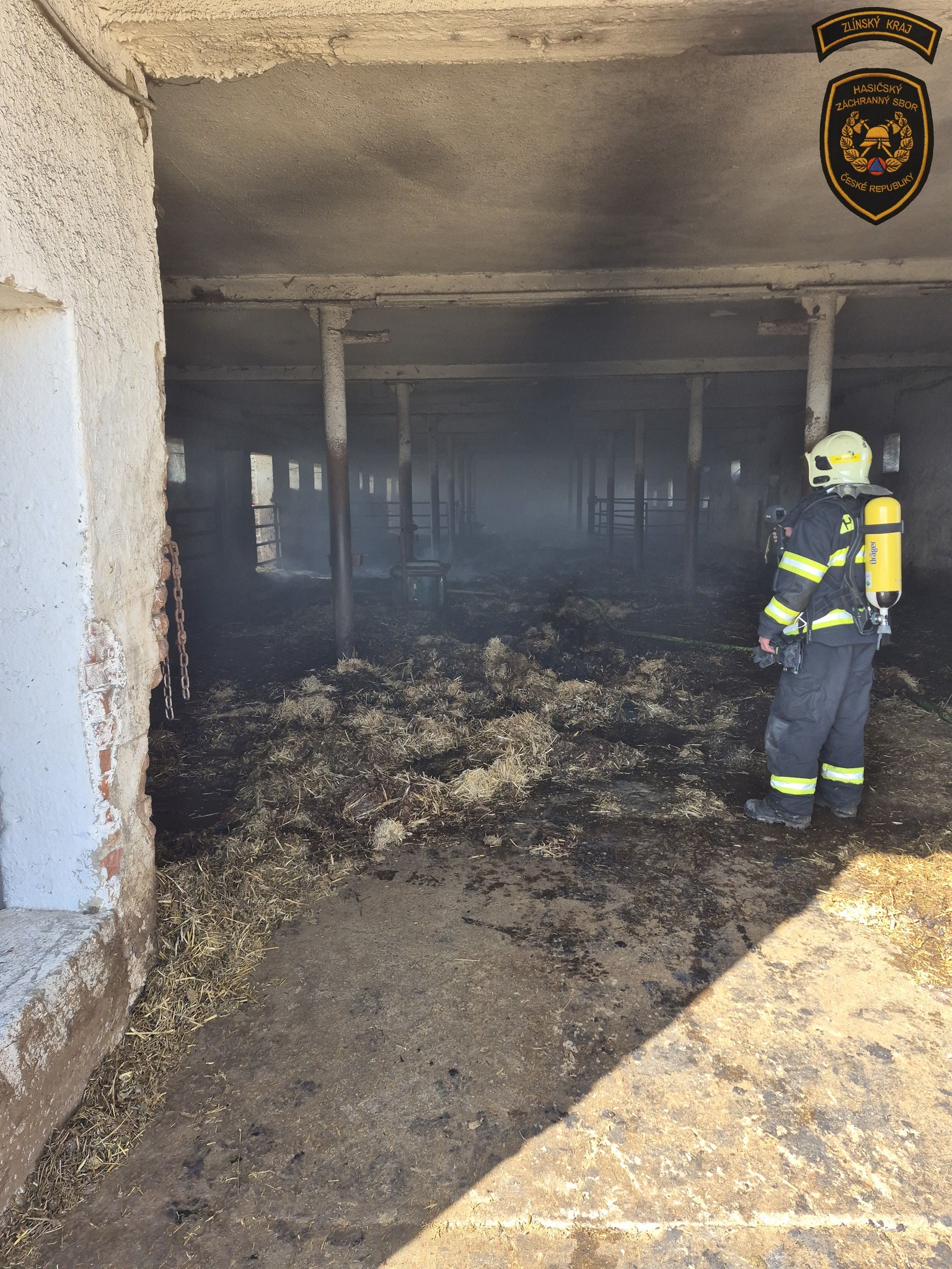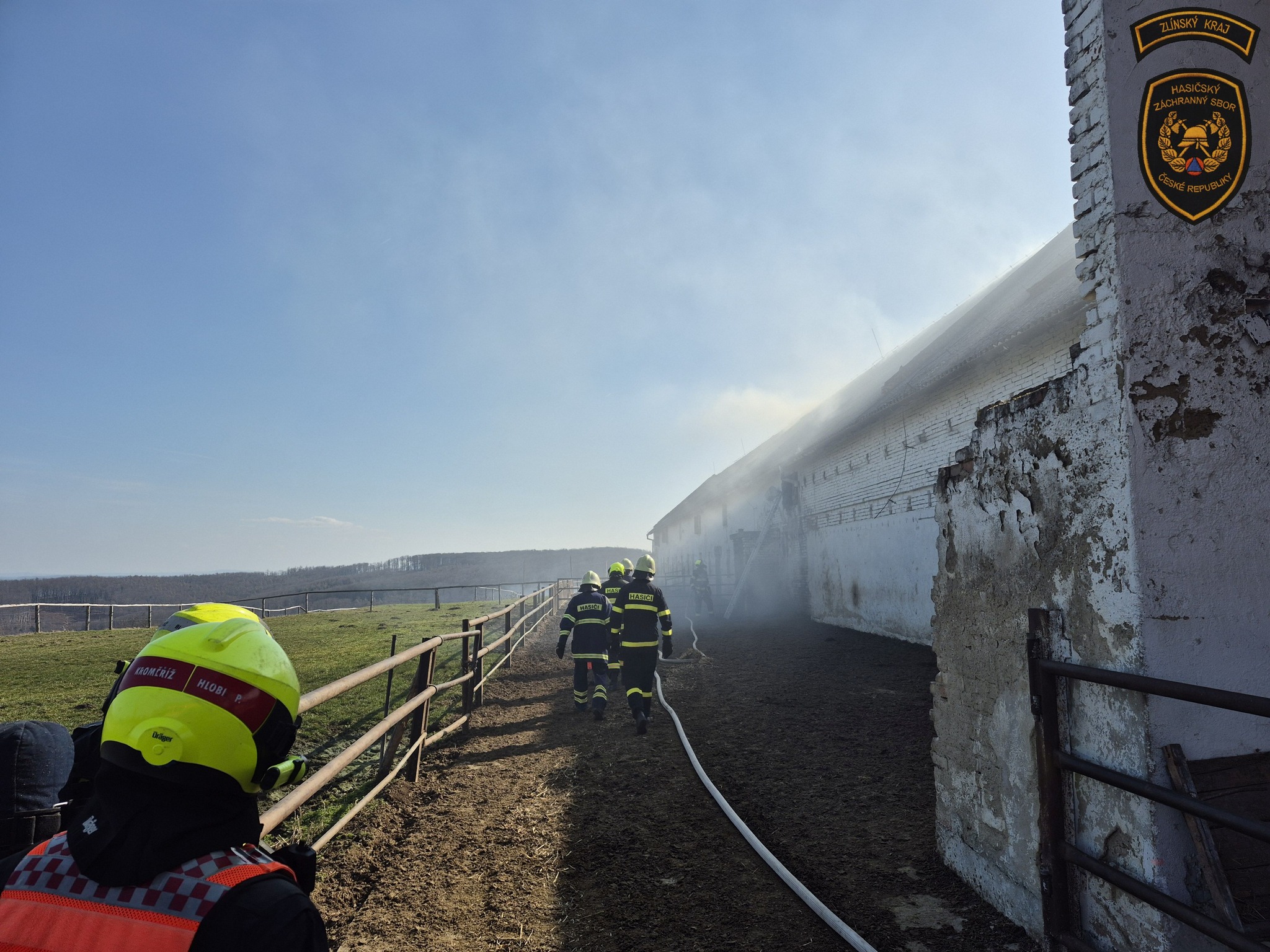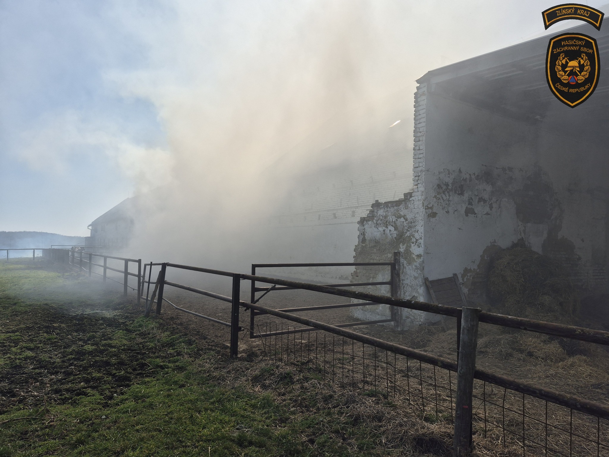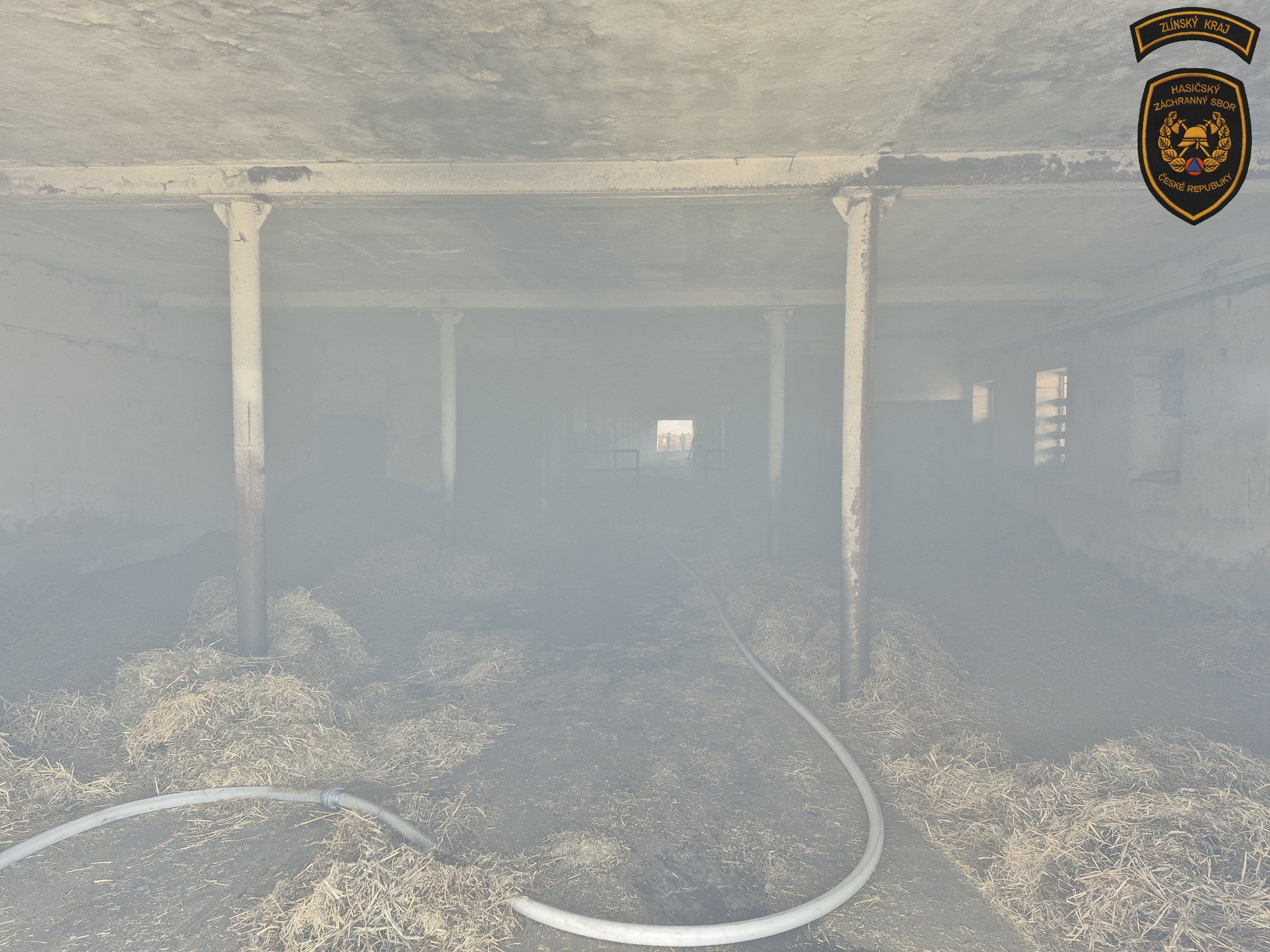 Hasiči zasahují u požáru kravína v Nové Dědině. Krávy se podařilo bezpečně vyhnat z objektu ven. Foto: HZS Zlínského kraje