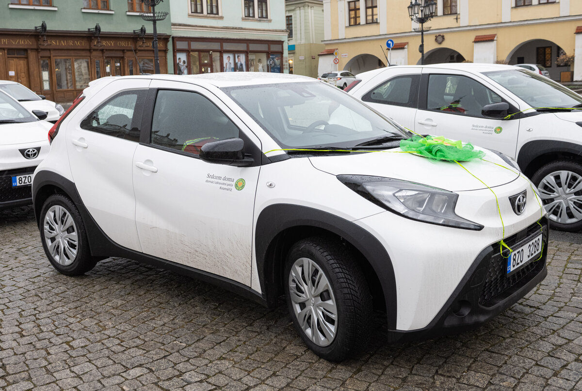 Nová společnost Srdcem doma, která pomáhá v Kroměříži, převzala šest nových aut. Pomáhat budou sestrám, které vyrazí do terénu za pacienty. Foto: město Kroměříž, Srdcem doma
