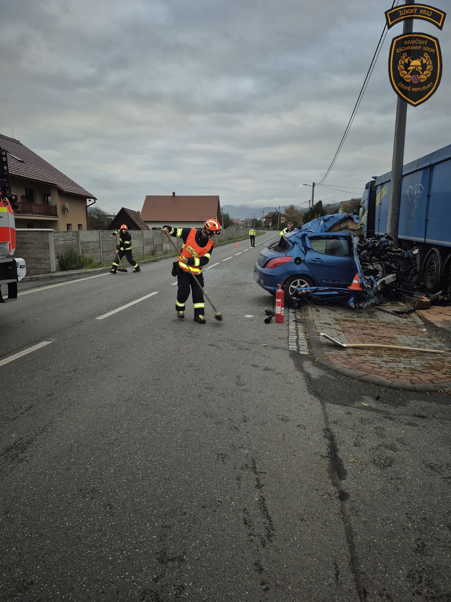 Tragická nehoda stála život dvaadvacetiletého řidiče. V obci Hovězí naboural do zaparkovaného kamionu a utrpěl vážná zranění, kterým následně podlehl. Foto: HZS Zlínského kraje