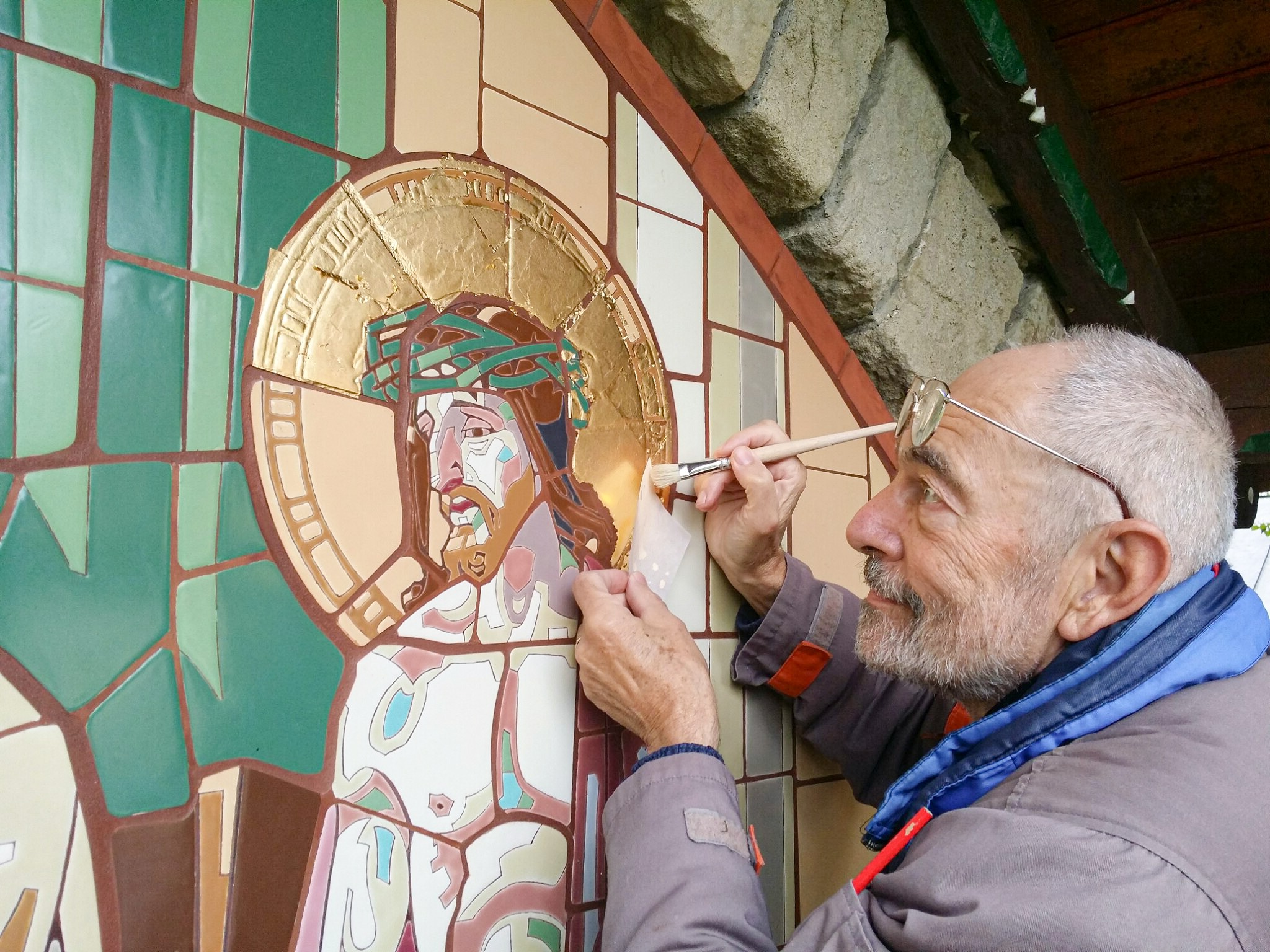 restaurátor Vojtěch Pařík při práci na mozaice Pilátův soud. Foto: archiv autora