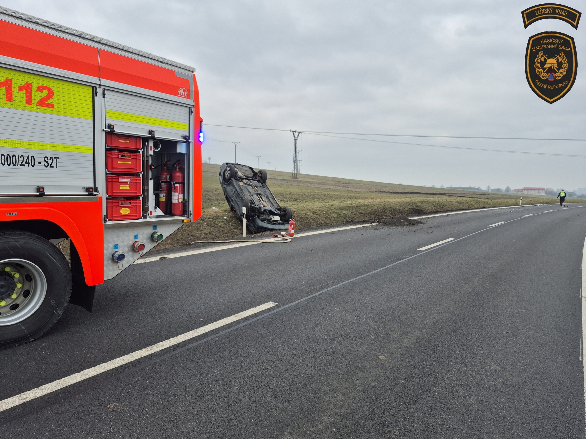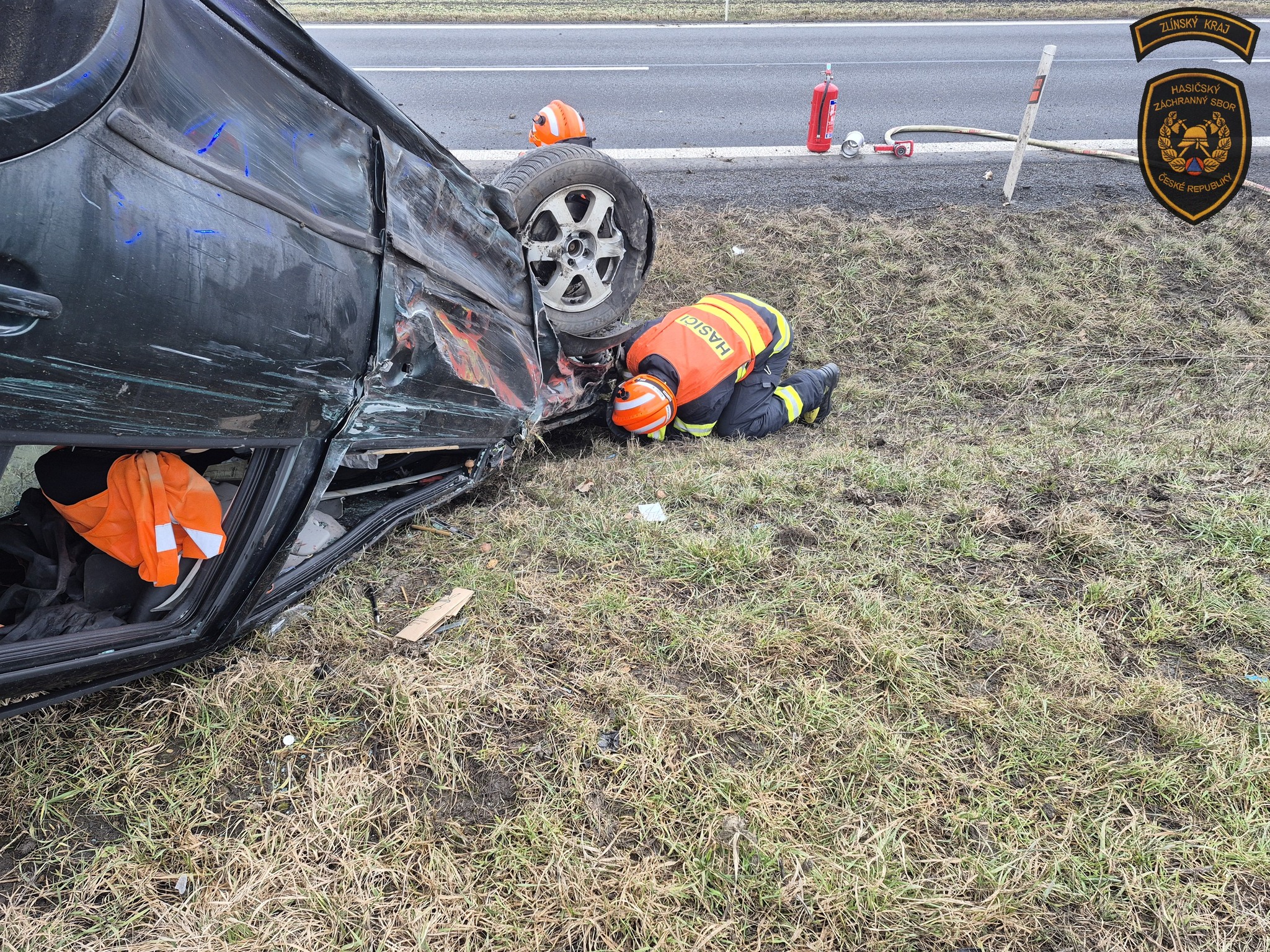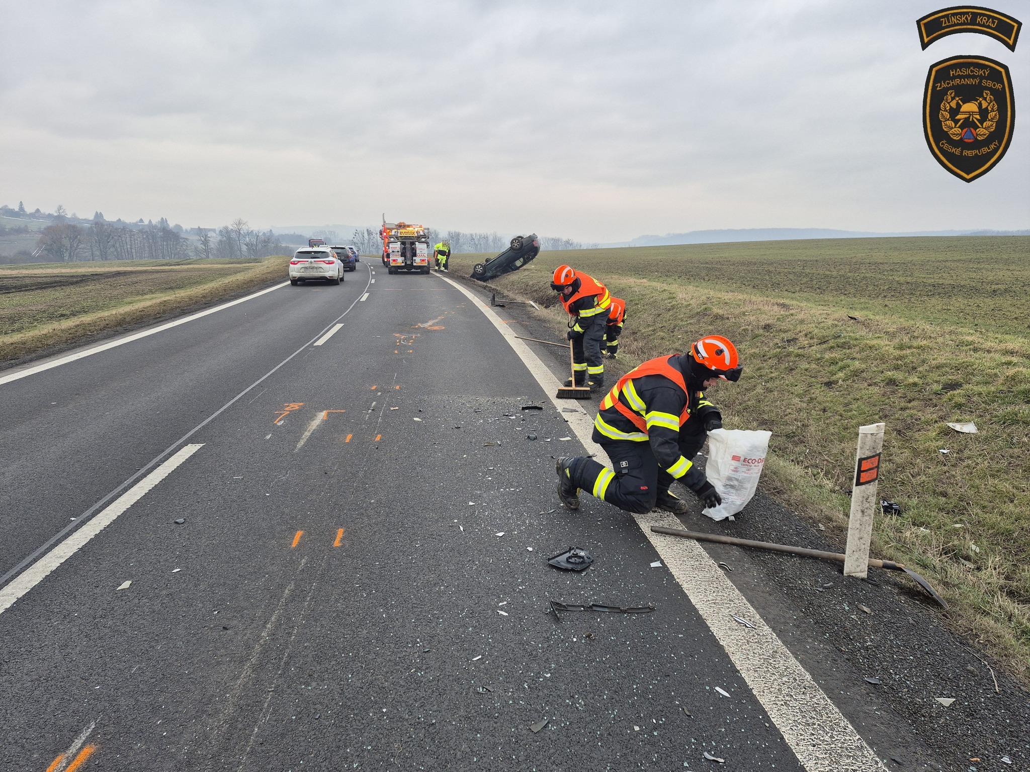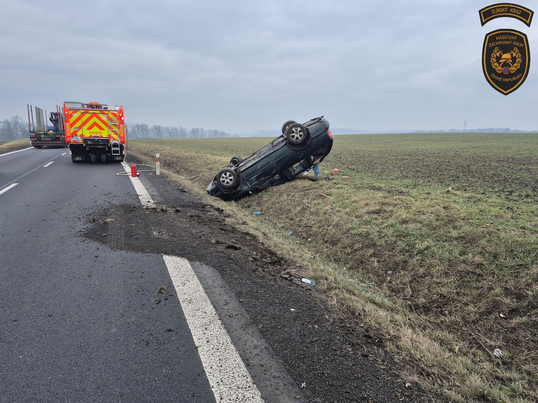 Osobní vozidlo skončilo po srážce s dodávkou v příkopu na střeše. Foto: HZS ZK