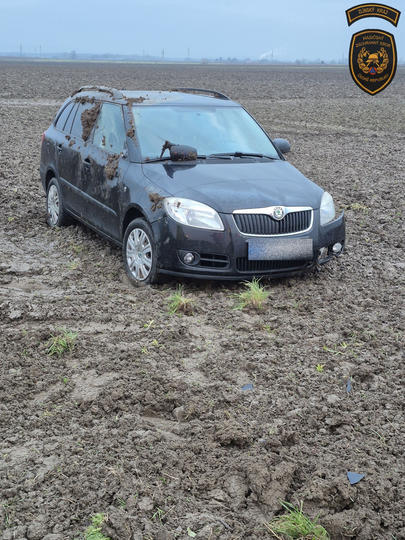 Po nehodě u Ludslavic skončilo osobní vozidlo převrácené v poli. Foto: HZS ZK