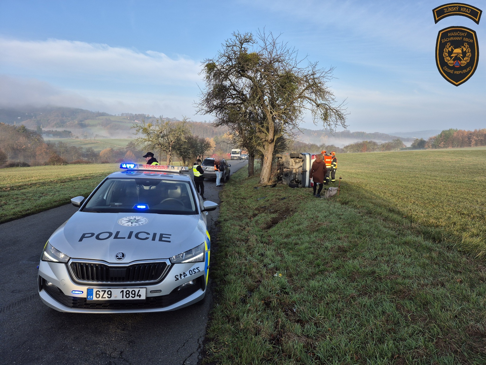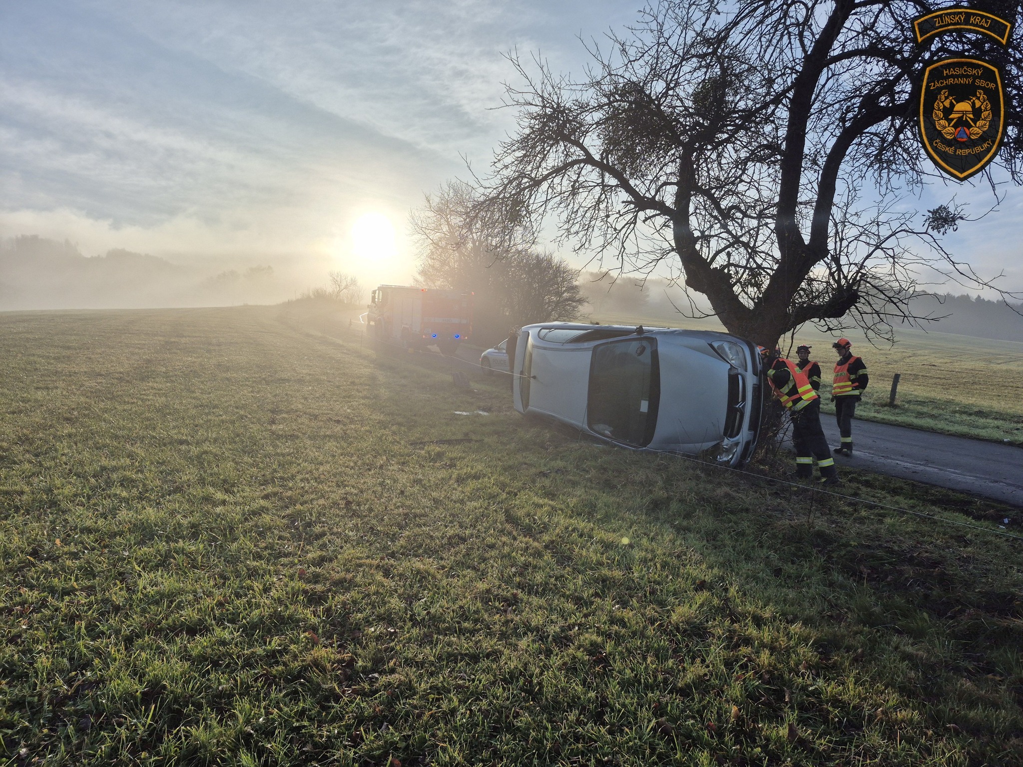 Po nehodě u Vizovic skončilo vozidlo převrácené na boku v poli. Foto: HZS ZK