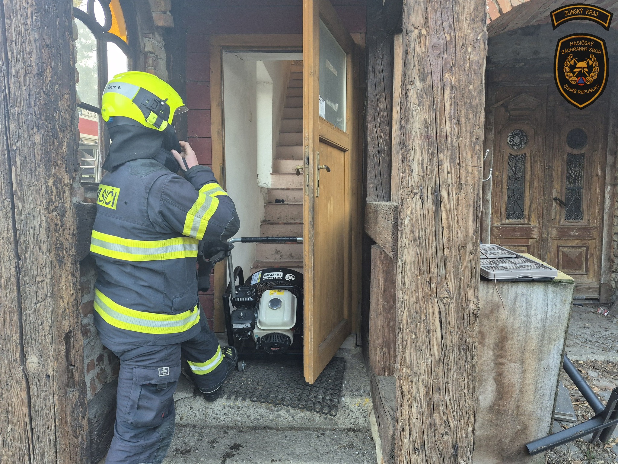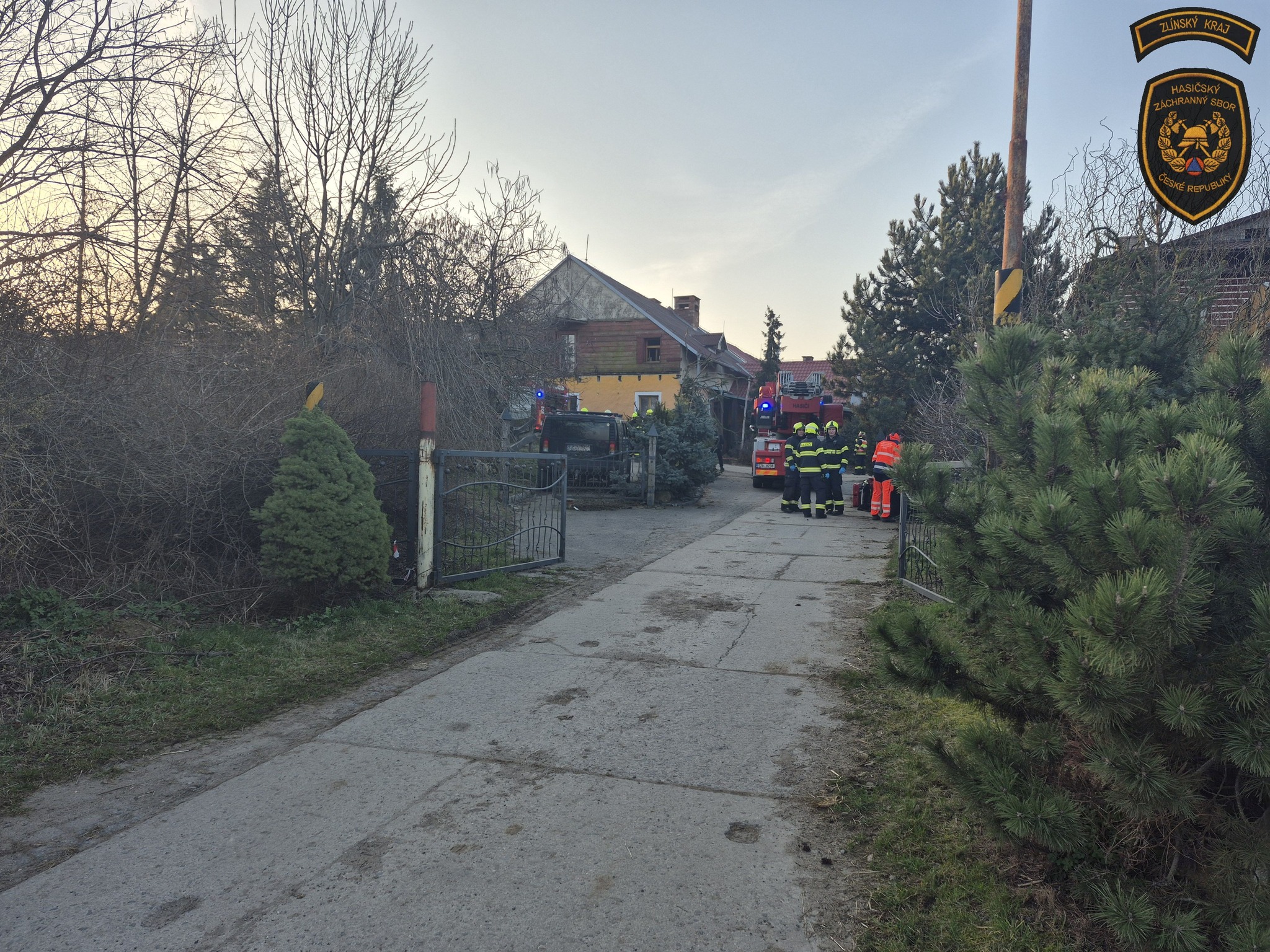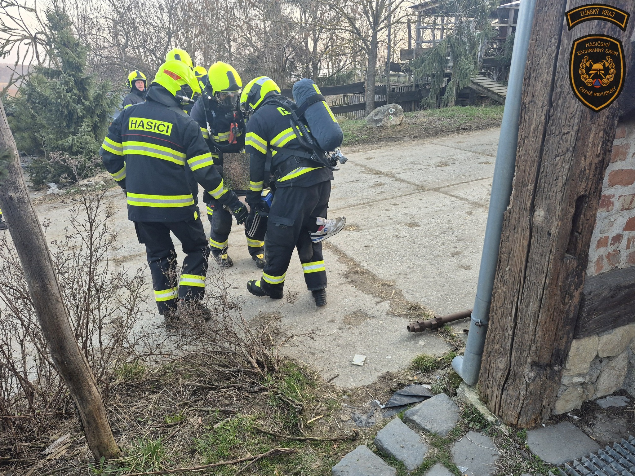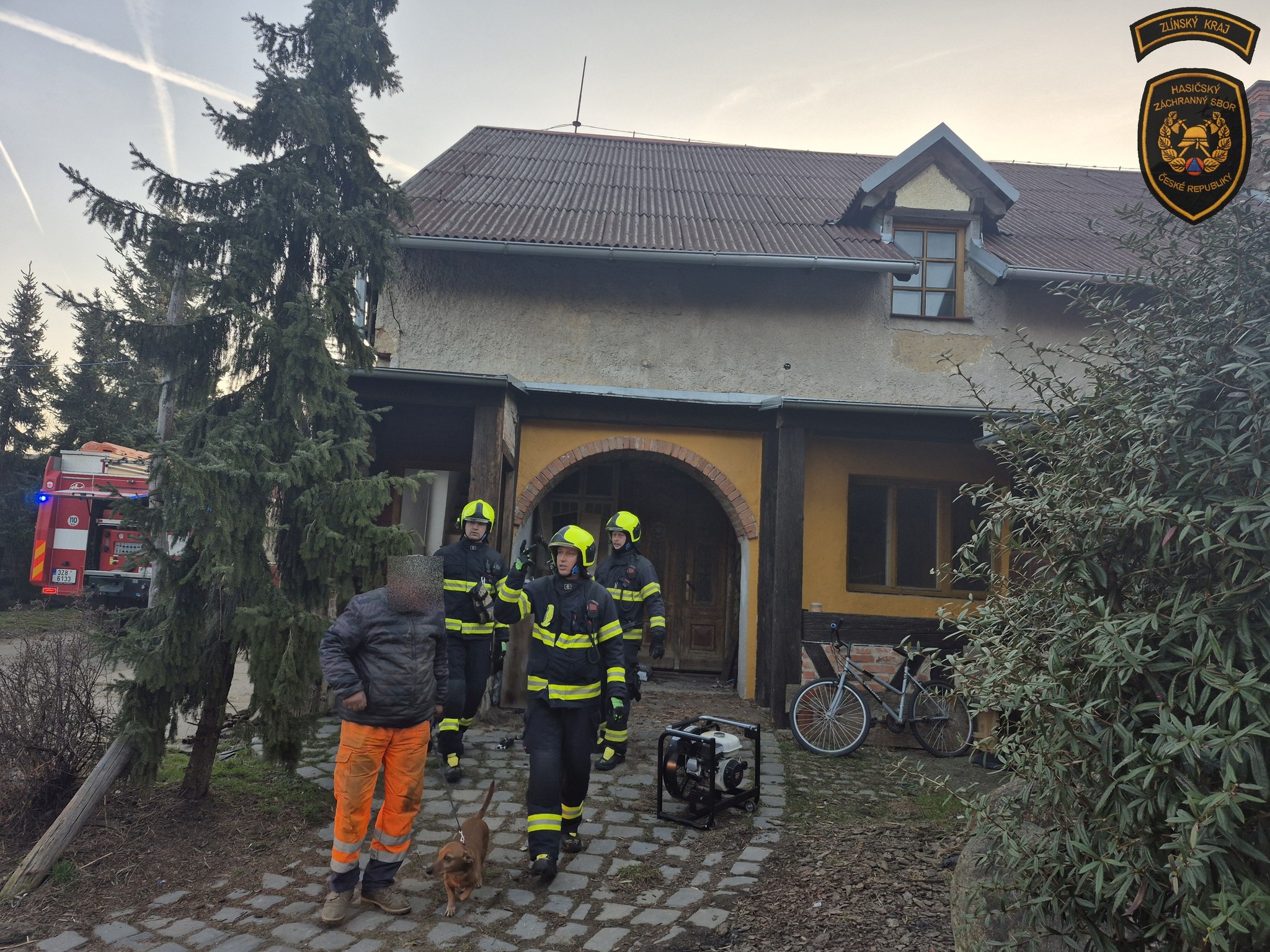 Pět hasičských jednotek vyjíždělo dnes ráno k požáru na farmě v obci Žlutava. Z budovy evakuovali čtyři osoby a dva psy. Foto: HZS Zlínského kraje