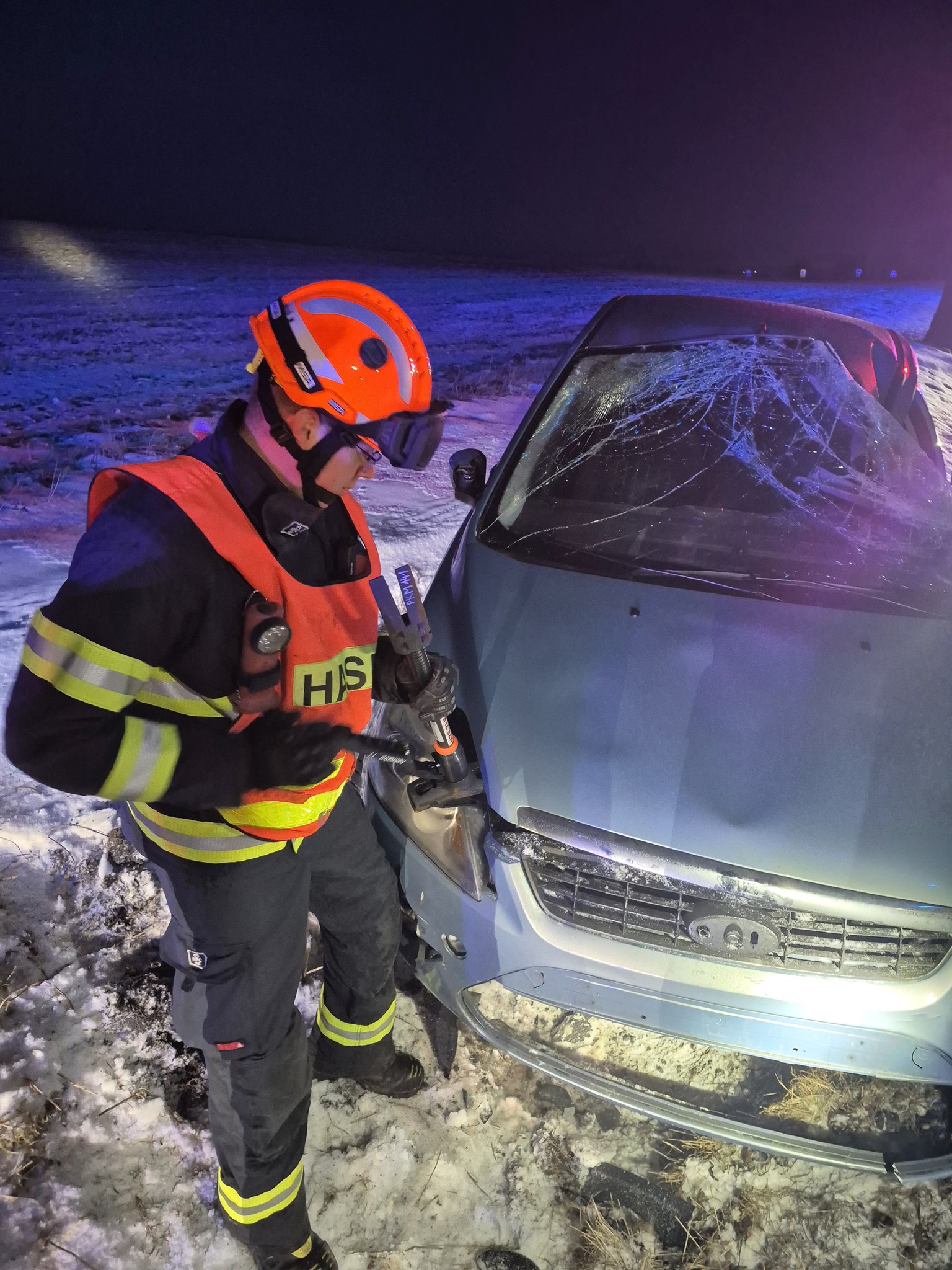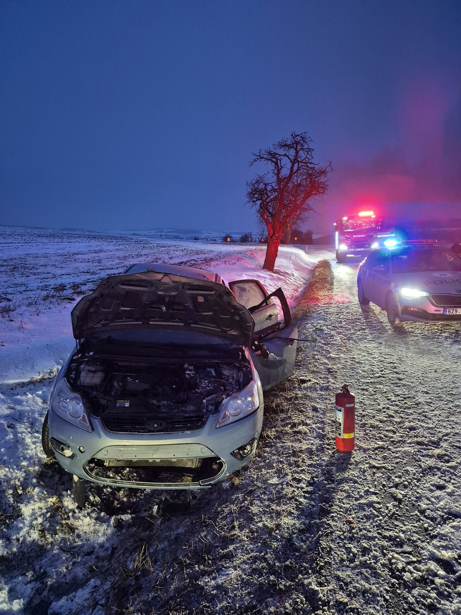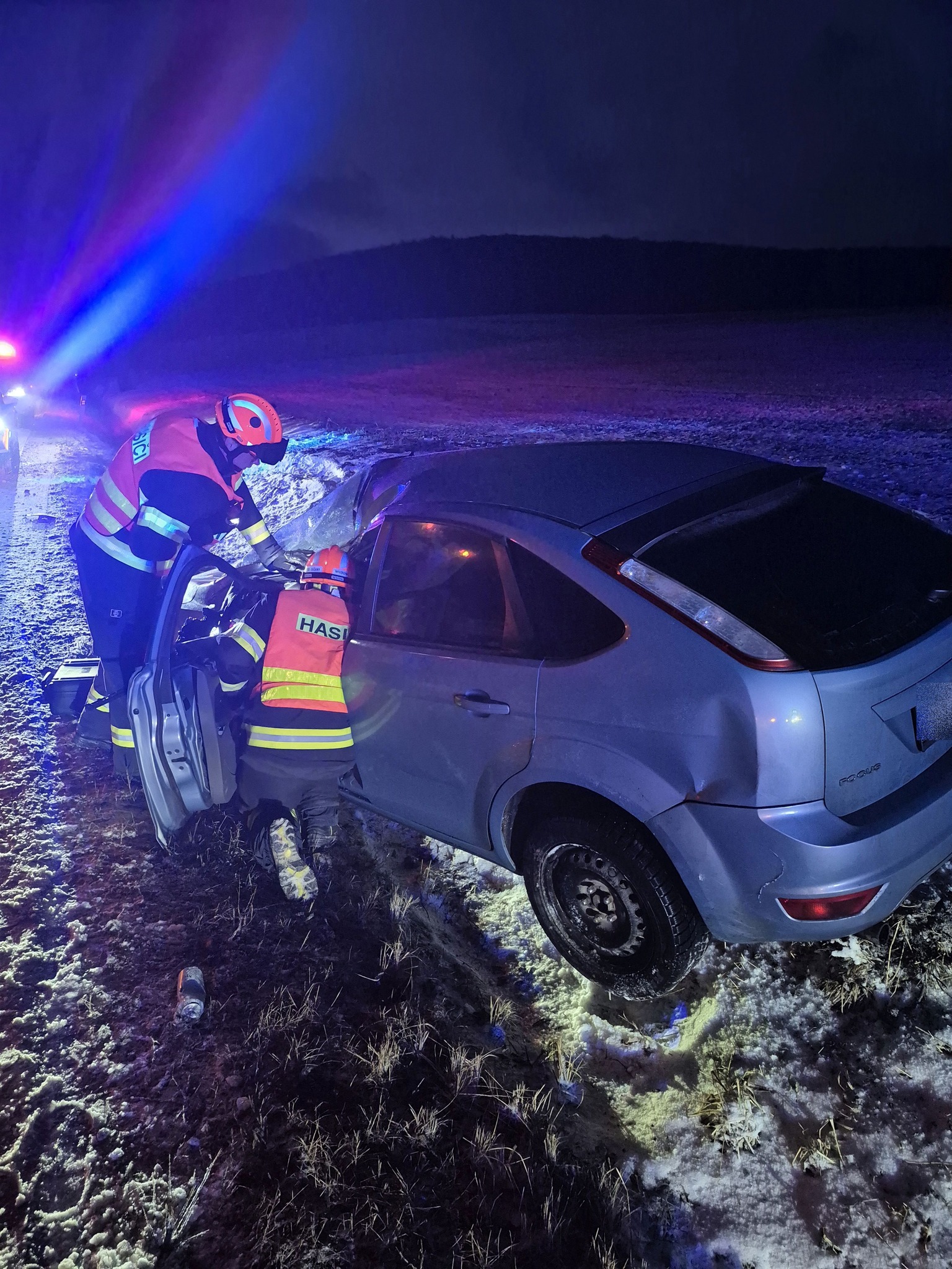 Řidič na Kroměřížsku nezvládl jízdu na zasněžené silnici a skončil s vozidlem v příkopu. Foto: HZS ZK