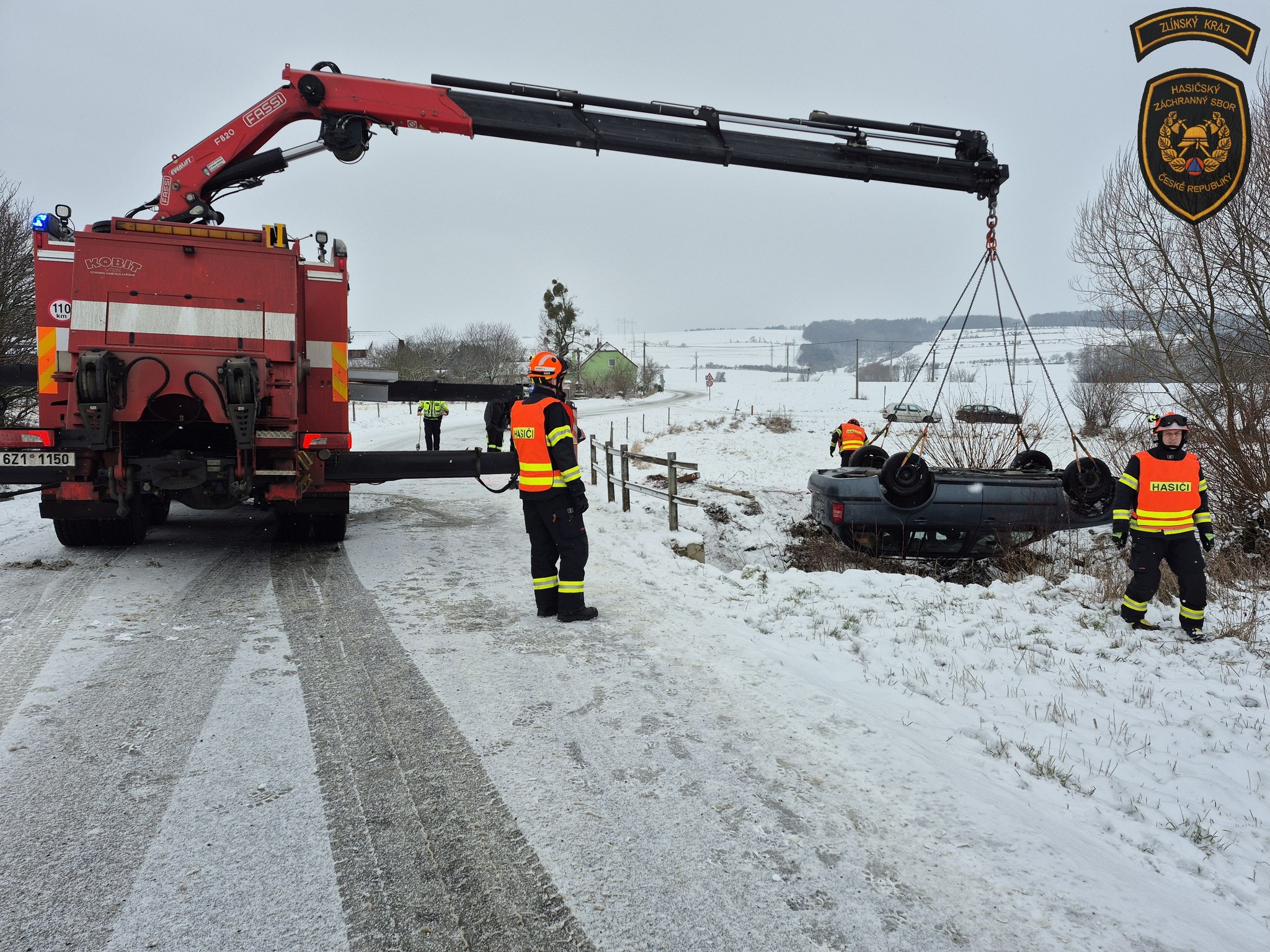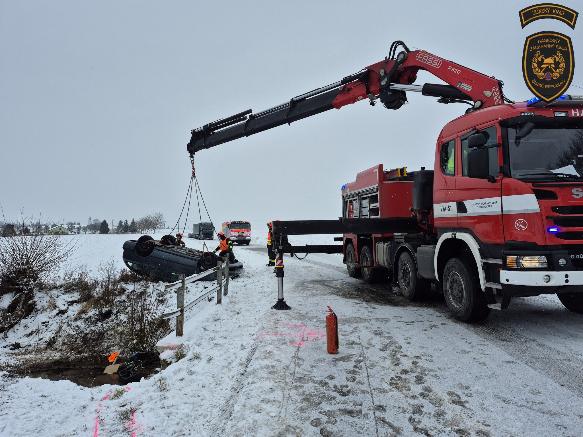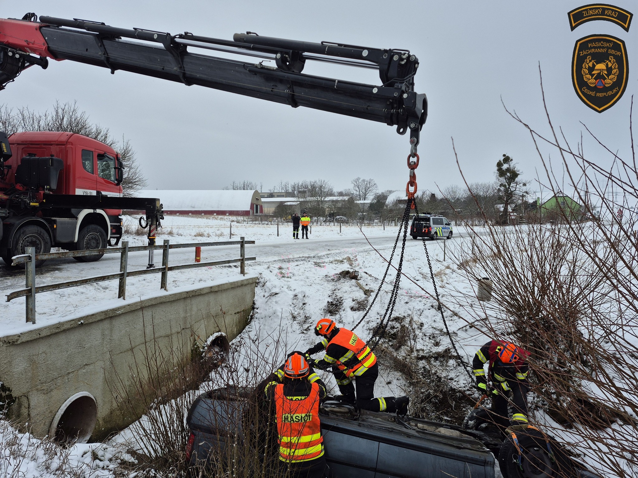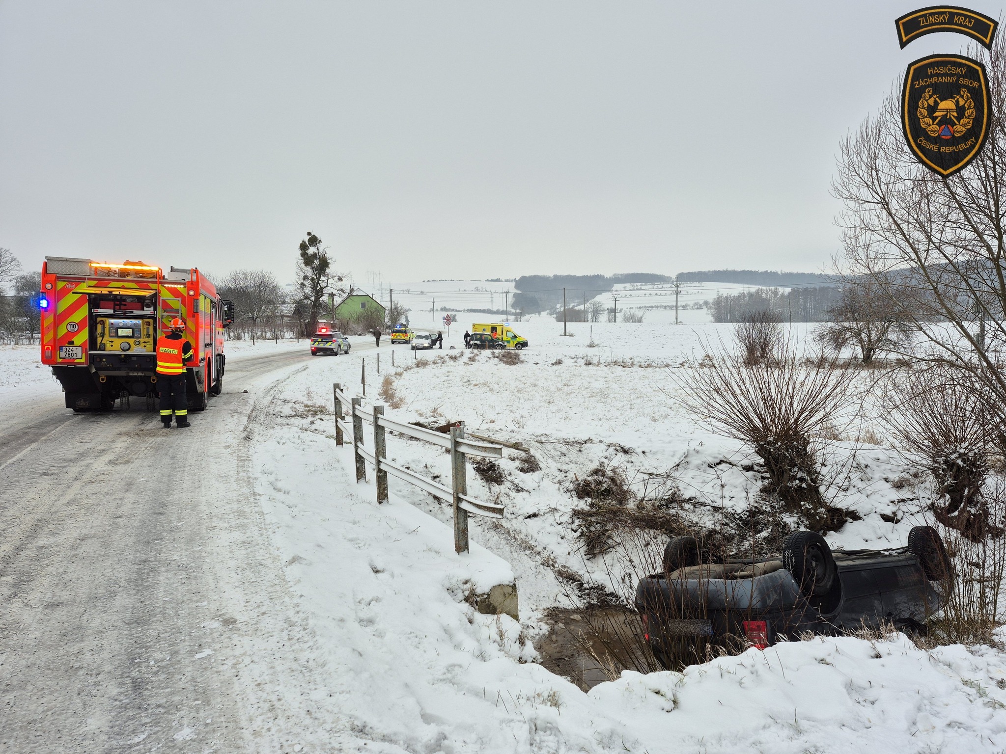 Řidička u Kvasic sjela ze silnice a skončila v korytě potoka. V době nehody s ní cestovaly také dvě děti. Foto: HZS Zlínského kraje