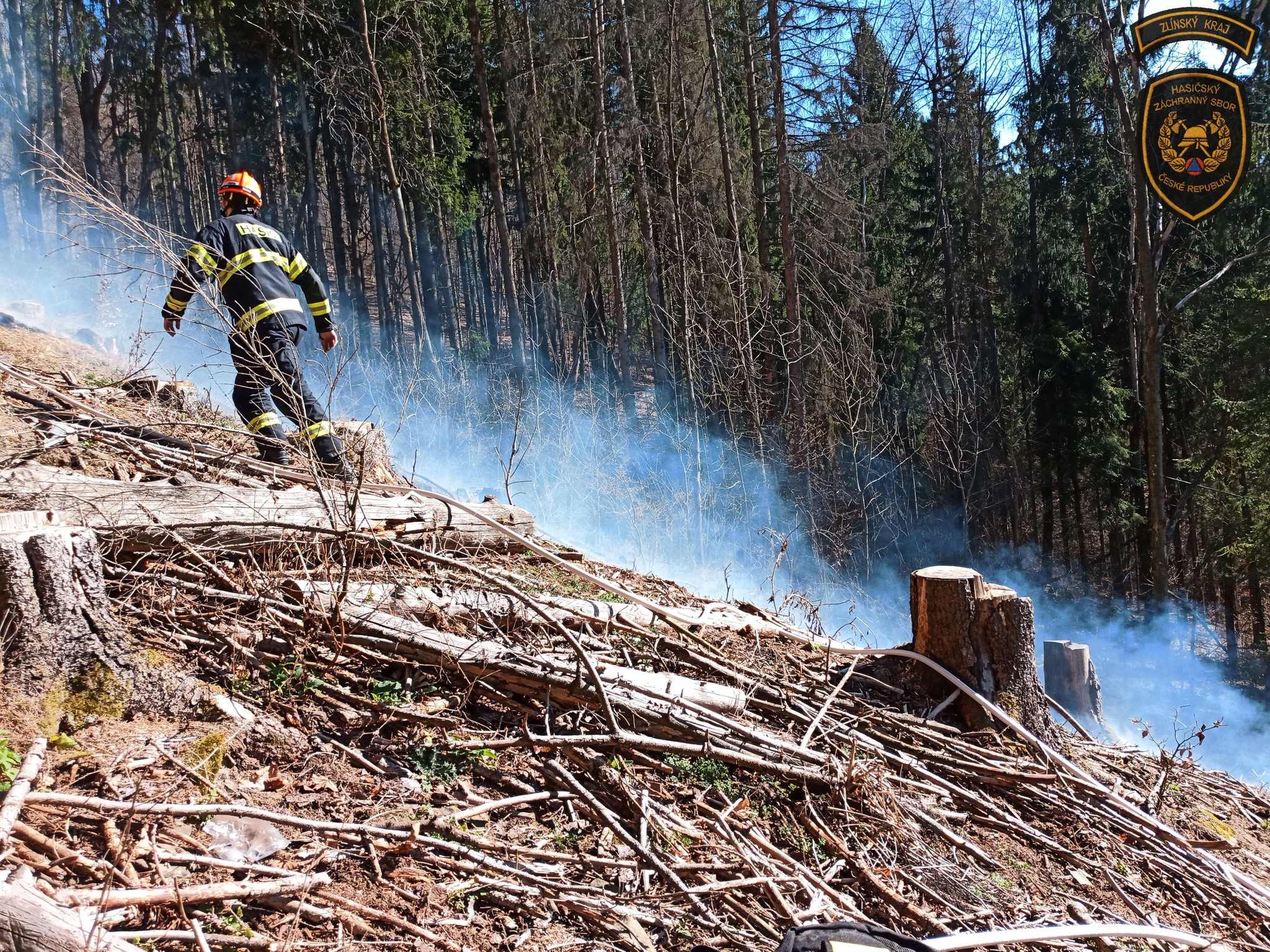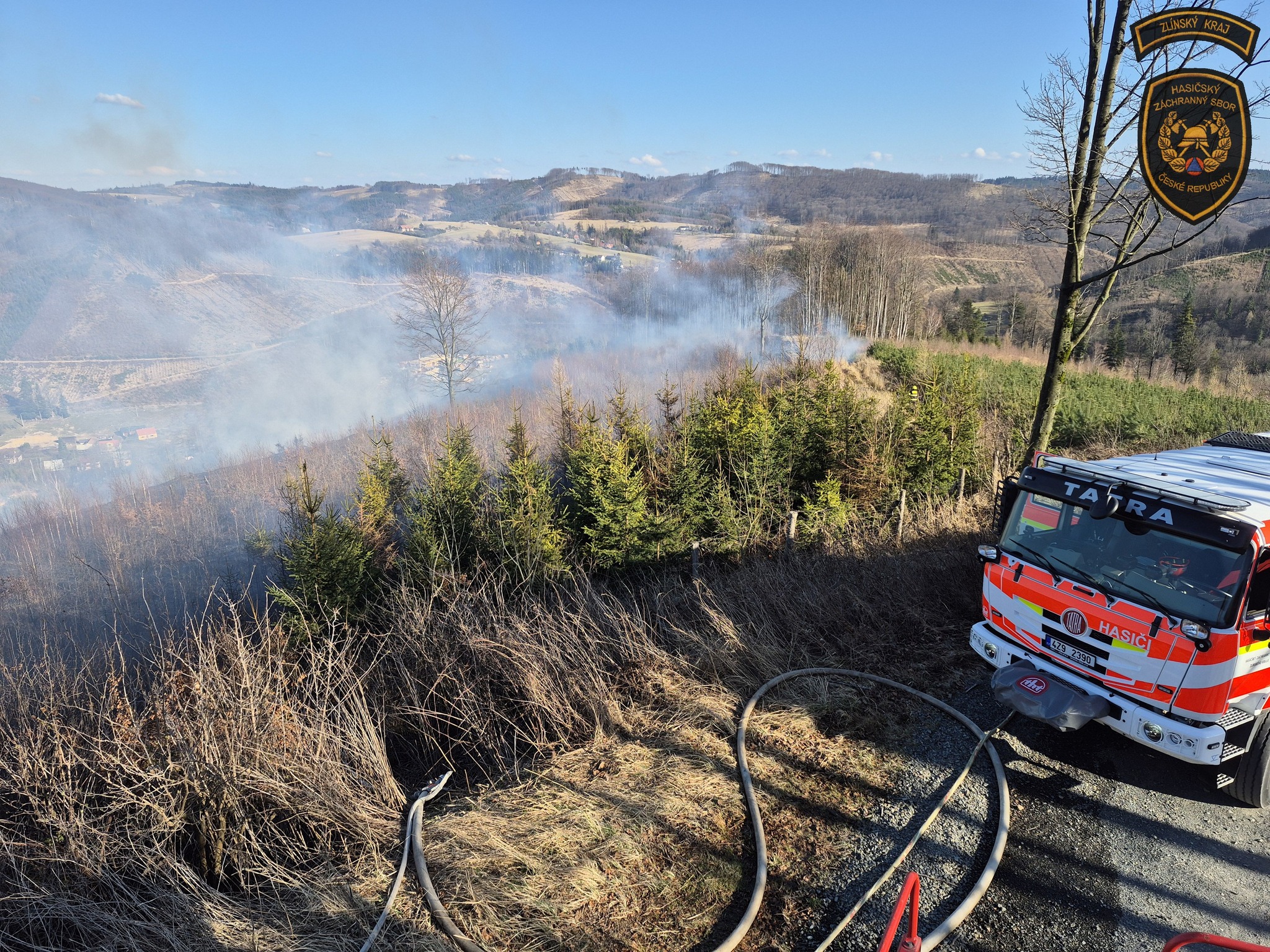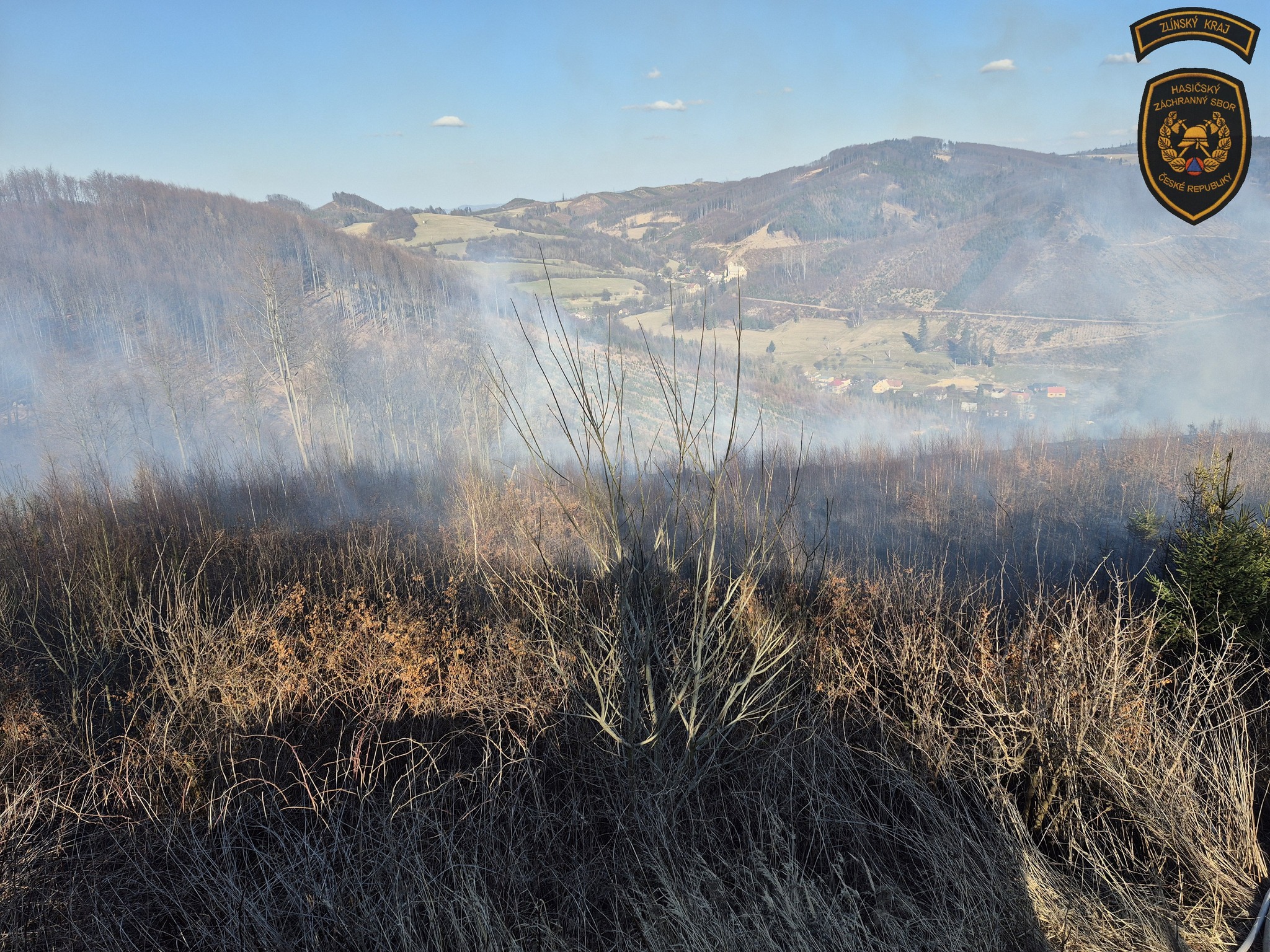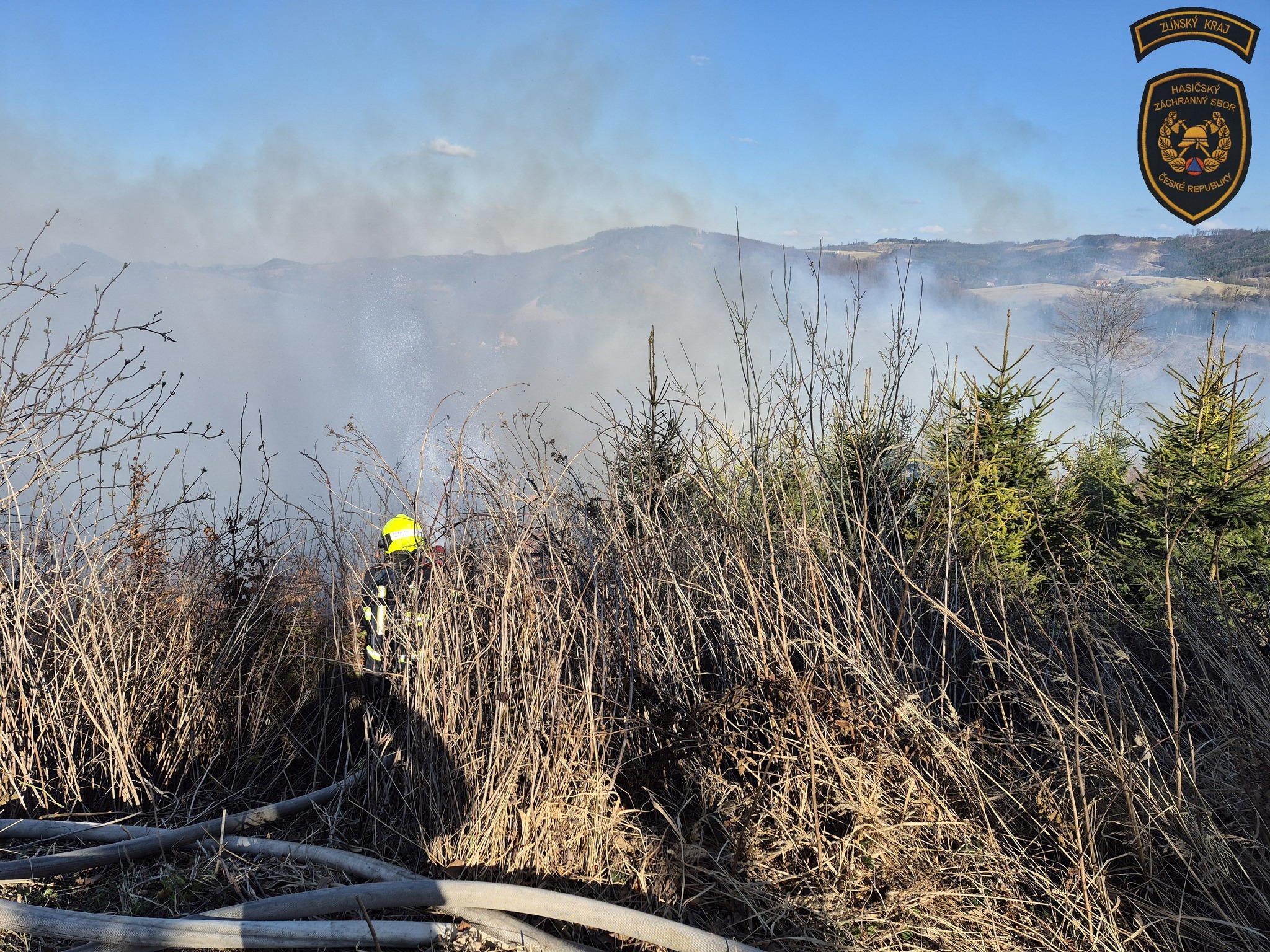 Hasiči v sobotu bojovali s událostmi, které komplikoval vítr. Nejhorší situace byla v Rajnochovicích, kde začal hořet mladý les a oheň se kvůli silnému větru rychle šířil. Foto: HZS Zlínského kraje
