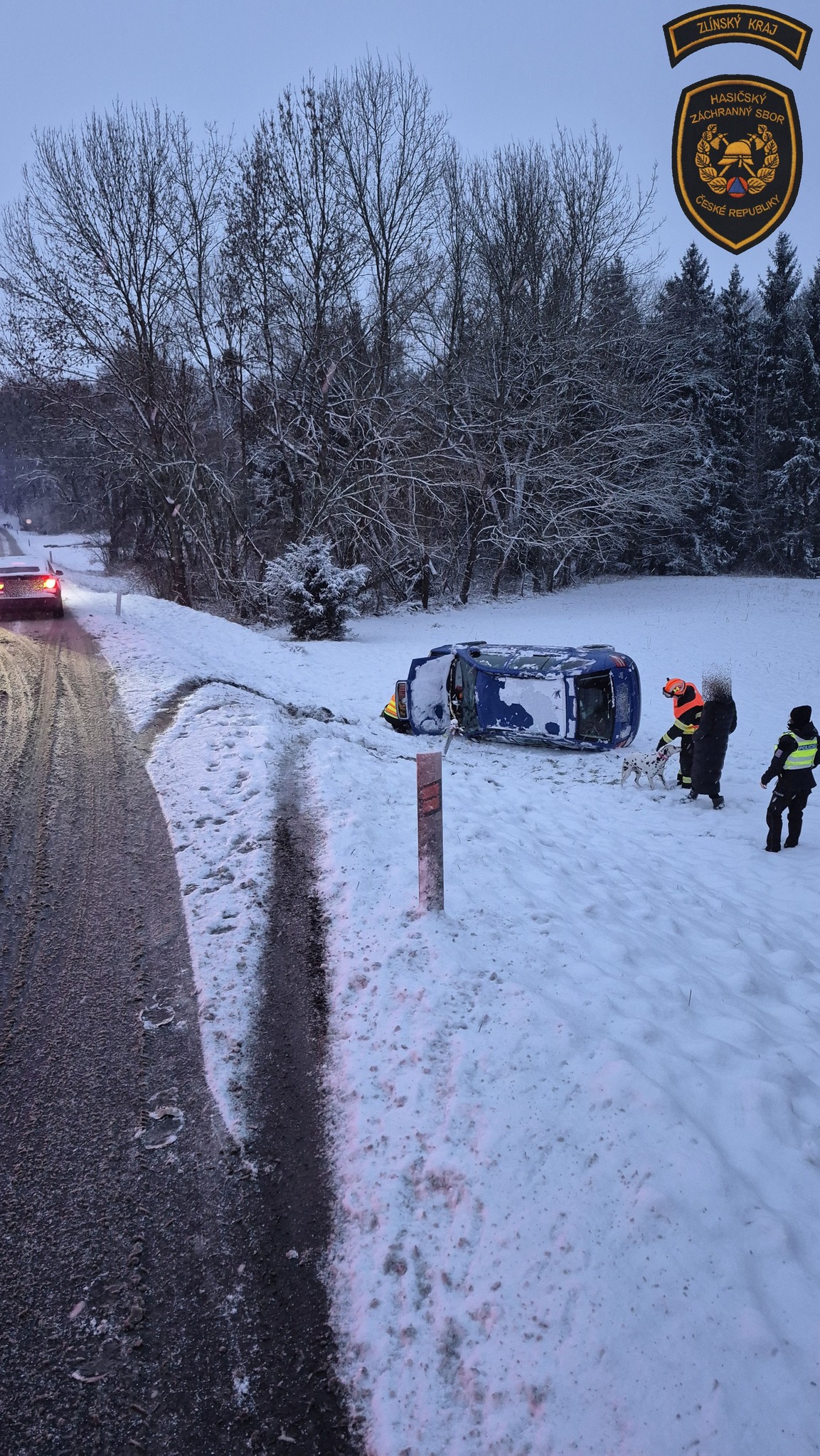 Během pondělí museli hasiči zasahovat u devíti nehod napříč celým Zlínským krajem. Na vině bylo husté sněžení a náledí. Nehoda Doubravy. Foto: HZS Zlínského kraje