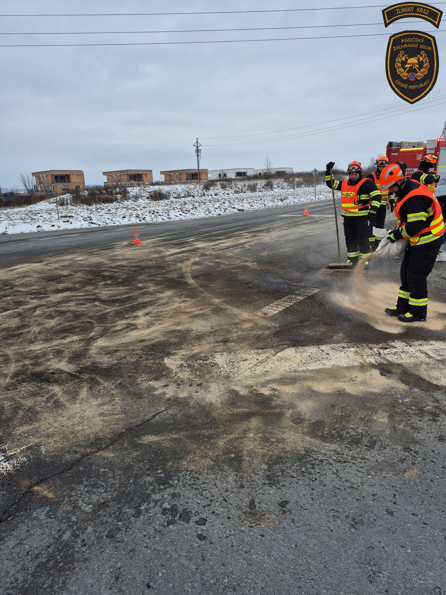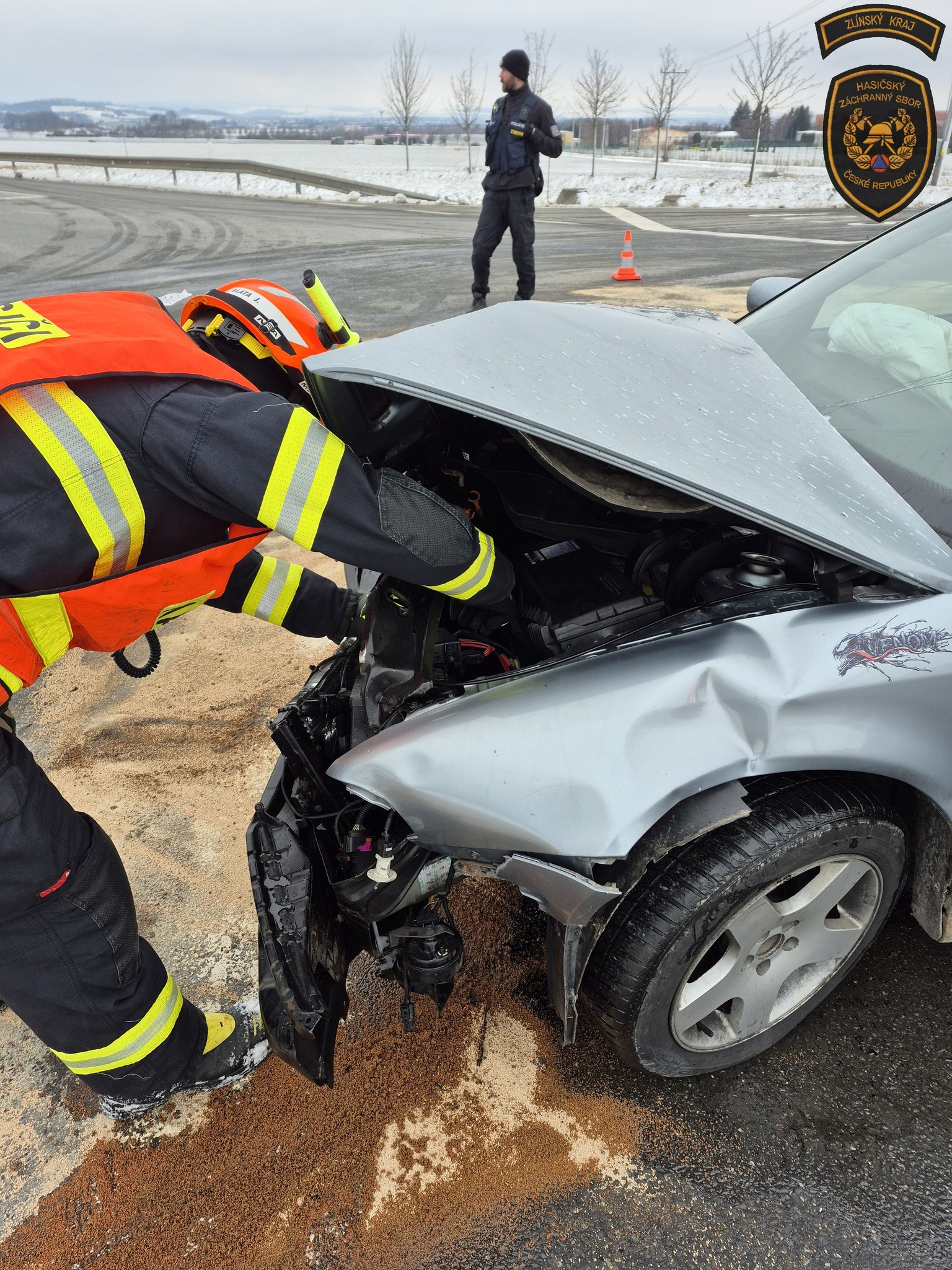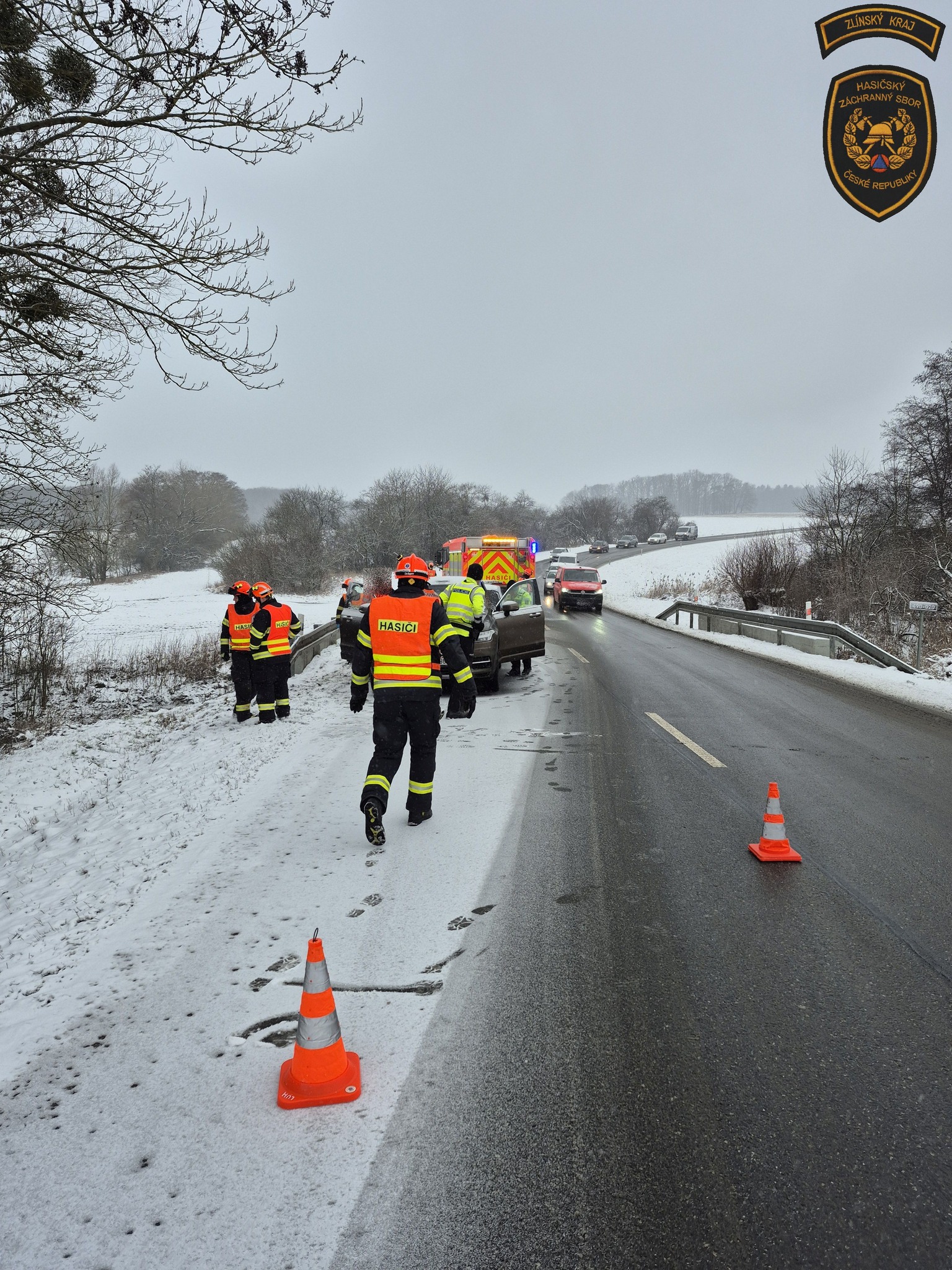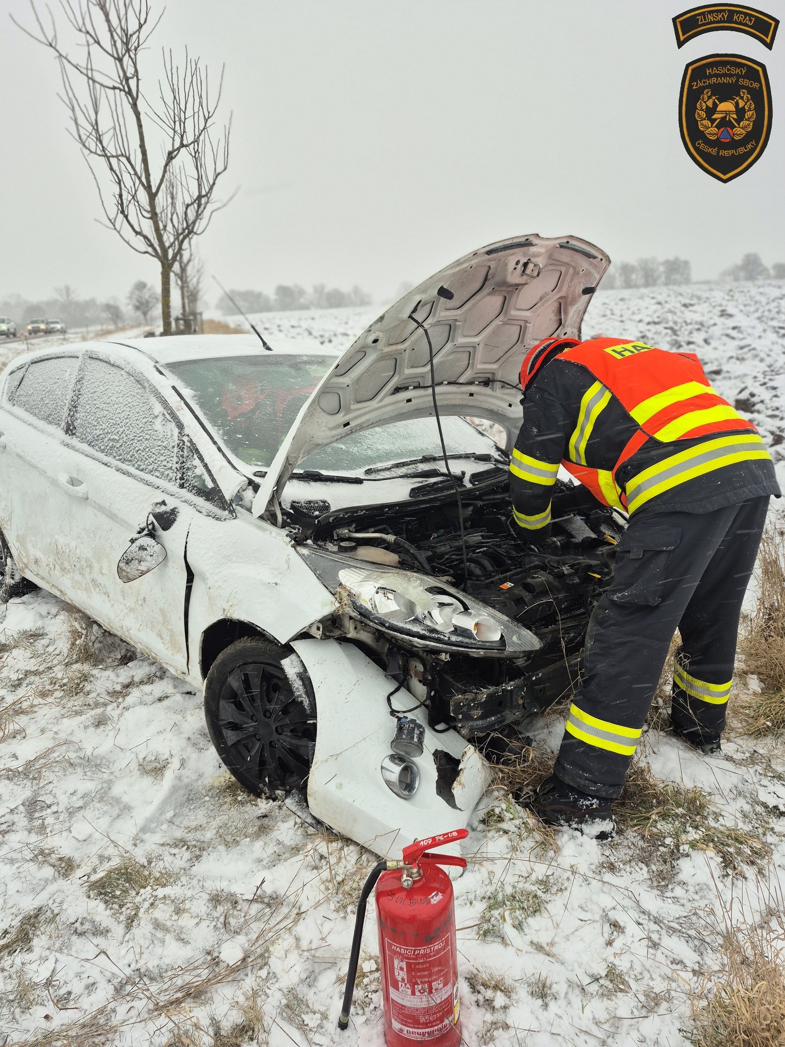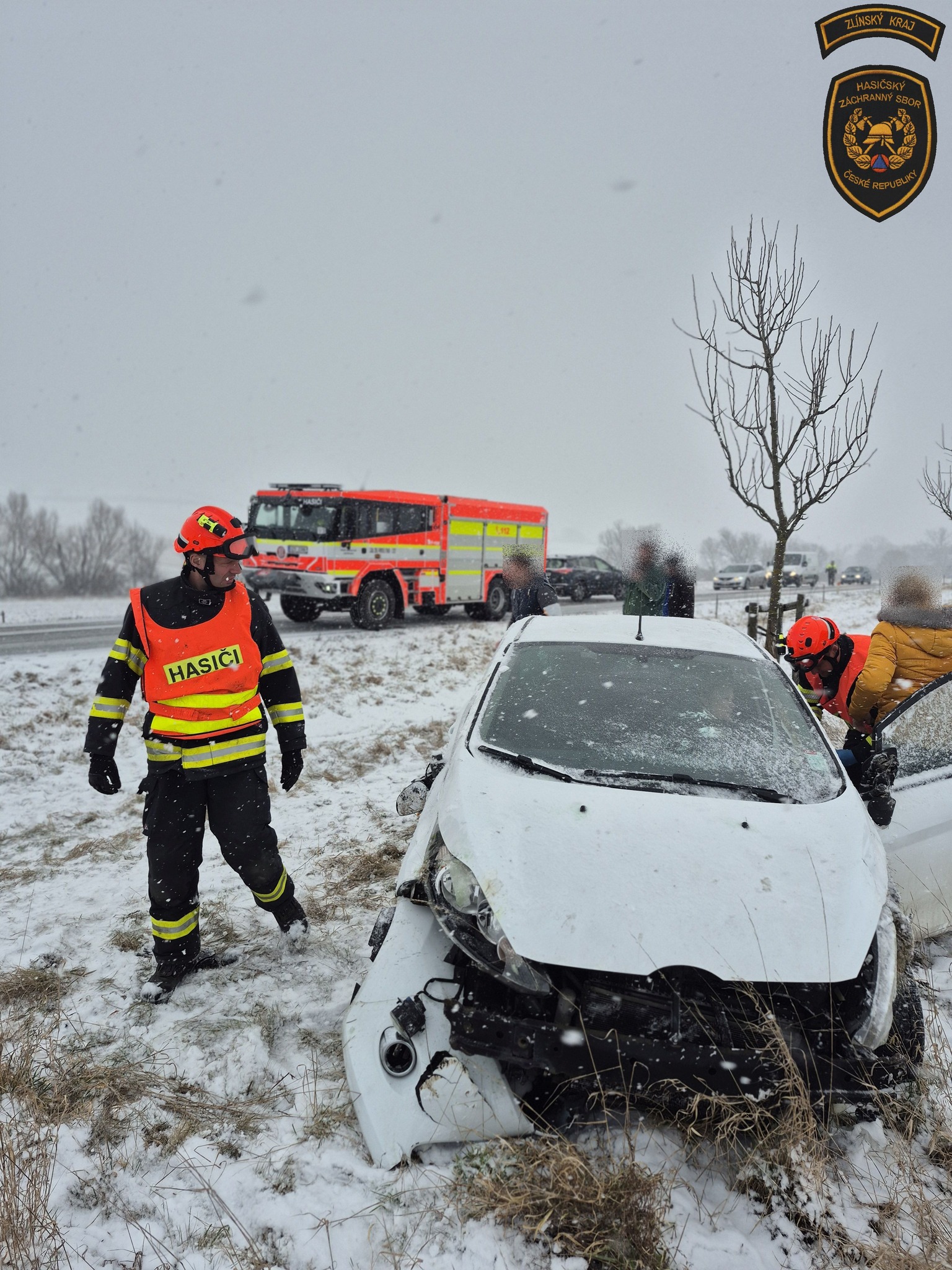 Během pondělí museli hasiči zasahovat u devíti nehod napříč celým Zlínským krajem. Na vině bylo husté sněžení a náledí. Nehoda Lechotice. Foto: HZS Zlínského kraje