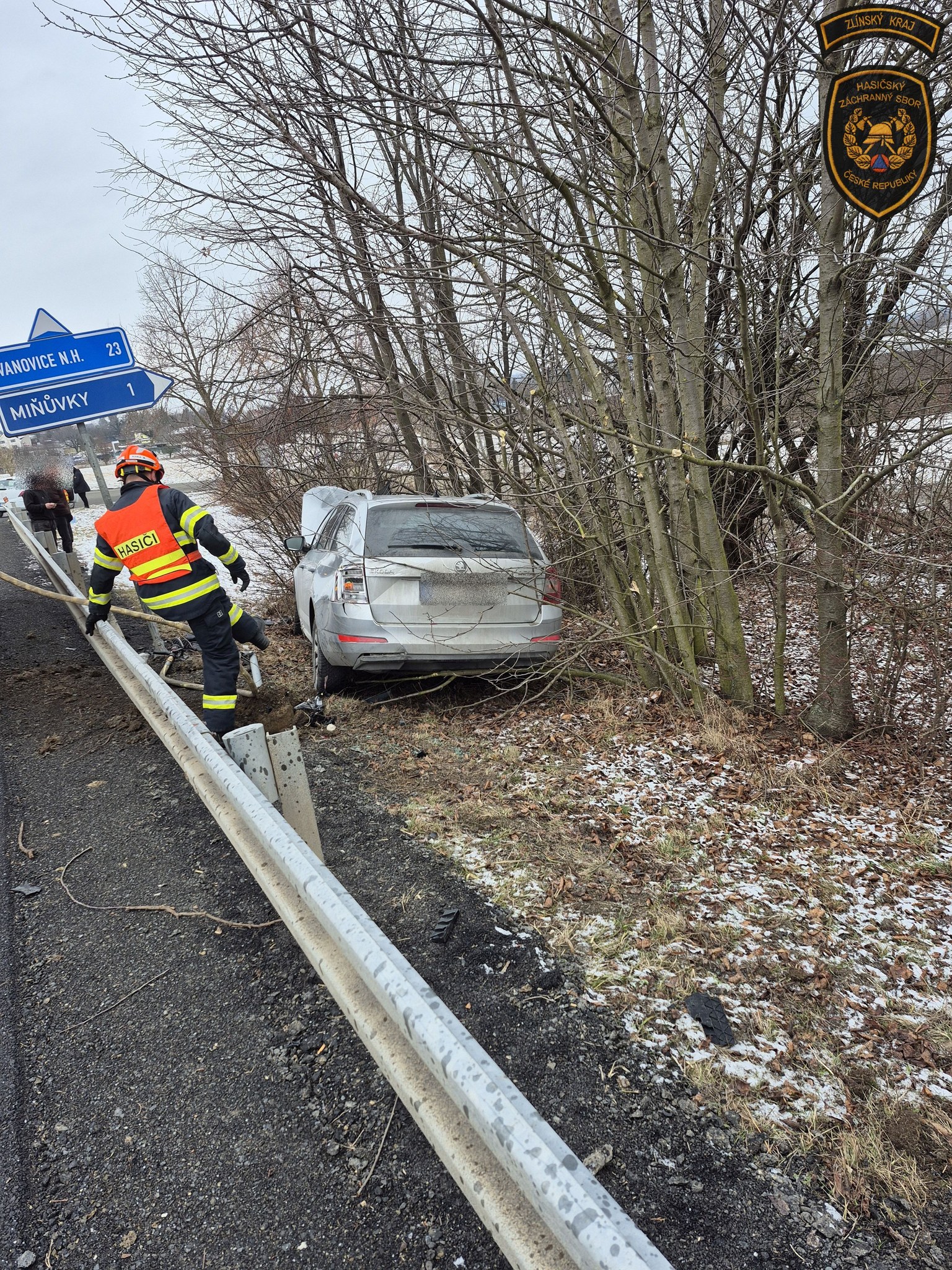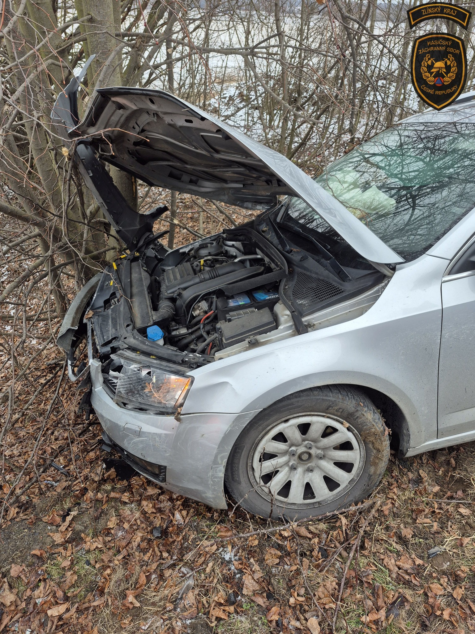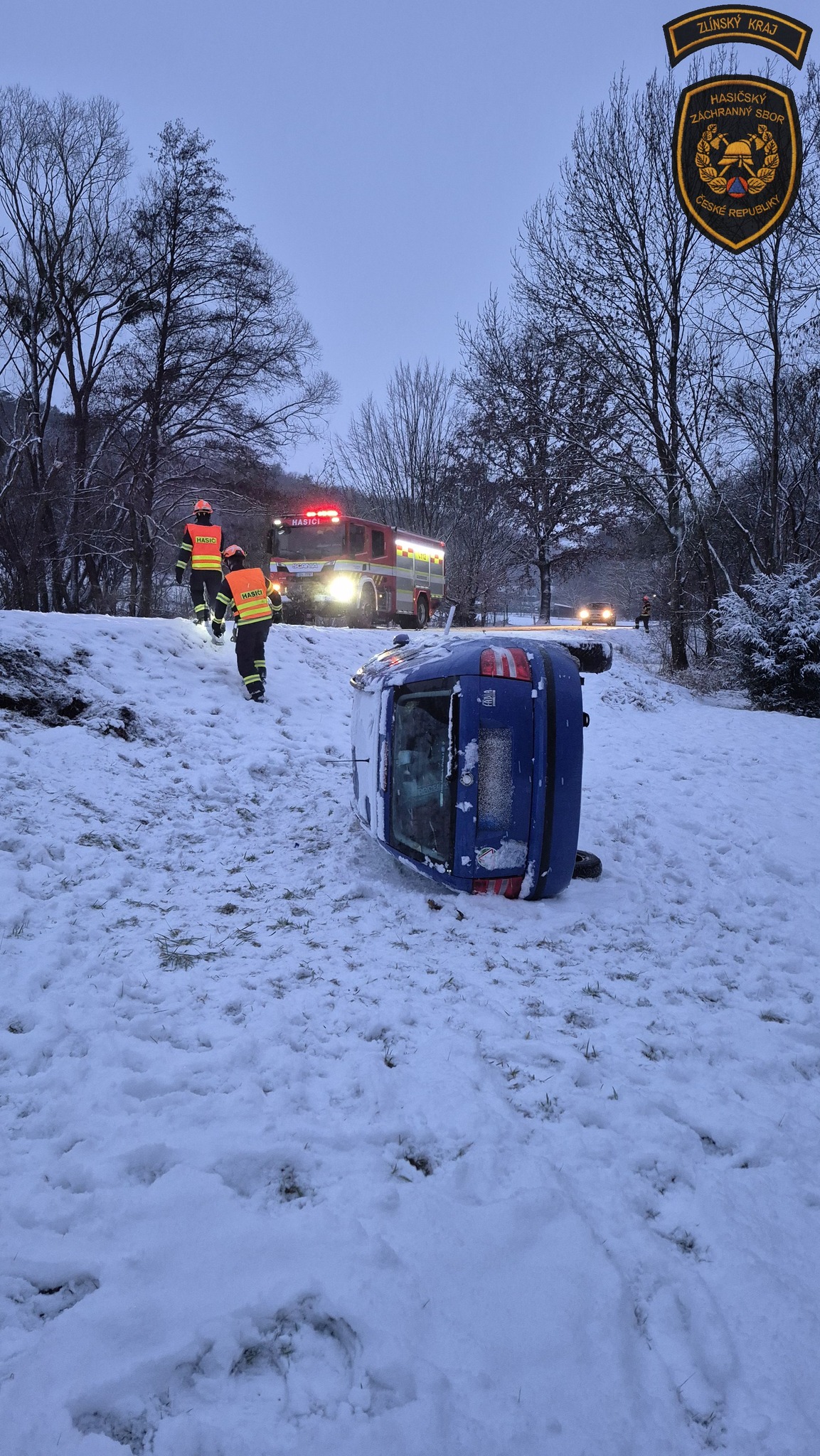 Během pondělí museli hasiči zasahovat u devíti nehod napříč celým Zlínským krajem. Na vině bylo husté sněžení a náledí. Nehoda Malenovice. Foto: HZS Zlínského kraje