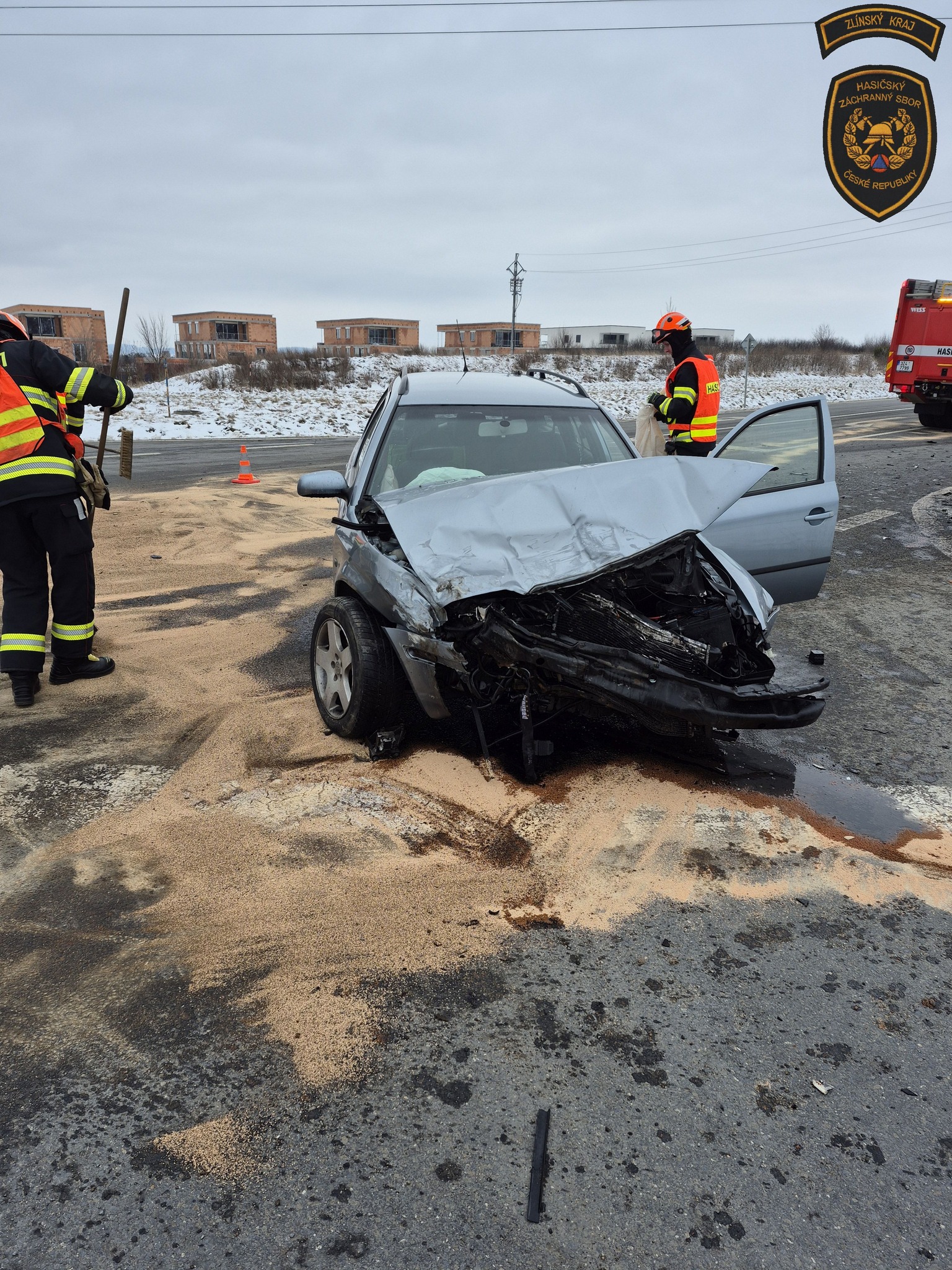 Během pondělí museli hasiči zasahovat u devíti nehod napříč celým Zlínským krajem. Na vině bylo husté sněžení a náledí. Nehoda Kroměříž. Foto: HZS Zlínského kraje