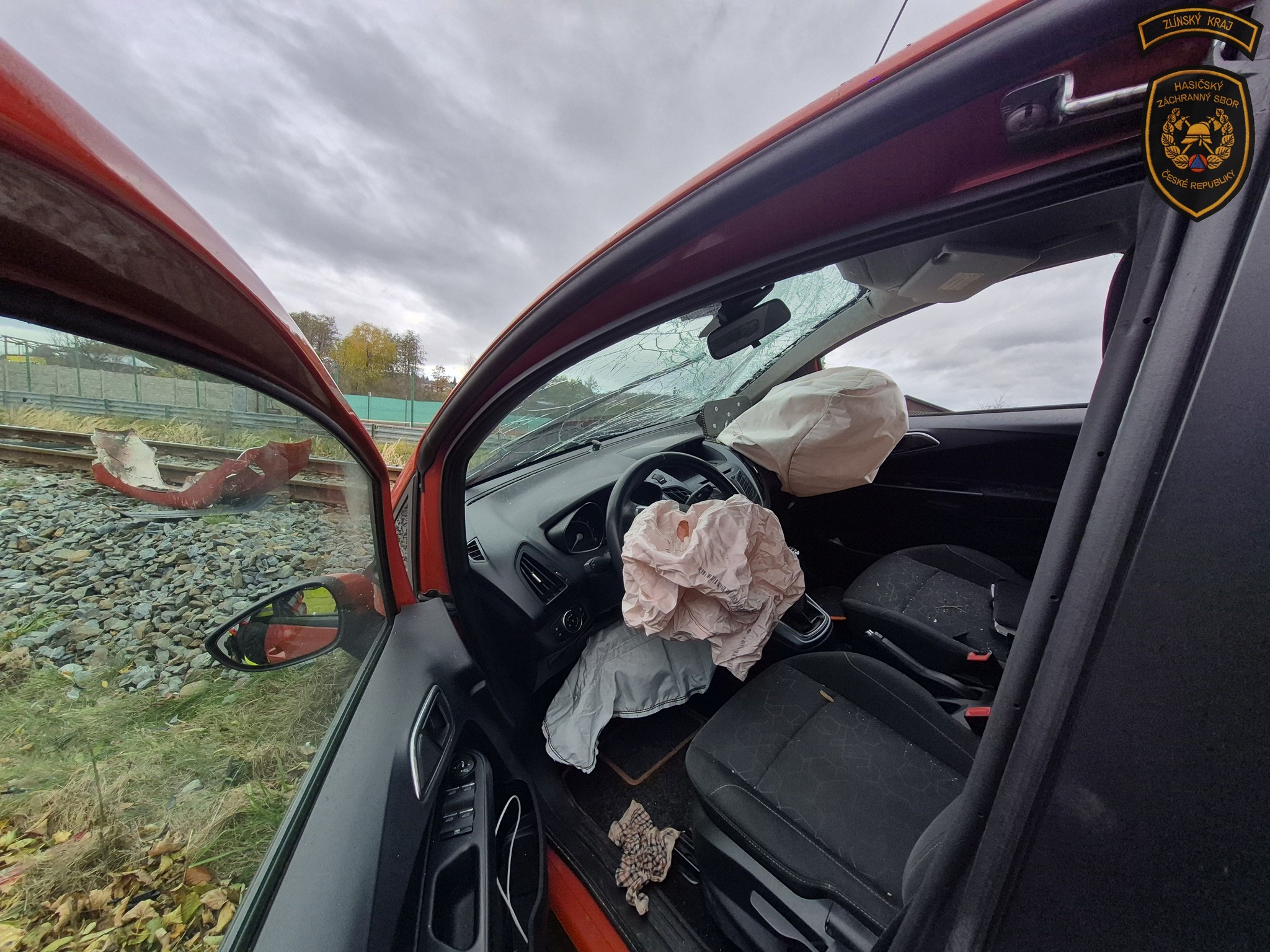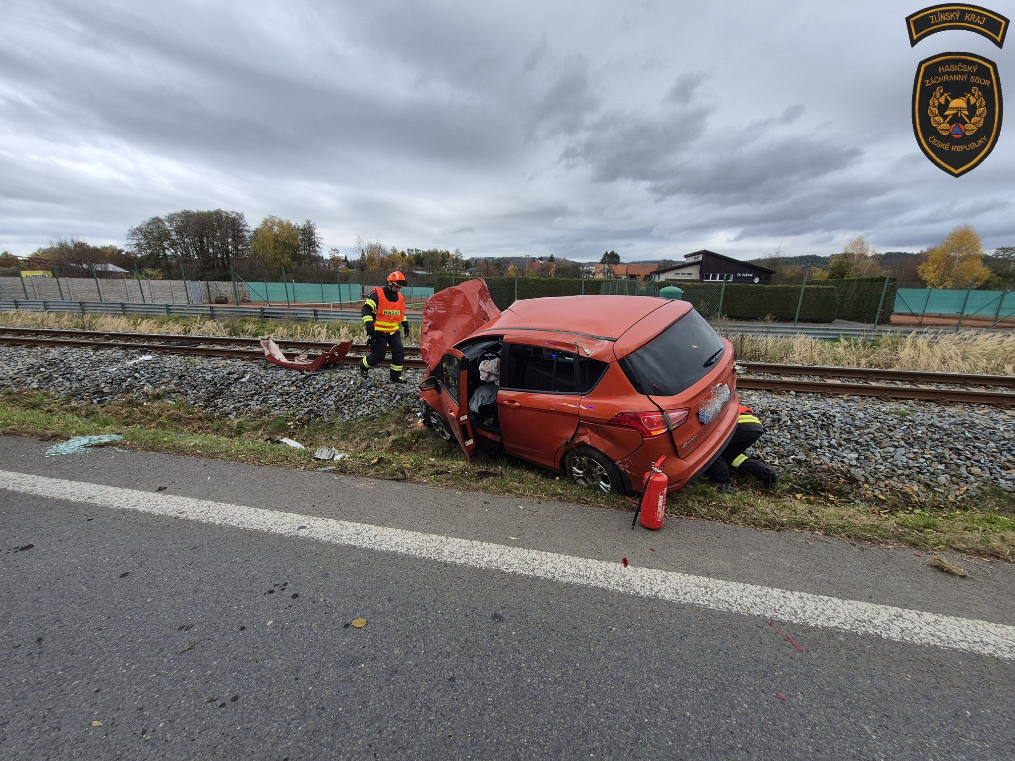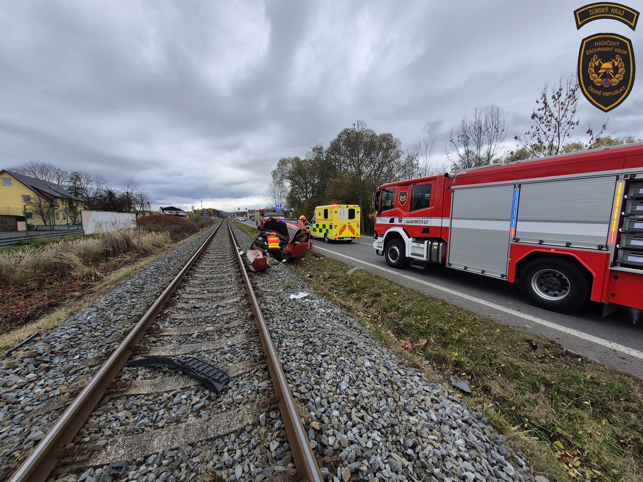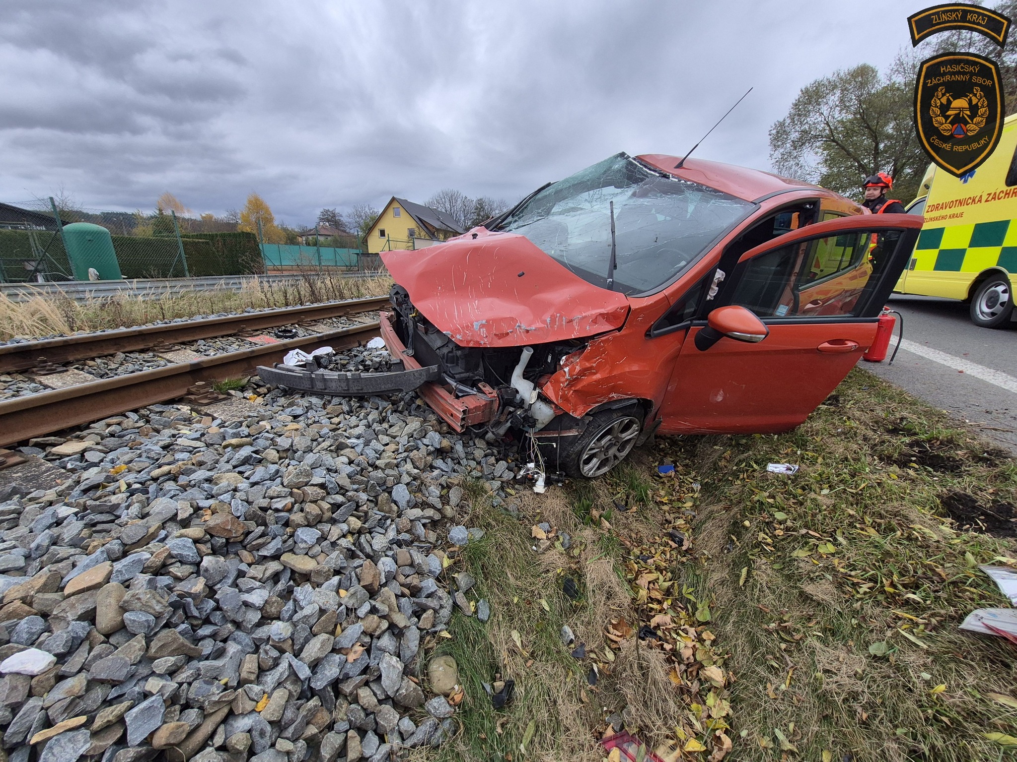 V Zašové havarovalo osobní vozidlo přímo u železniční trati. Foto: HZS ZK