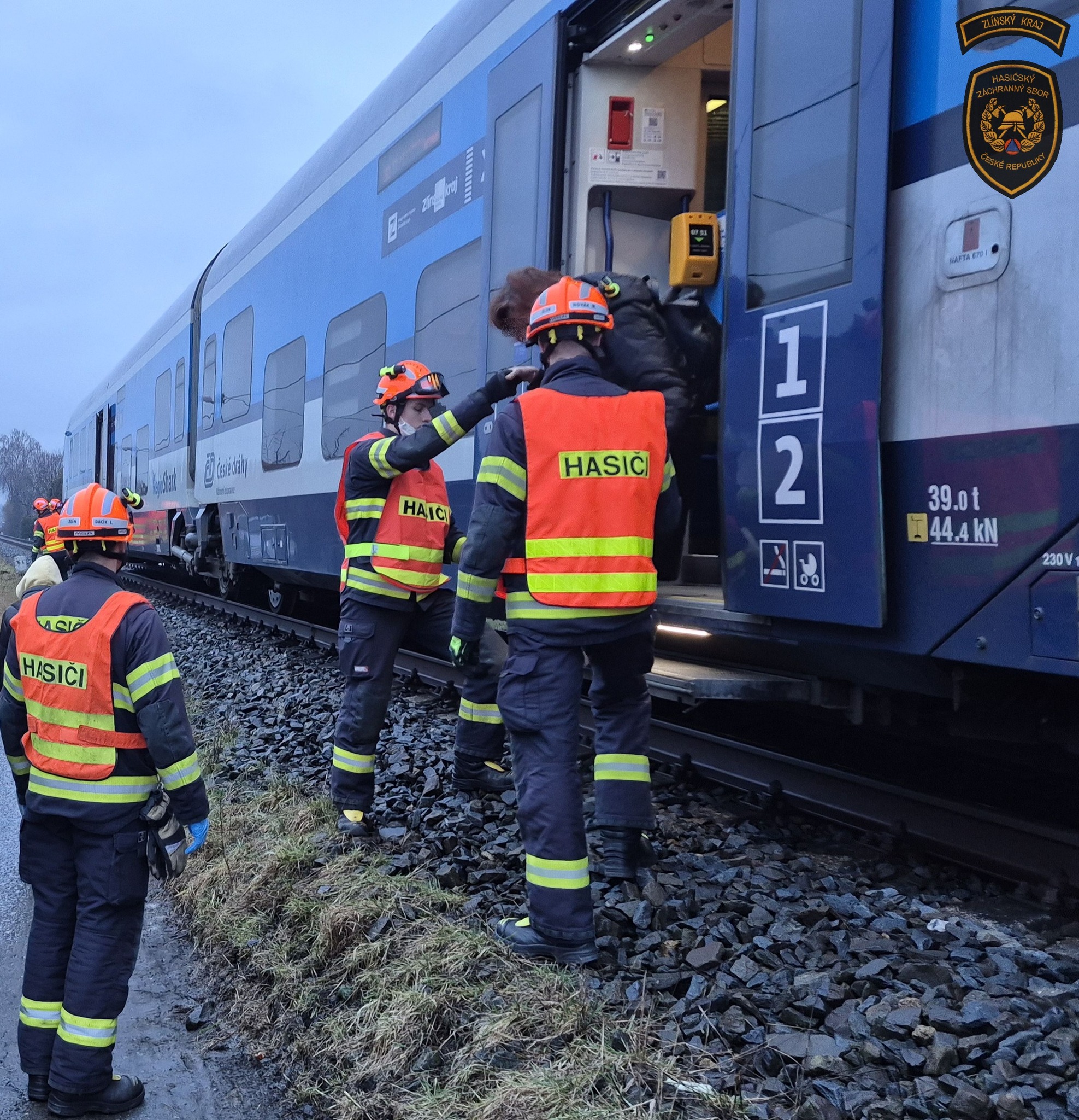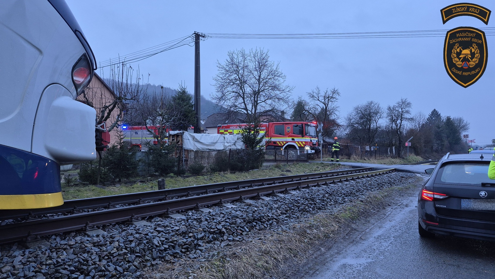 V Želechovicích nad Dřevnicí se dnes ráno srazilo auto s vlakem. Foto: HZS ZK