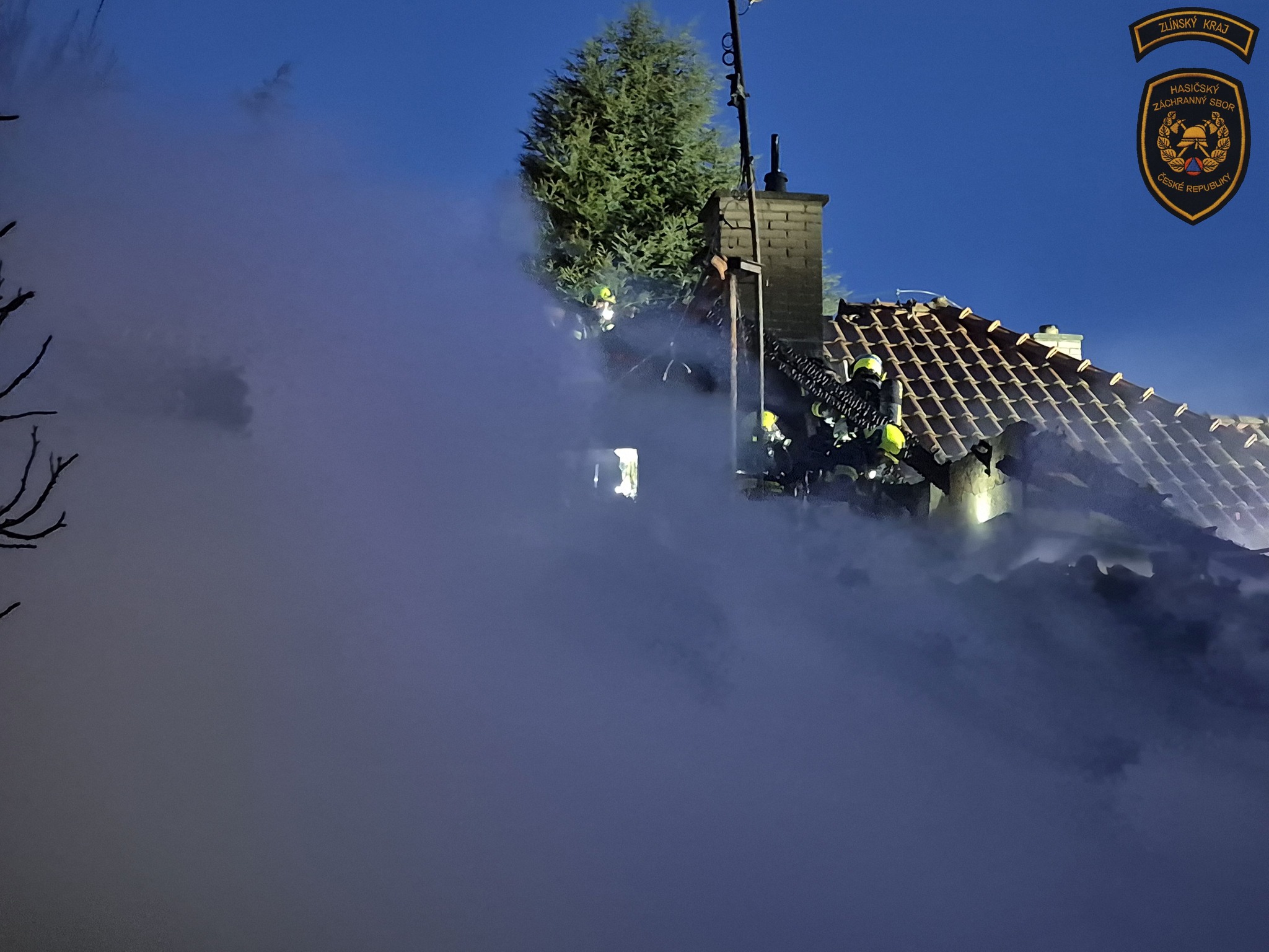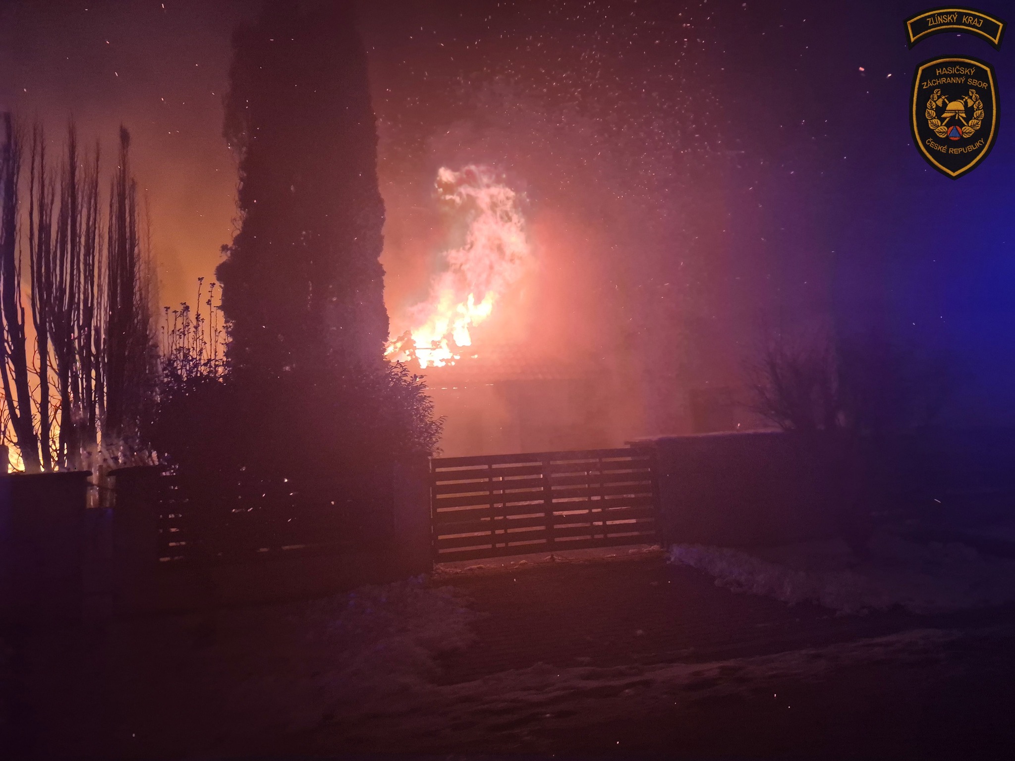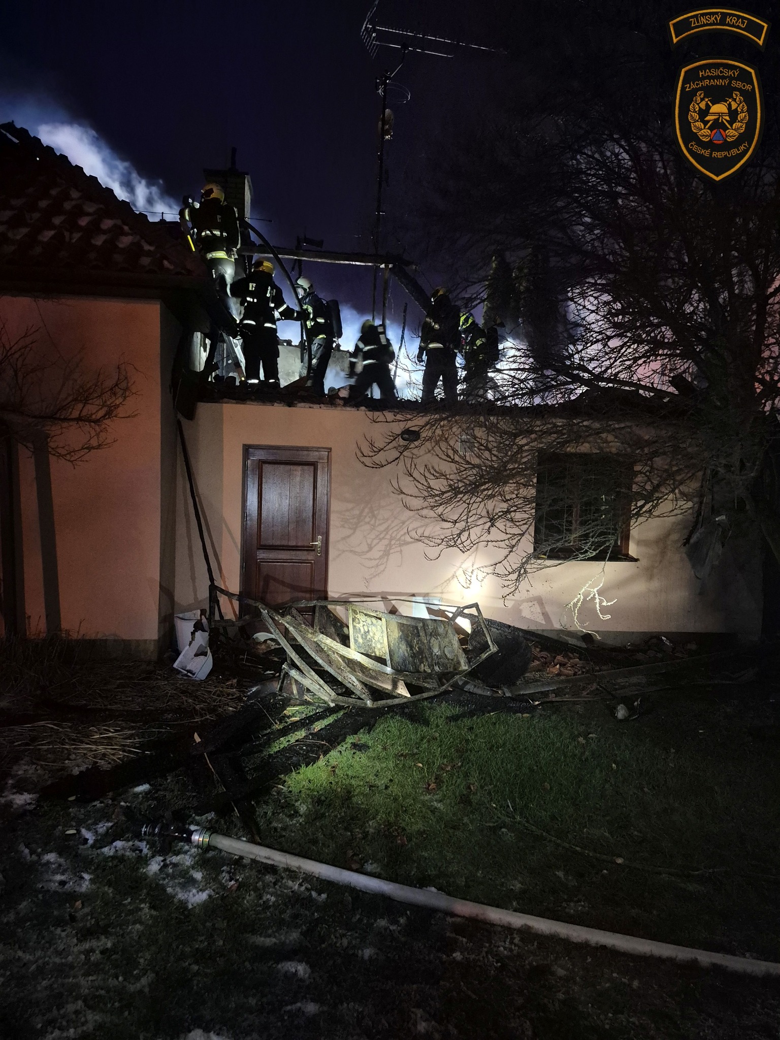 Hasiči likvidují rozsáhlý požár rodinného domu v Kroměříži. Foto: ZZS ZK