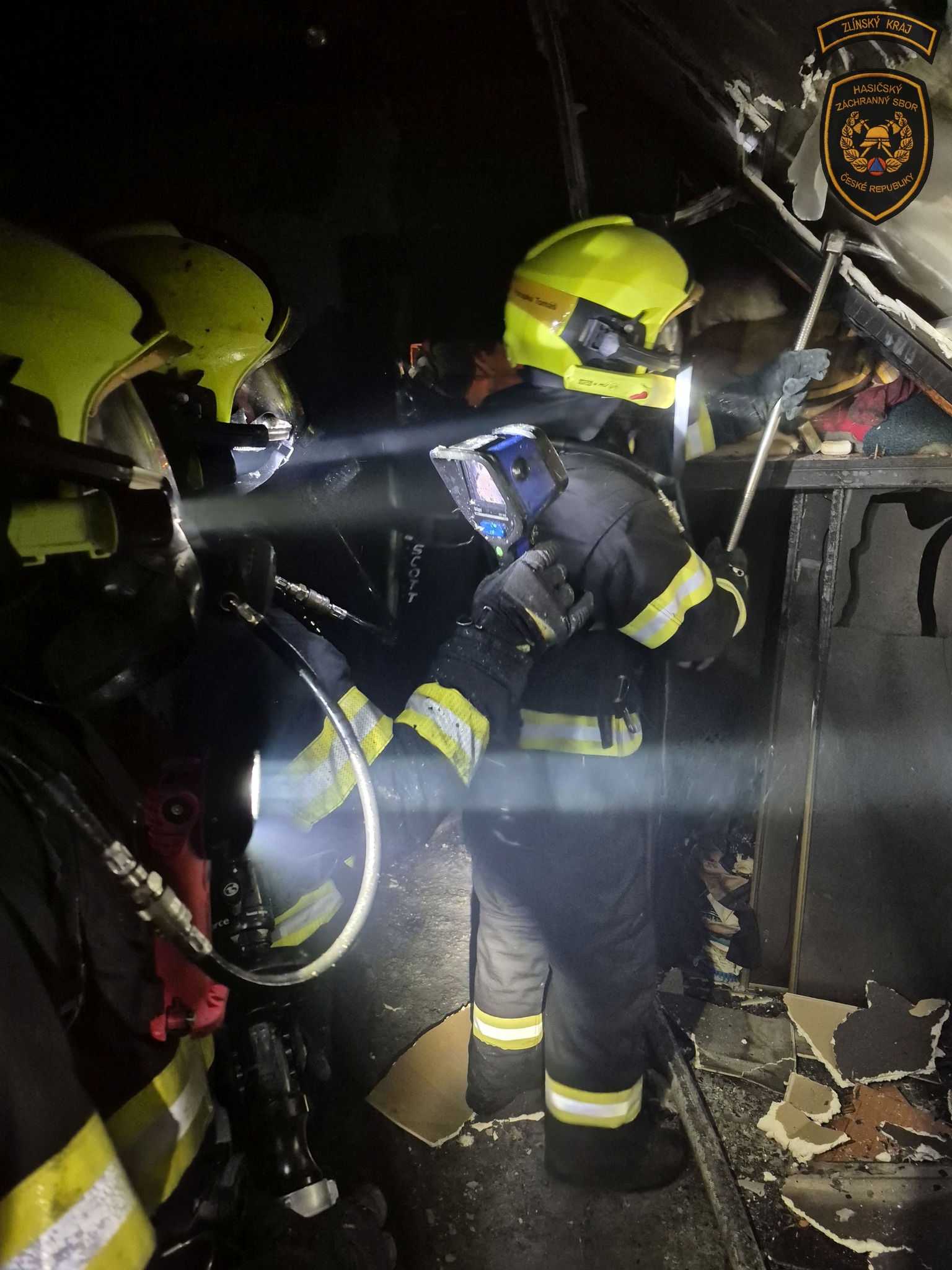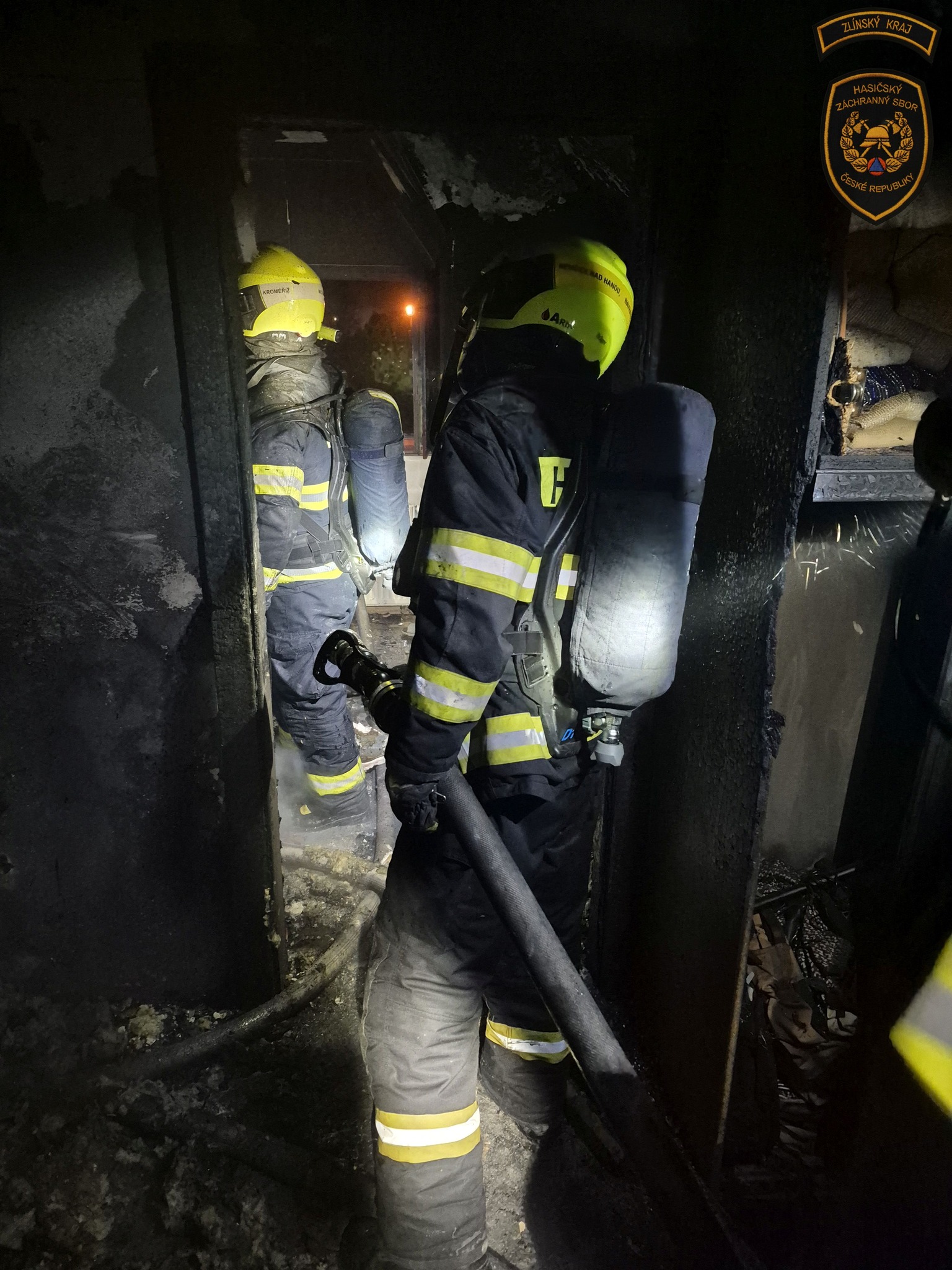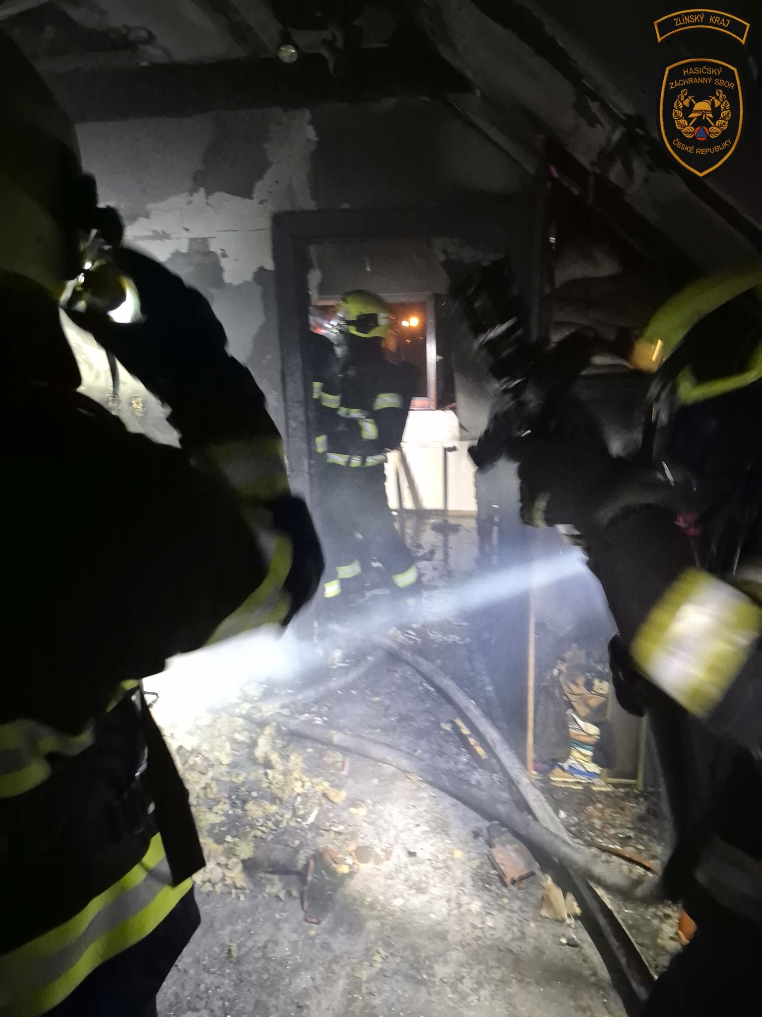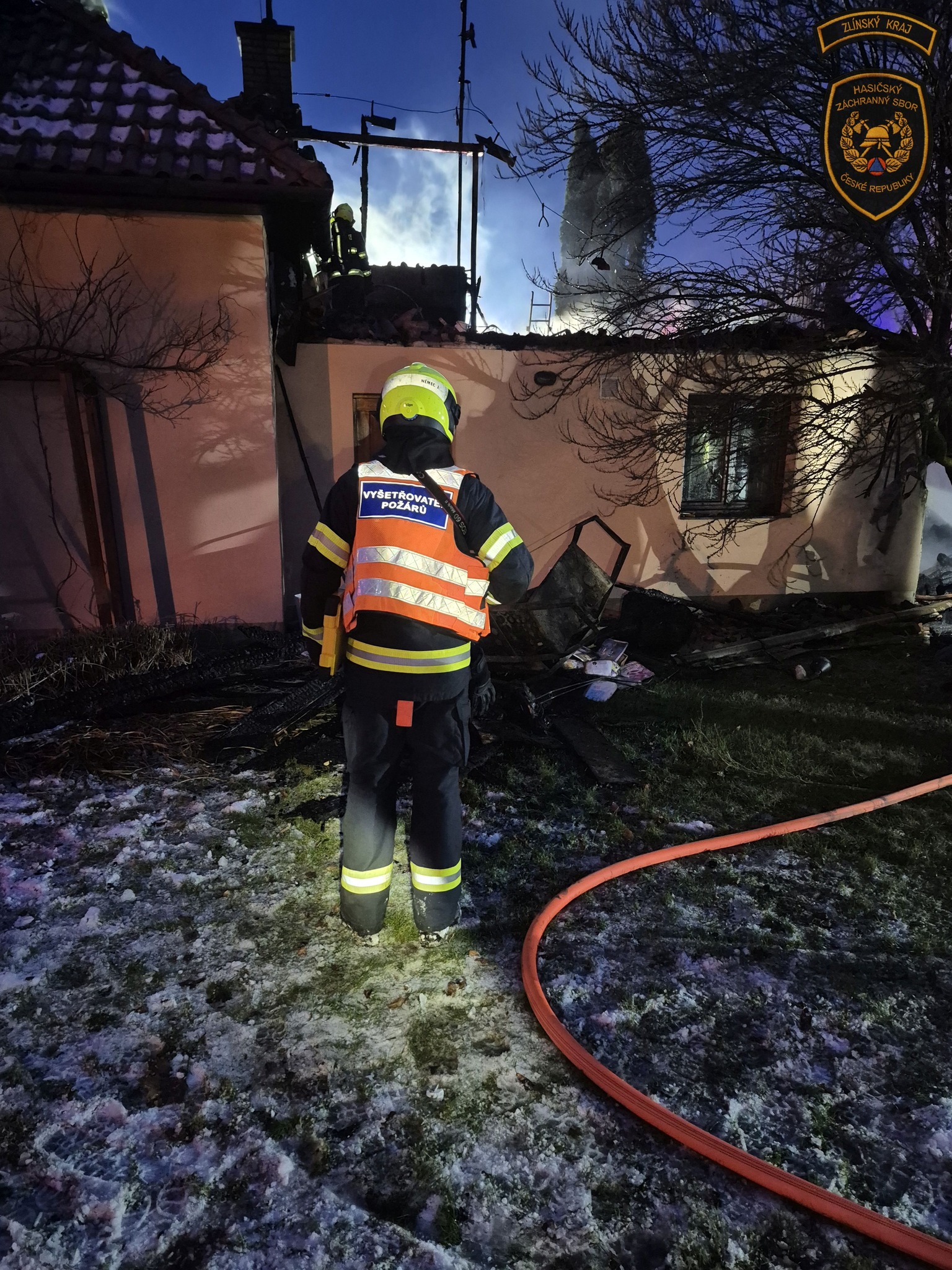 Hasiči likvidují rozsáhlý požár rodinného domu v Kroměříži. Foto: ZZS ZK