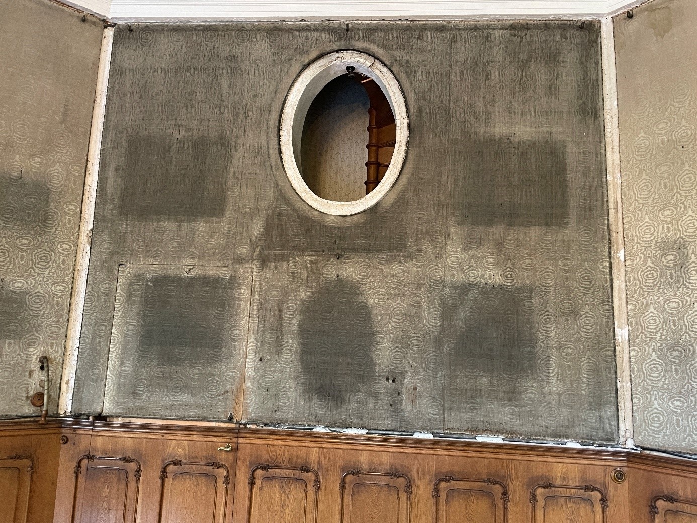 Původní tapety po deinstalaci obrazů, dřevěného obložení a obložení světlíku. Foto: Zoo Zlín
