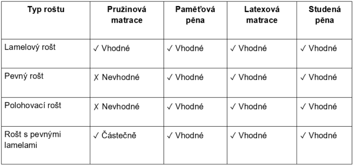 Pevný rošt vyžaduje pružnější matrace, které kompenzují tvrdý podklad. Ideální jsou matrace z paměťové pěny nebo latexové matrace.
