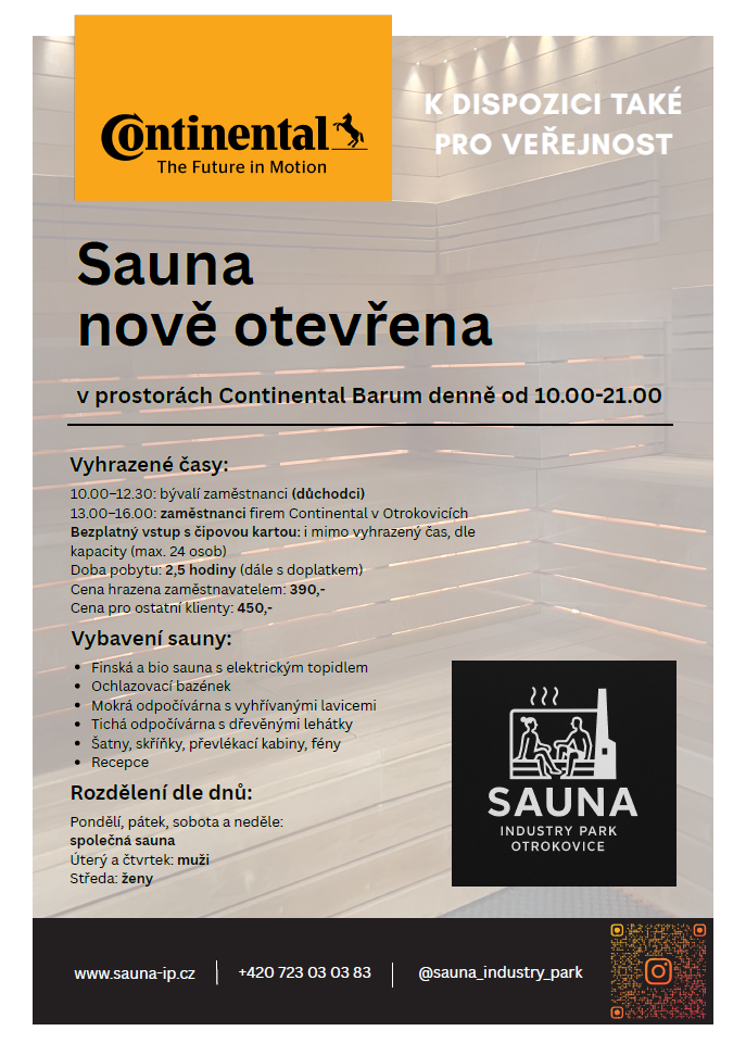Sauna Industry Park Otrokovice se nachází v areálu firmy Continental Barum. Více informací a možnost rezervace najdete na webových stránkách www.sauna-ip.cz nebo na telefonním čísle +420 723 03 03 83.