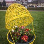 Travnatou plochu zdobí tři velká proutěná vejce osázená jarními květinami, jako jsou tulipány, hyacinty či narcisy. Květinový záhon kolem hodin pak doplňuje originální aranžmá s pomlázkami a barevnými kraslicemi.