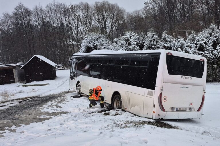 Jednotka za pomoci cisterny a vyprošťovací techniky autobus bezpečně vyprostila zpět na komunikaci.