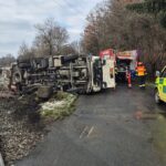 Auto převážející biologický materiál do kafilérie se po nárazu převrátilo na bok. Řidič nákladního vozidla zůstal po nárazu zaklíněn v kabině.